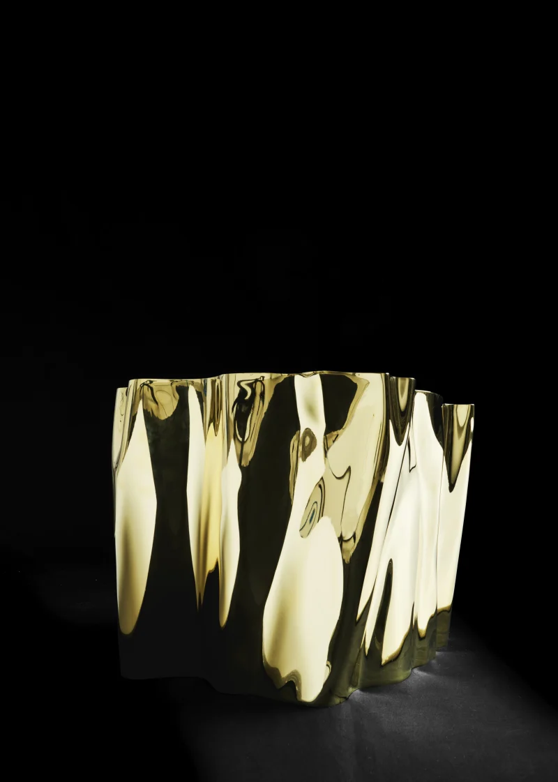 Its unique structure, with a vertical sheet metal wall that makes a unique and sculptural wave turn, evokes the idea of a continuous flow, as if the metal had been forged by a golden wind that gives unique shapes from time to time, shaping elegant and fluid curves.