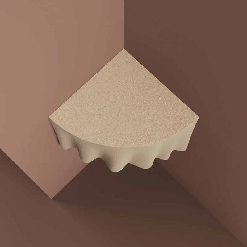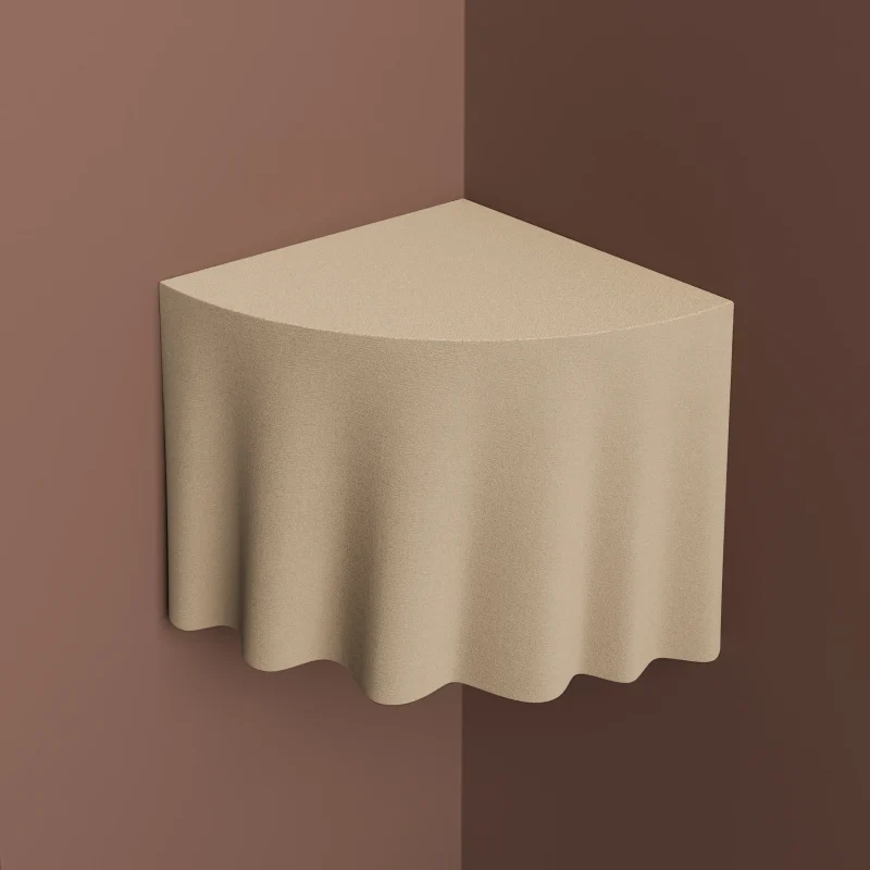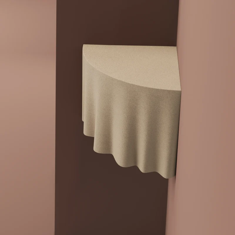 The wall-mounted corner table by T.Woon with Studio TOOJ, stands as a perfect embodiment of the designer’s passion for seamlessly blending illusions into her creations. Its outward appearance, resembling a soft fabric, conceals the fact that it is actually crafted from top-quality quartz sand. This intriguing concept, enhanced by intricate details, is made possible through Sandhelden’s innovative technique of 3D printing. This captivating piece will invite curiosity and fascination in any space.