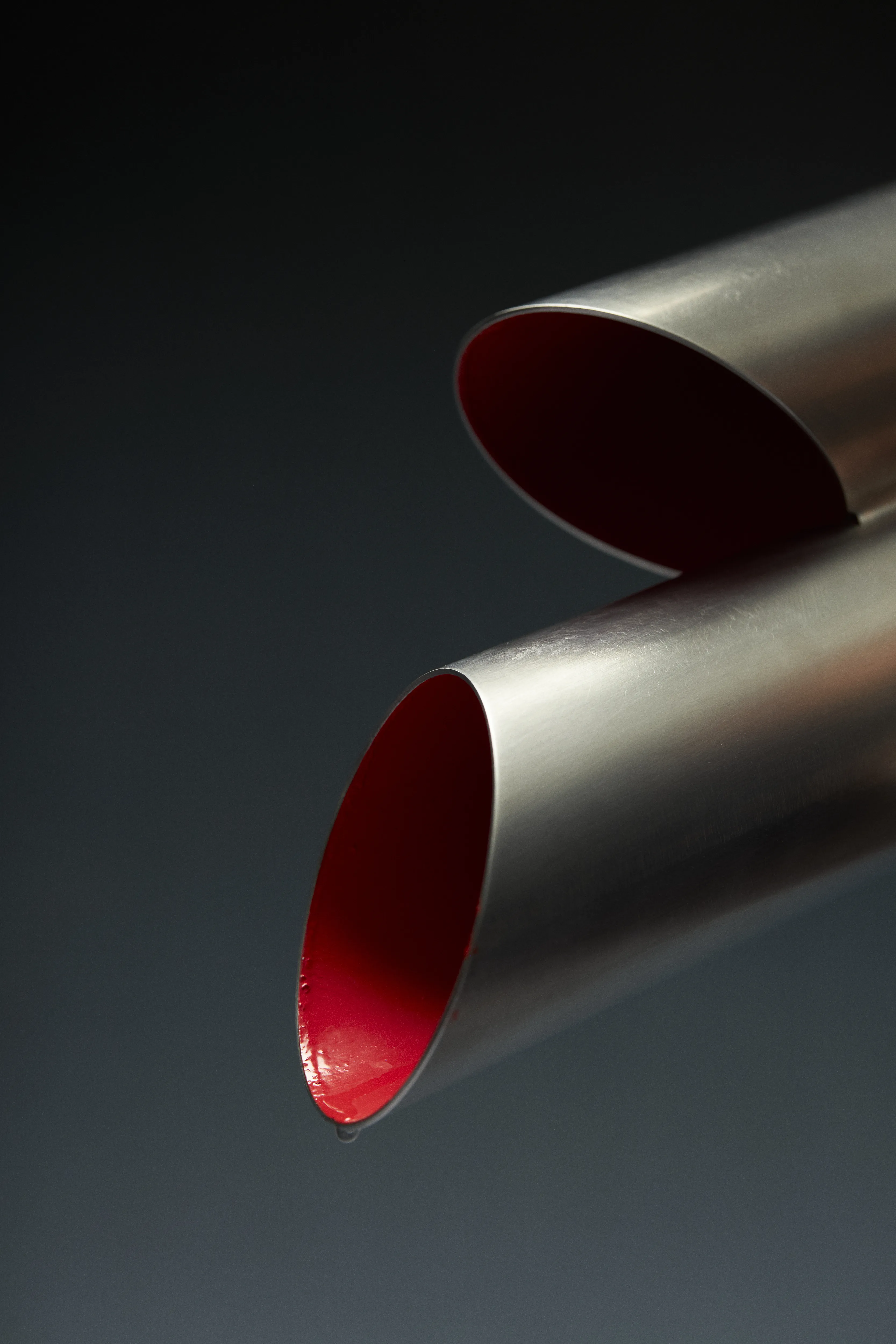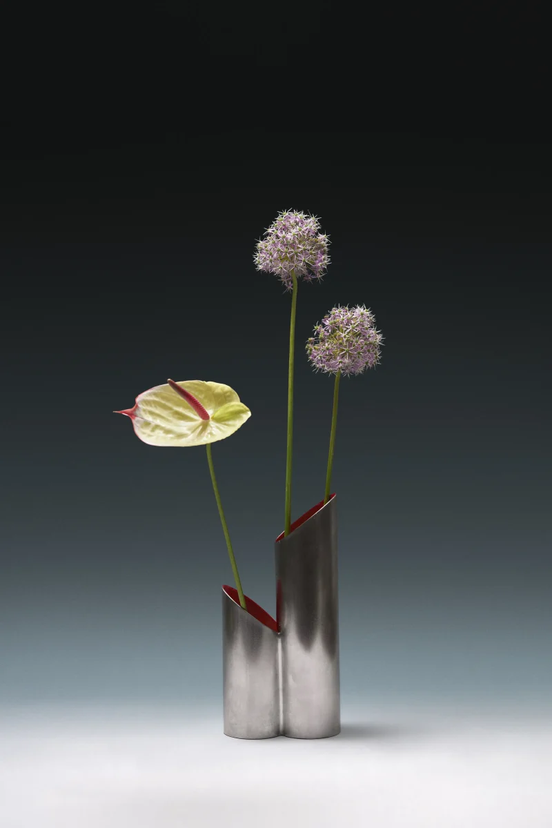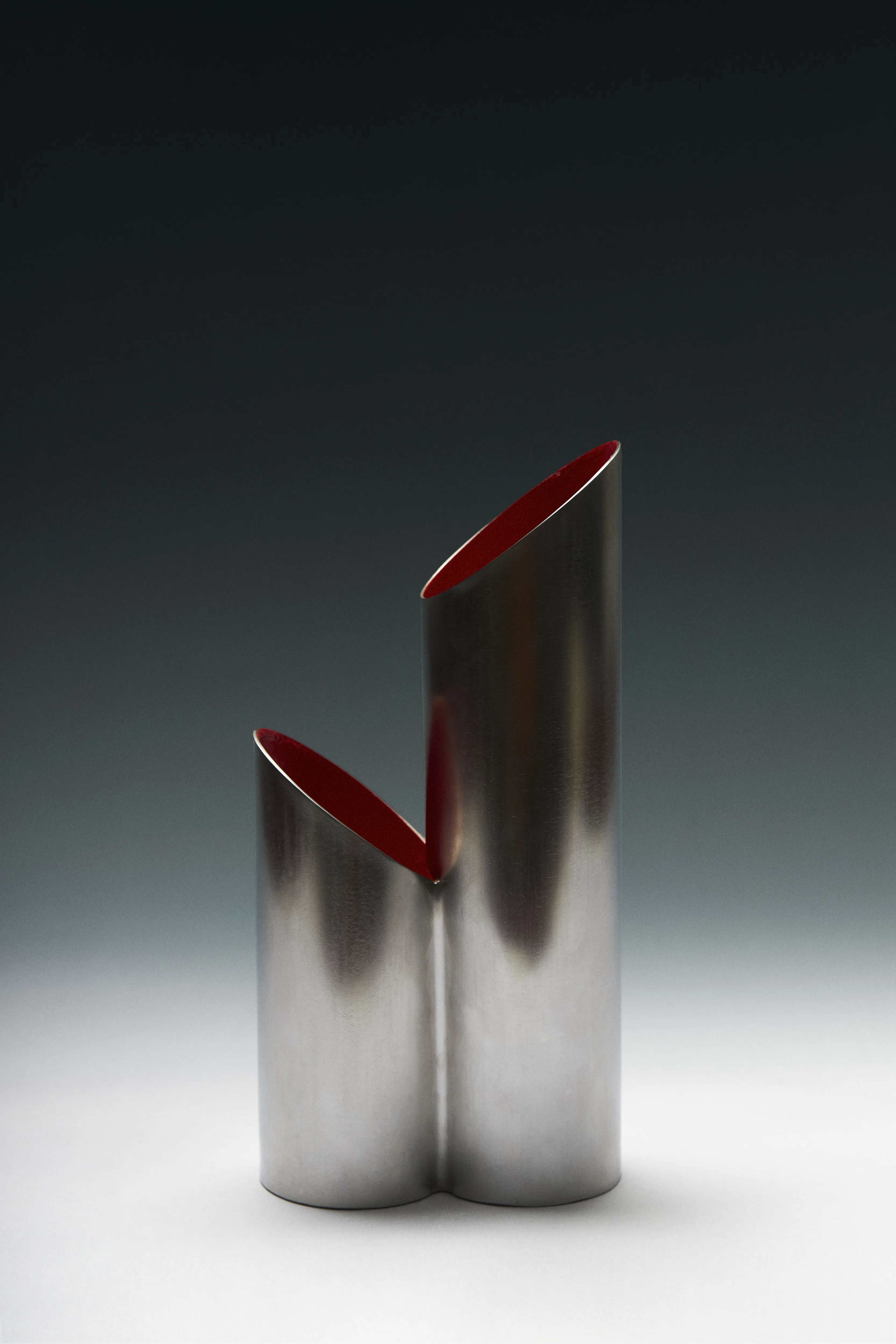 Two tubes, working together like communicating vessels. True to its name, it was created by due persone: Matteo Guida and me, Josh. It began as a tribute to the traditional porrón. Together with Ihintza Errekondo, we first made it in ceramic: the taller tube had a small lid with a pinhole that let out a thin stream of wine—usually all over you, until you learned how to use it. Later, we removed the lid to make room for flowers, and the porrón became a vase. Now it has taken shape in stainless steel, its interior finished in red—Matteo’s idea, because he says it adds a touch of Italian sensuality.