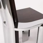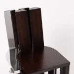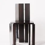 Inspired by a myriad of indulgent nights, this chair is meant to share the feeling and effect of “double vision,” the phenomenon of perceiving two images, usually overlapping, as one holistic object. Double vision is often the result of impaired function of the extraocular muscles, in which both eyes are still functional, but cannot target the desired object. In this series, the objects simultaneously pull apart and come together. These new adaptations integrate reflective and patinated materials against the rich browns of American walnut. The new, curvilinear elements render the chrome-plated chair even more disorienting, while the verdigris chair suggests the chrome’s eventual decay.