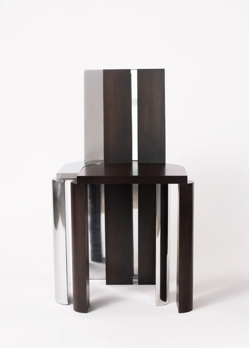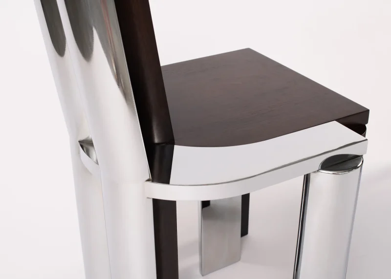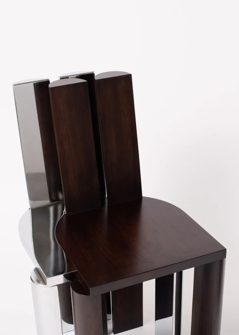 Inspired by a myriad of indulgent nights, this chair is meant to share the feeling and effect of “double vision,” the phenomenon of perceiving two images, usually overlapping, as one holistic object. Double vision is often the result of impaired function of the extraocular muscles, in which both eyes are still functional, but cannot target the desired object. In this series, the objects simultaneously pull apart and come together. These new adaptations integrate reflective and patinated materials against the rich browns of American walnut. The new, curvilinear elements render the chrome-plated chair even more disorienting, while the verdigris chair suggests the chrome’s eventual decay.