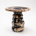 In the striking design of the ‘Dwayne Johnson’ side table, the Australian and Swedish design duo, Odditi, infuses natural yet bold elements into their signature style. Inspired by a lifelong fascination with stacking rocks, this totem-like table showcases hand-sculpted, organic-shaped petrified wood forms adorned with a striking raw petrified wood slice. Crafted from fossilized trees transformed into stone over hundreds of millions of years through an underground mineralization process, this rare material features vibrant colors and motifs shaped by semi-precious minerals like quartz, chalcedony, and jasper. Each meticulously hand-sculptured ‘Dwayne Johnson’ side table celebrates the intriguing variations in natural materials and forms shaped during the artisanal process.
