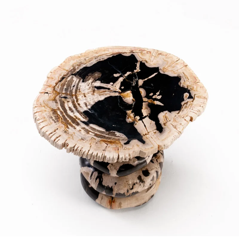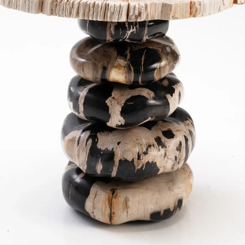 In the striking design of the ‘Dwayne Johnson’ side table, the Australian and Swedish design duo, Odditi, infuses natural yet bold elements into their signature style. Inspired by a lifelong fascination with stacking rocks, this totem-like table showcases hand-sculpted, organic-shaped petrified wood forms adorned with a striking raw petrified wood slice. Crafted from fossilized trees transformed into stone over hundreds of millions of years through an underground mineralization process, this rare material features vibrant colors and motifs shaped by semi-precious minerals like quartz, chalcedony, and jasper. Each meticulously hand-sculptured ‘Dwayne Johnson’ side table celebrates the intriguing variations in natural materials and forms shaped during the artisanal process.