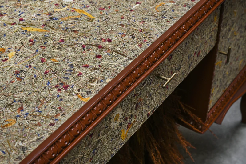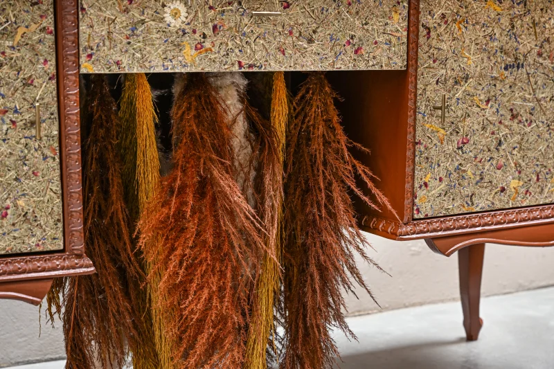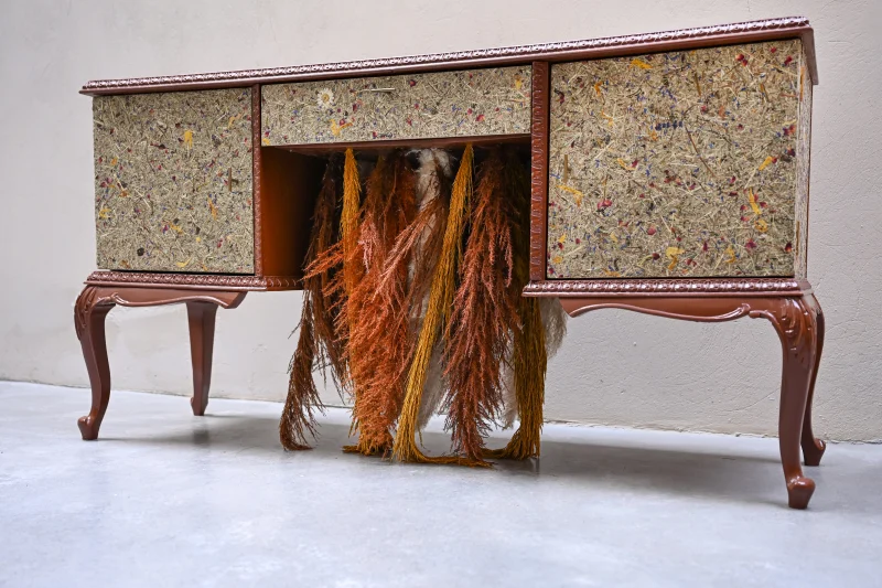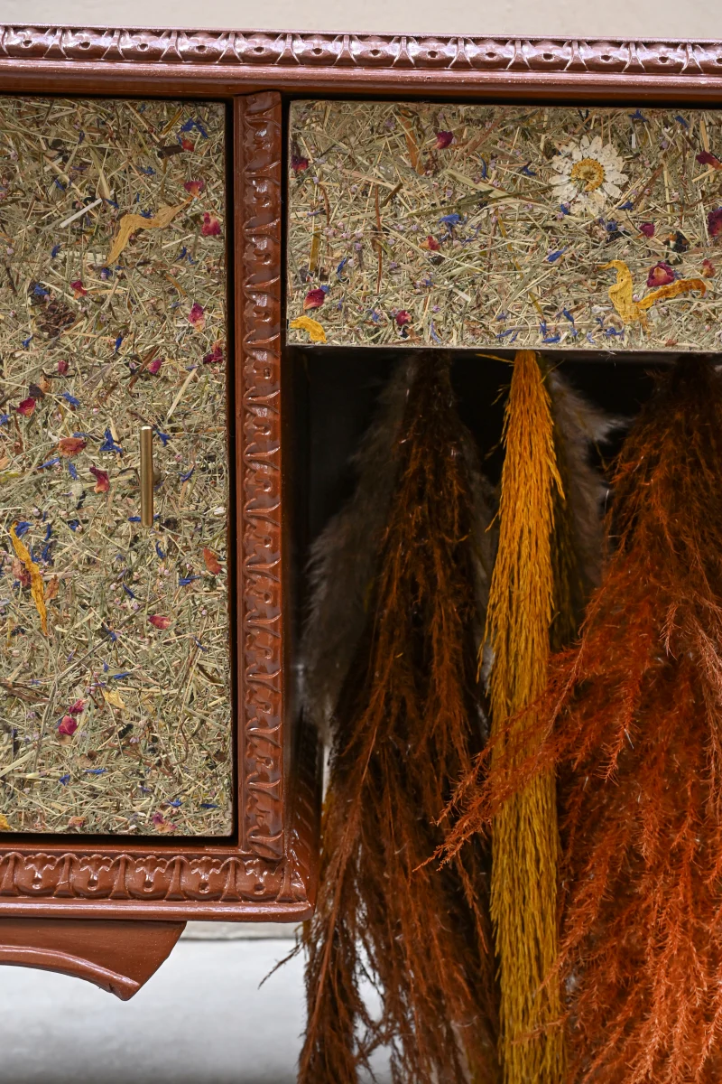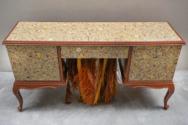 The idea for the Earth Furniture desk or console originated from the human need to reconnect with nature and find ways to incorporate this connection into design. This inspiration led to the creation of furniture pieces using recycled materials and natural elements. By recycling old furniture, its memories, history, and design are preserved. This process not only helps the environment but also breathes new life into the pieces through contemporary art and design. A wooden shelf was placed at the center to hold dried flowers, which are native to Greece, adding movement and liveliness to the design. The earthy color palette reflects the land where humans coexist with nature.