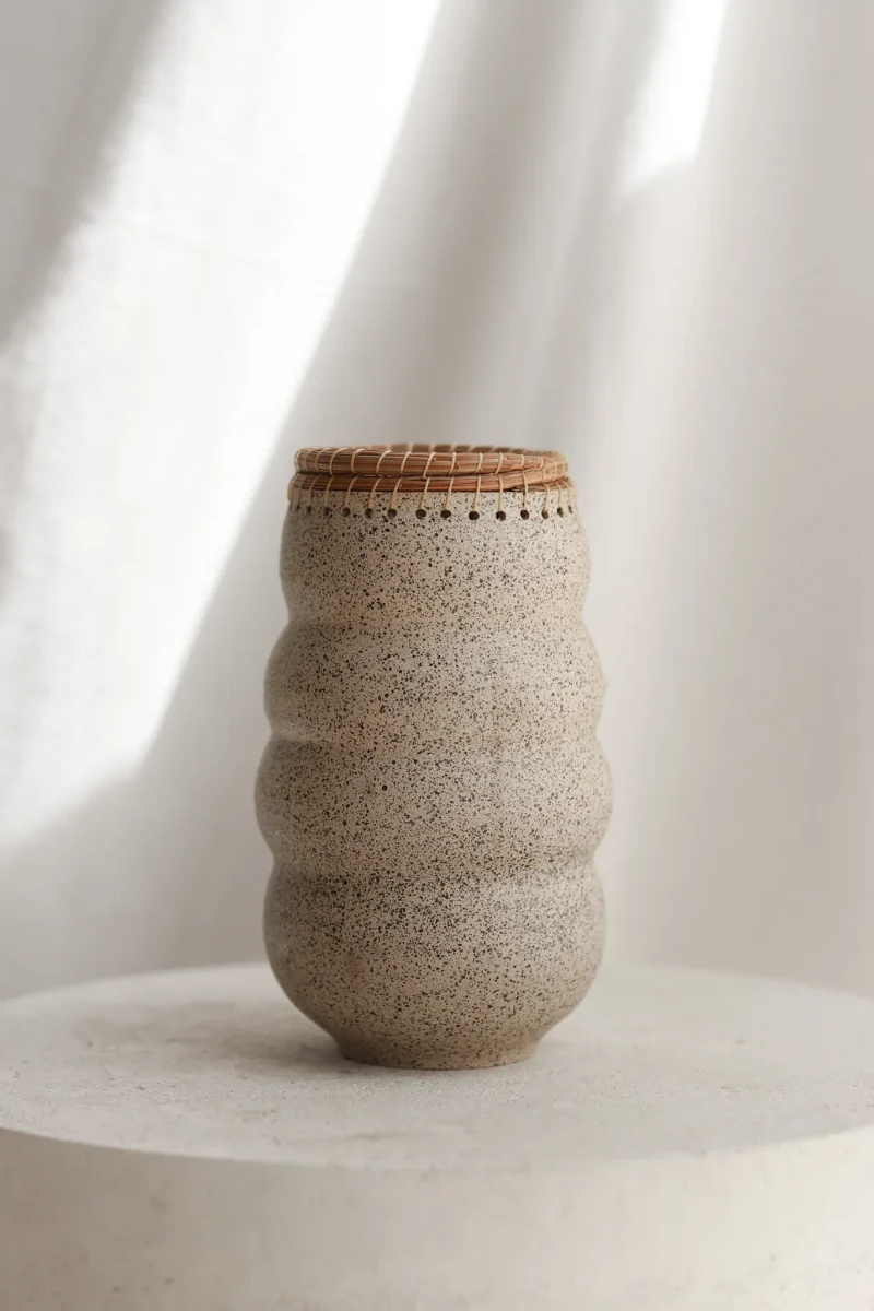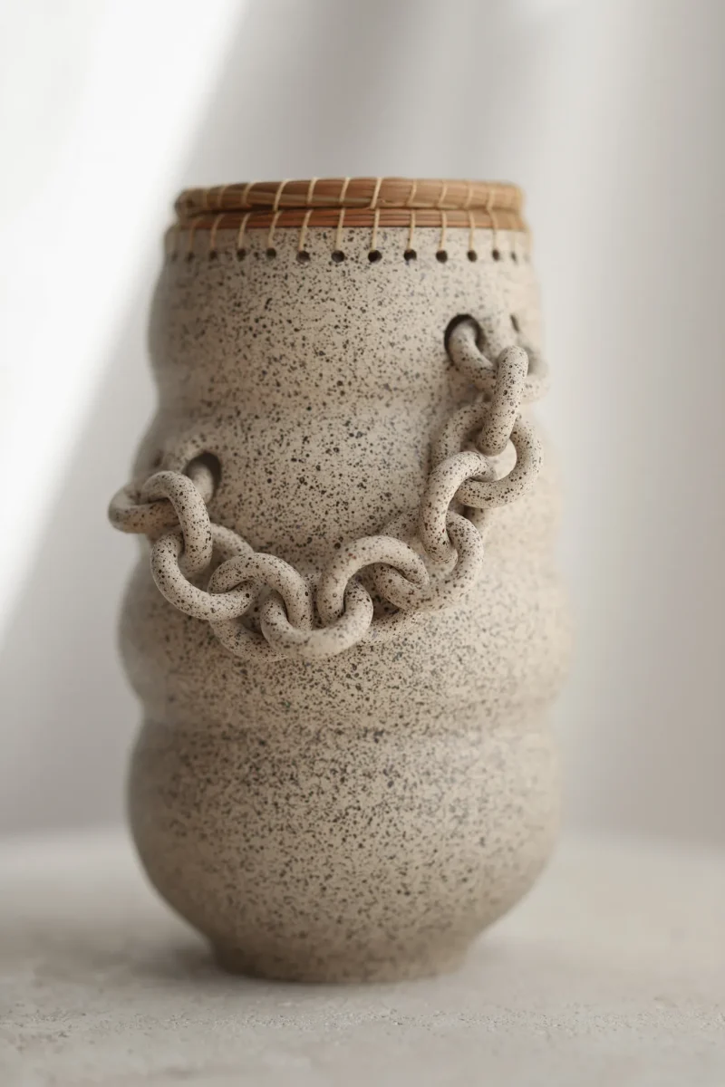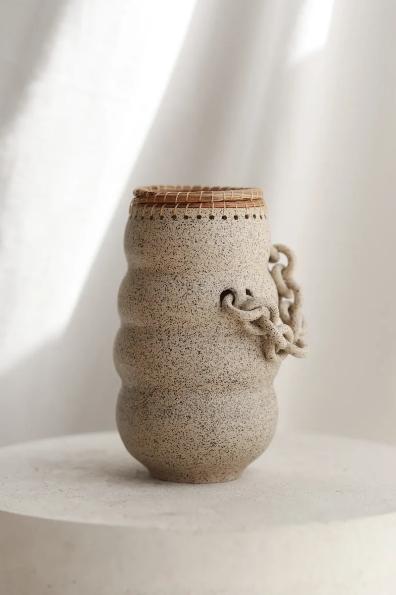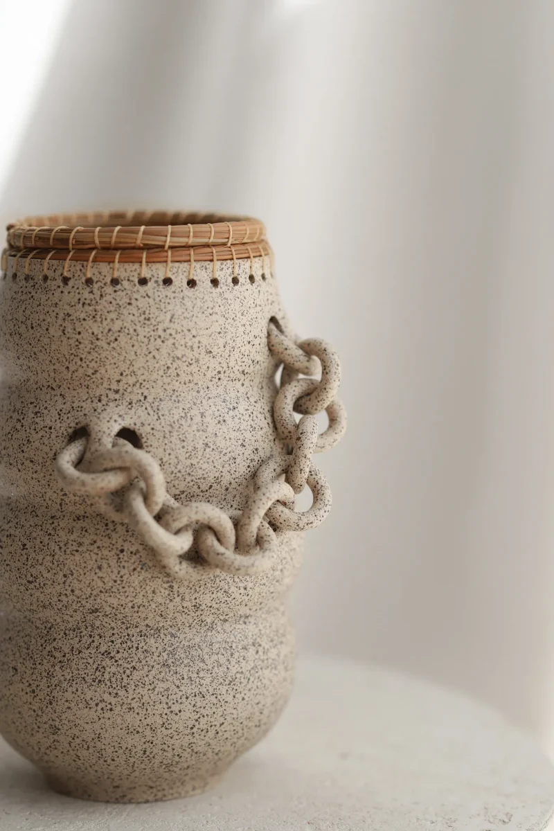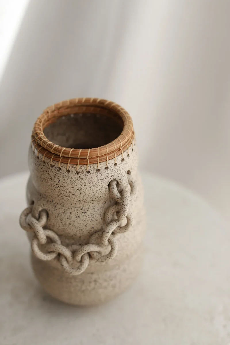Hand-thrown curvy ceramic and pine needle vase with a black speckled texture on a cream finish. This piece has gone through the creative process of being hand thrown, hand-sculpted, trimmed, fired in a kiln, glazed, fired in a kiln once more, and the pine needle is woven by hand. The chains are crafted by hand and sealed for added protection. Due to the nature of handmade ceramics, each piece is unique and there may be small imperfections.