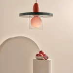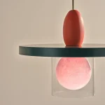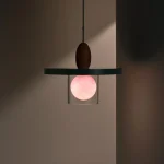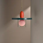 The pendant light Eirene consists of a cylindrical transparent glass, behind which a pink-pigmented glass sphere encloses the light body. Above it is a petrol-coloured lacquered wood and an orange-painted ceramic part. A suspension tube made of sturdy iron, coloured in gold-silver, holds the lamp stable and securely, with the length of the suspension being adjustable. The pendant lamp Eirene was handcrafted, making each piece a unique item. Due to this individual manufacturing, the lamps may vary in material and surface from the model shown in the photos.