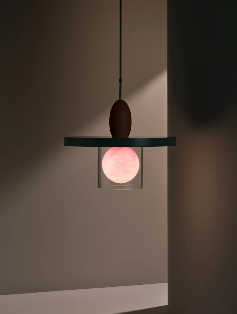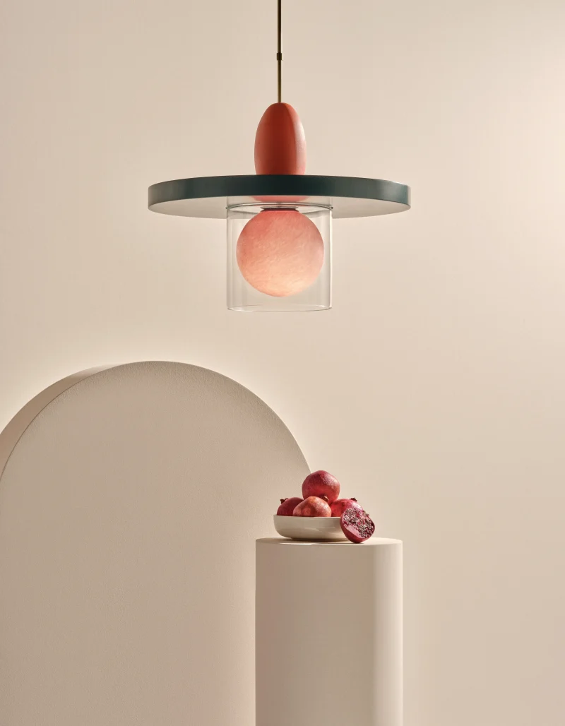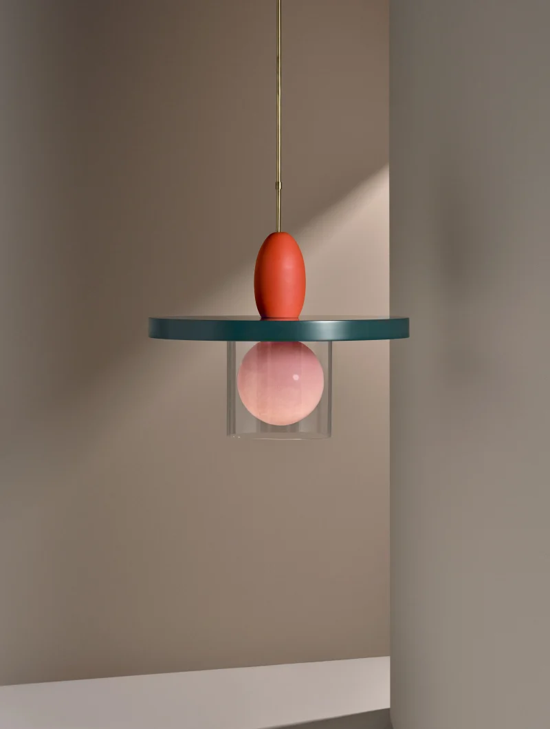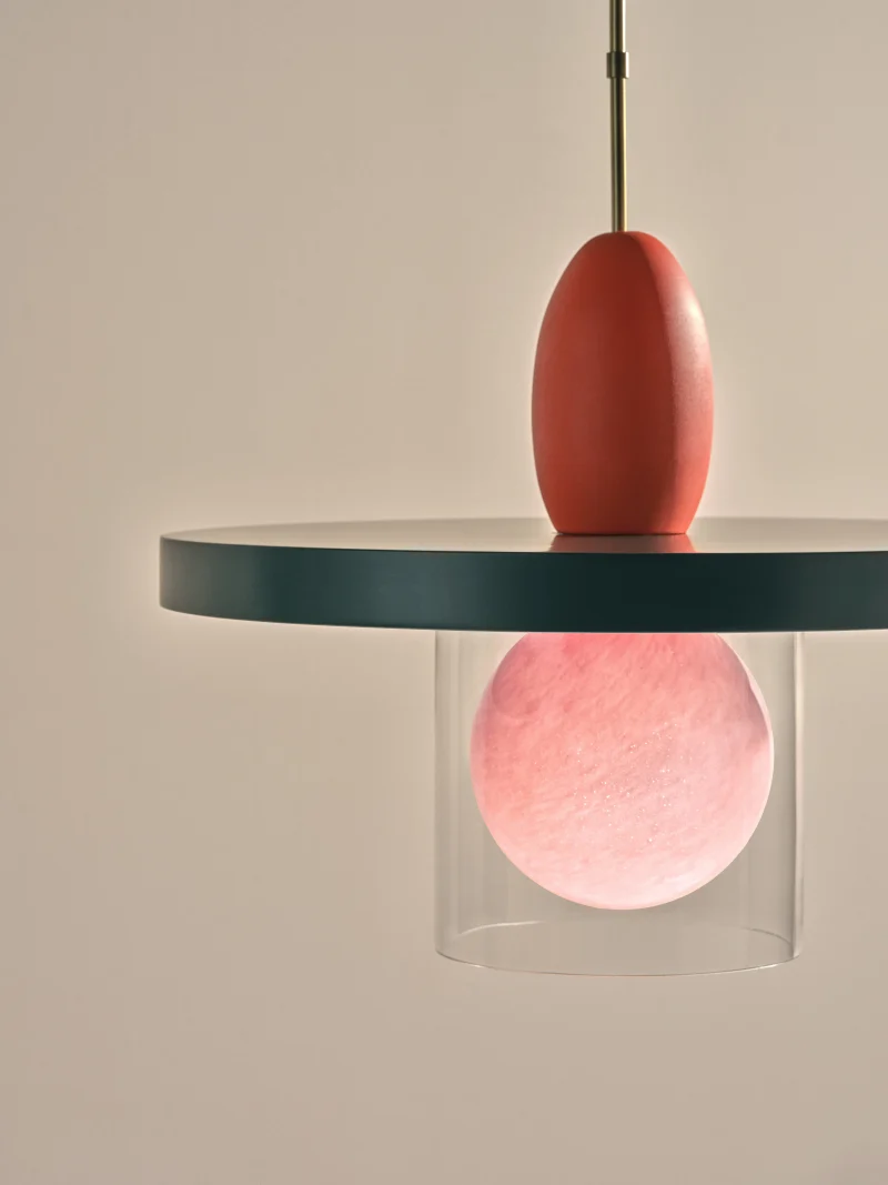 The pendant light Eirene consists of a cylindrical transparent glass, behind which a pink-pigmented glass sphere encloses the light body. Above it is a petrol-coloured lacquered wood and an orange-painted ceramic part. A suspension tube made of sturdy iron, coloured in gold-silver, holds the lamp stable and securely, with the length of the suspension being adjustable. The pendant lamp Eirene was handcrafted, making each piece a unique item. Due to this individual manufacturing, the lamps may vary in material and surface from the model shown in the photos.