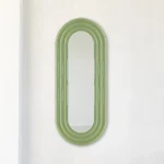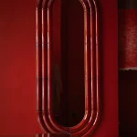 In the new mirrors collection, Pani Jurek explores ceramics and the reflective potential of mirror surfaces. Inspired by the ripple effect on water, the sculptural frames mimic the expanding circles that appear after a splash. The ceramic elements are airbrushed glazed by hand, which gives them a unique, artisanal character. The name “ELO” is a playful nod to Polish slang for “hello,” referring to the greeting between you and your reflection in the mirror.