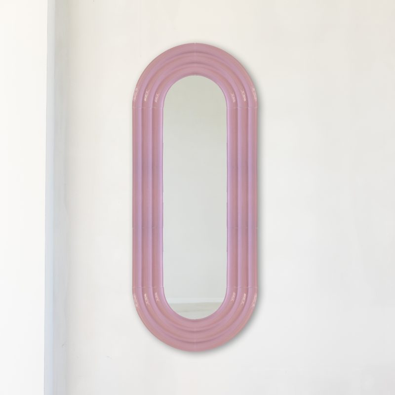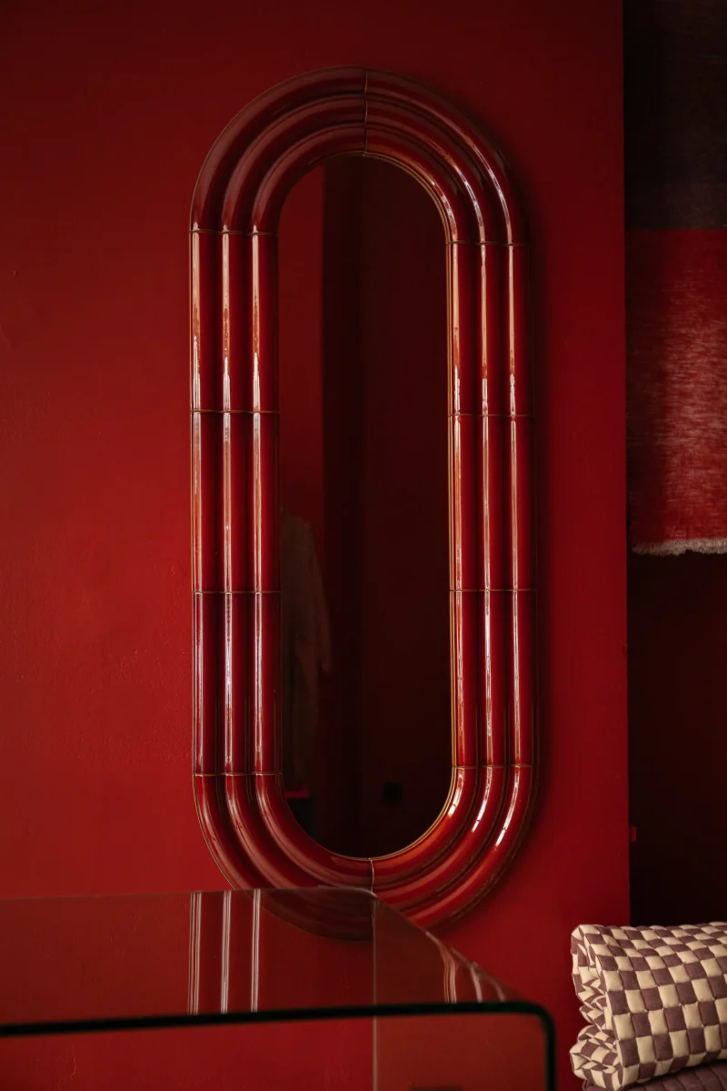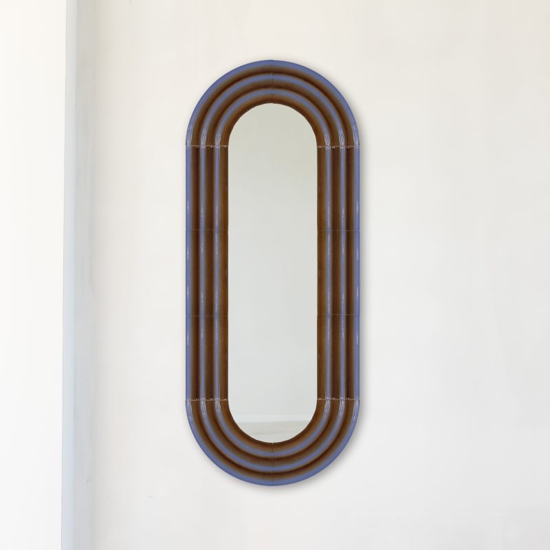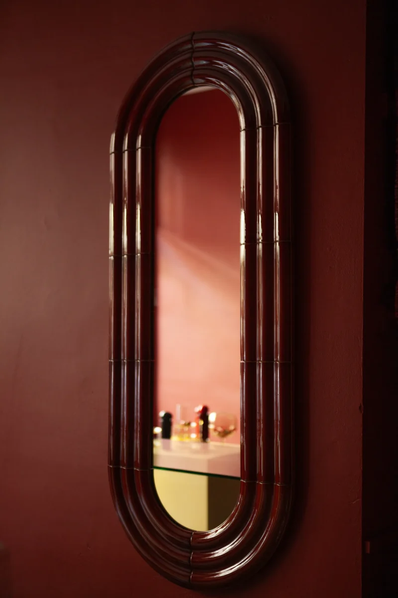 In the new mirrors collection, Pani Jurek explores ceramics and the reflective potential of mirror surfaces. Inspired by the ripple effect on water, the sculptural frames mimic the expanding circles that appear after a splash. The ceramic elements are airbrushed glazed by hand, which gives them a unique, artisanal character. The name “ELO” is a playful nod to Polish slang for “hello,” referring to the greeting between you and your reflection in the mirror.