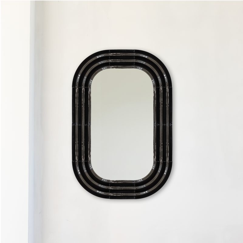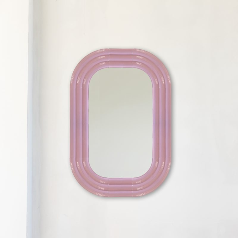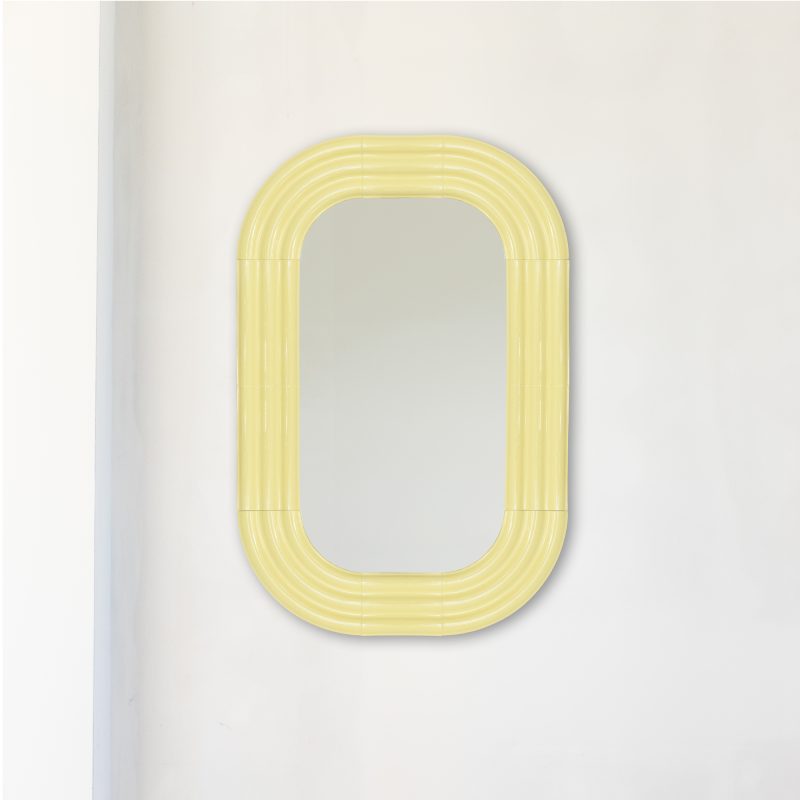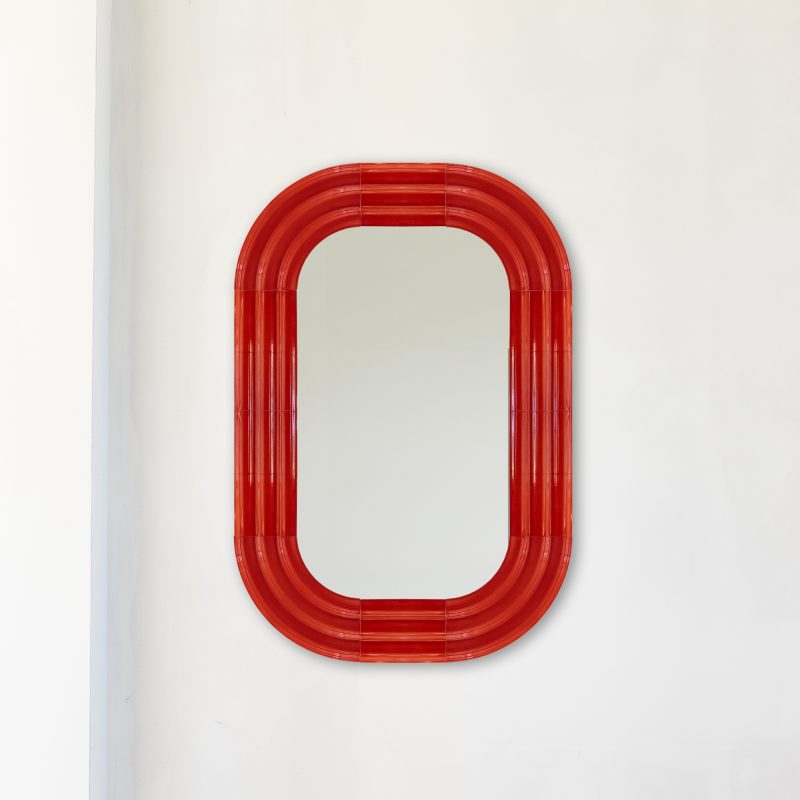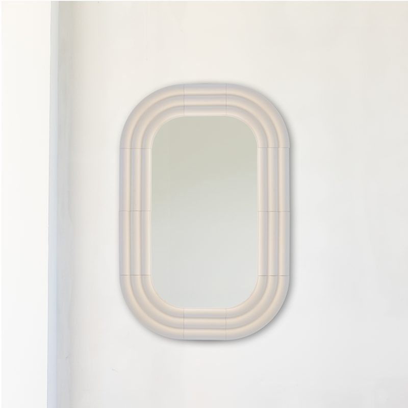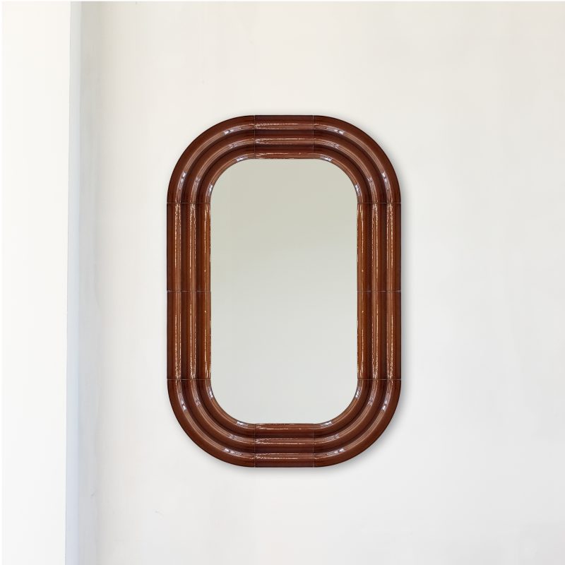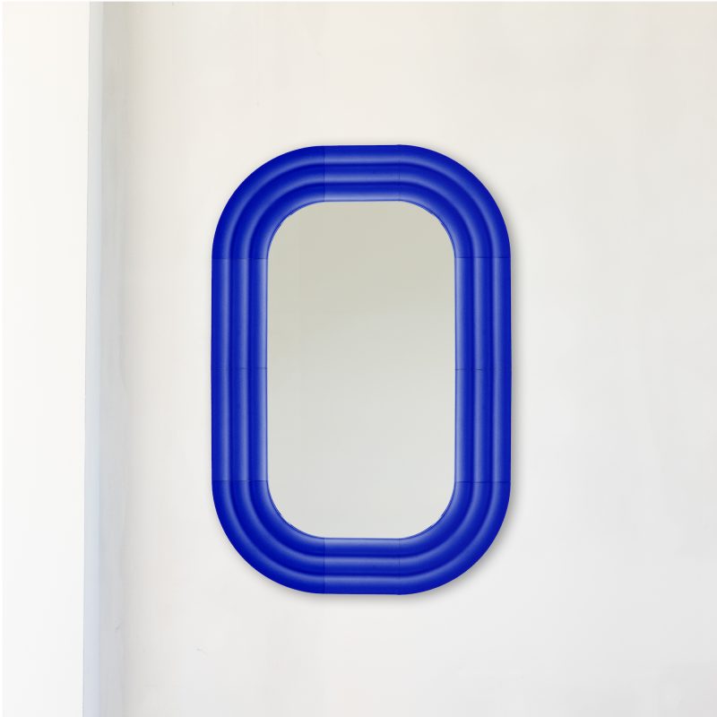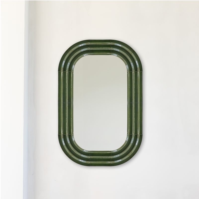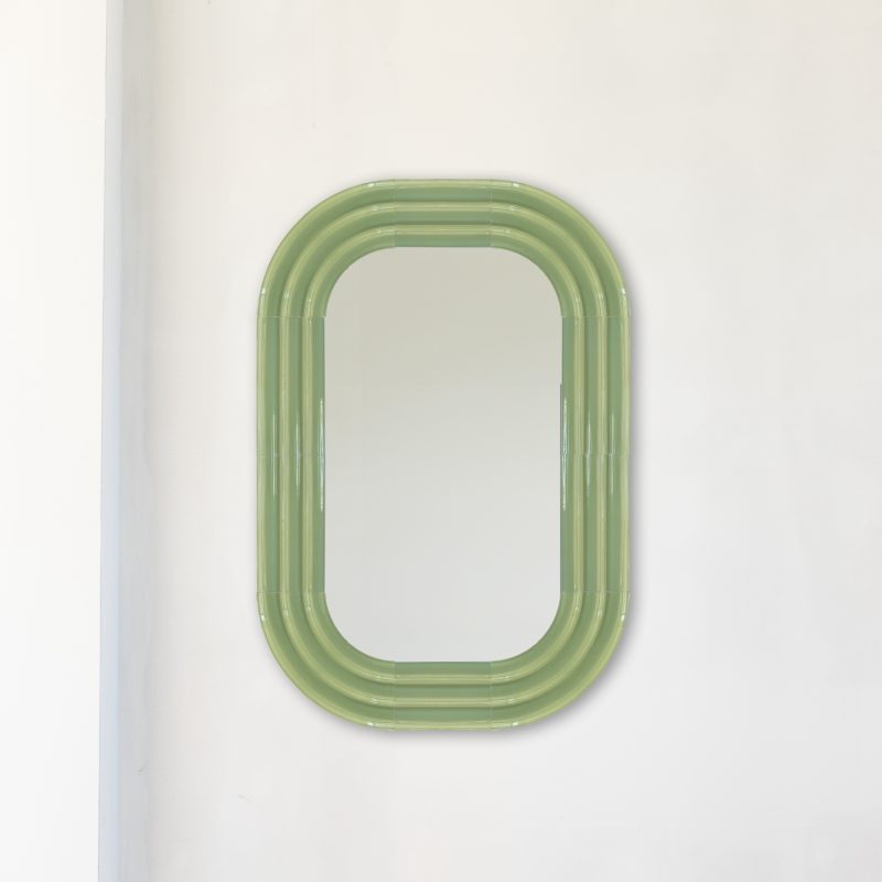 In the new mirrors collection, Pani Jurek explores ceramics and the reflective potential of mirror surfaces. Inspired by the ripple effect on water, the sculptural frames mimic the expanding circles that appear after a splash. The ceramic elements are airbrushed glazed by hand, which gives them a unique, artisanal character. The name “ELO” is a playful nod to Polish slang for “hello,” referring to the greeting between you and your reflection in the mirror.