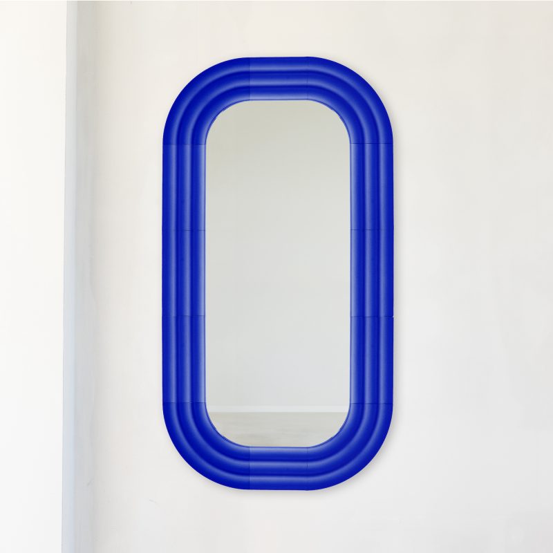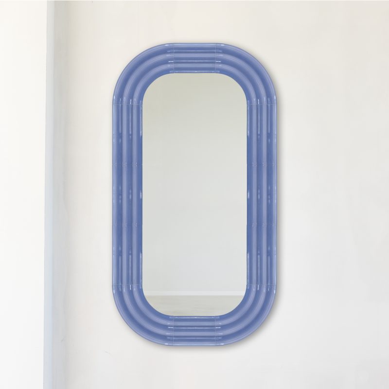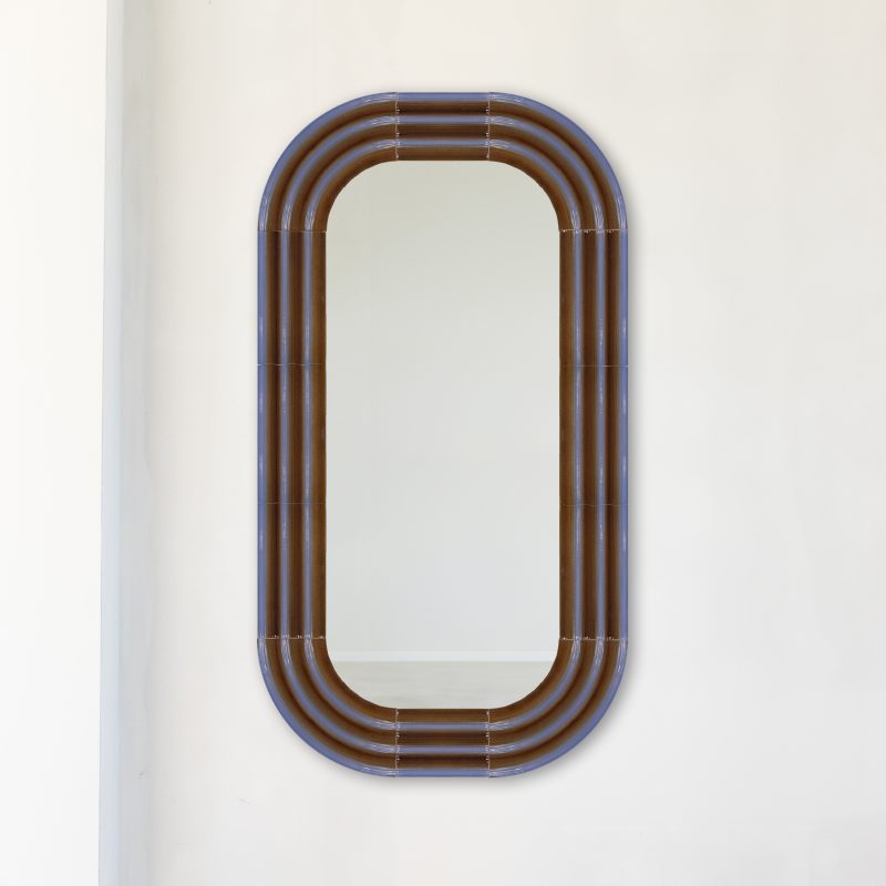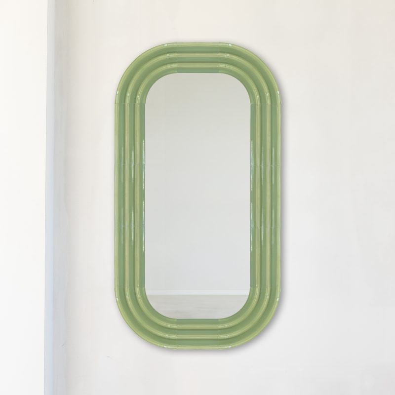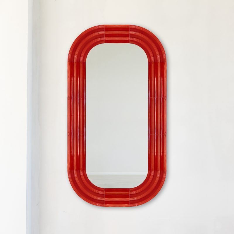 In the new mirrors collection, Pani Jurek explores ceramics and the reflective potential of mirror surfaces. Inspired by the ripple effect on water, the sculptural frames mimic the expanding circles that appear after a splash. The ceramic elements are airbrushed glazed by hand, which gives them a unique, artisanal character. The name “ELO” is a playful nod to Polish slang for “hello,” referring to the greeting between you and your reflection in the mirror.