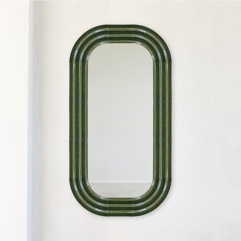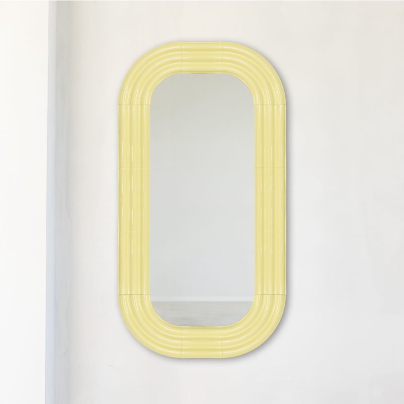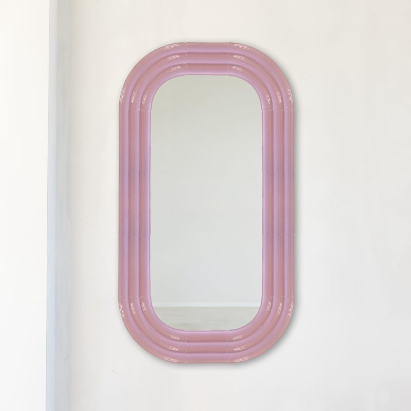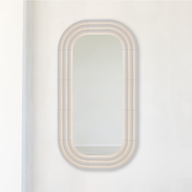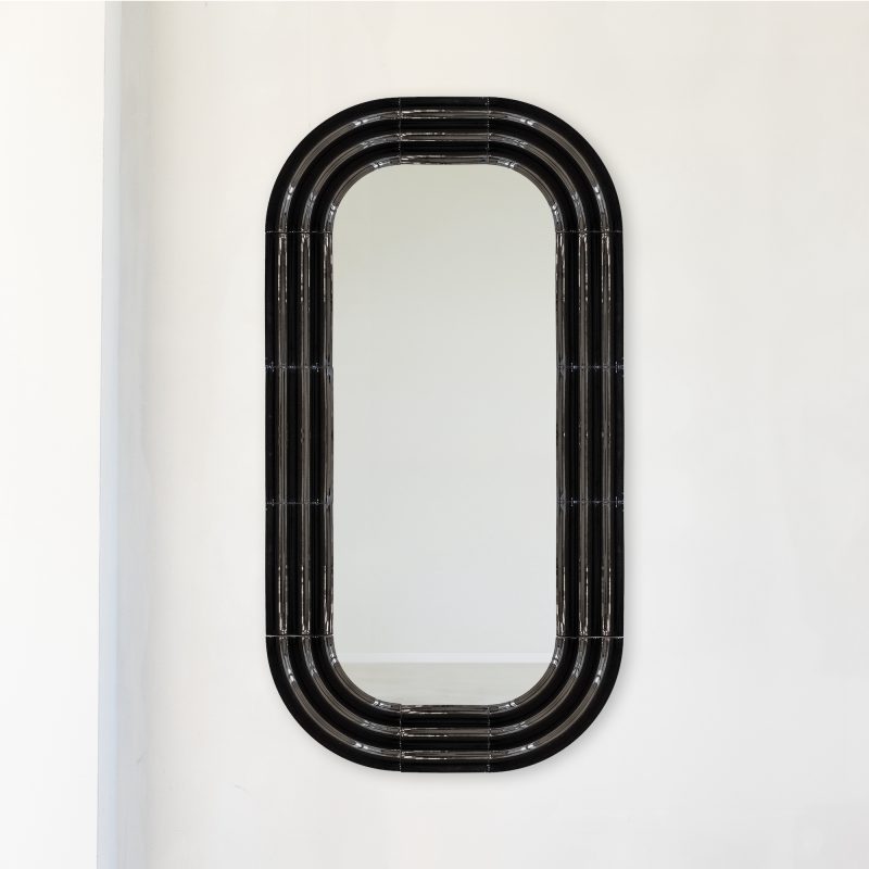 In the new mirrors collection, Pani Jurek explores ceramics and the reflective potential of mirror surfaces. Inspired by the ripple effect on water, the sculptural frames mimic the expanding circles that appear after a splash. The ceramic elements are airbrushed glazed by hand, which gives them a unique, artisanal character. The name “ELO” is a playful nod to Polish slang for “hello,” referring to the greeting between you and your reflection in the mirror.