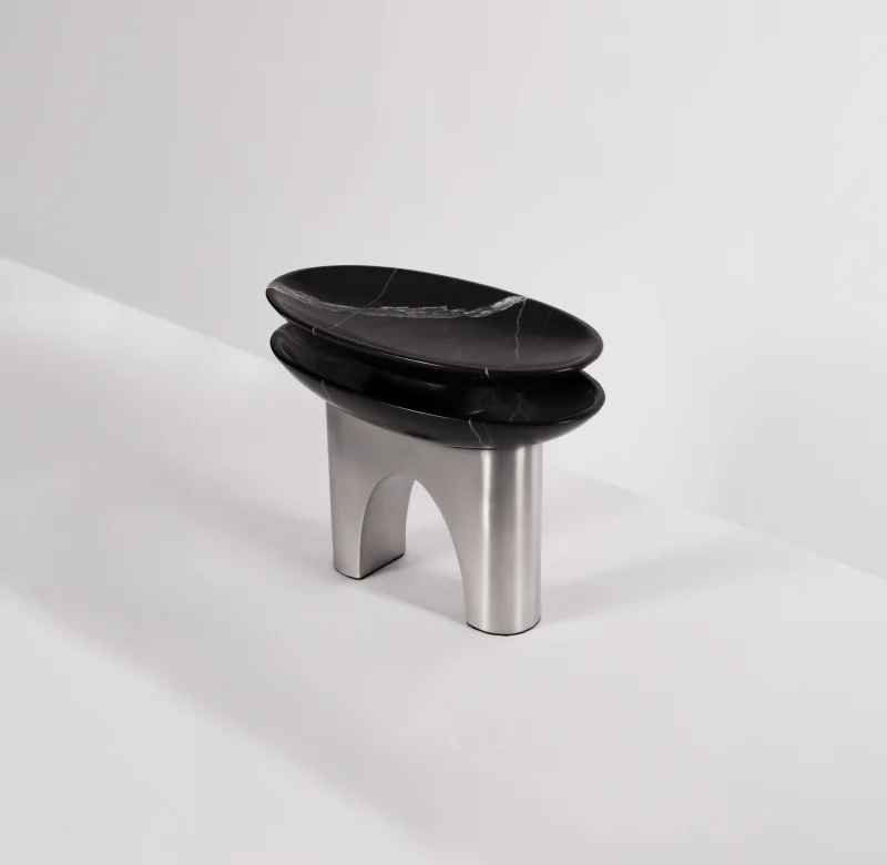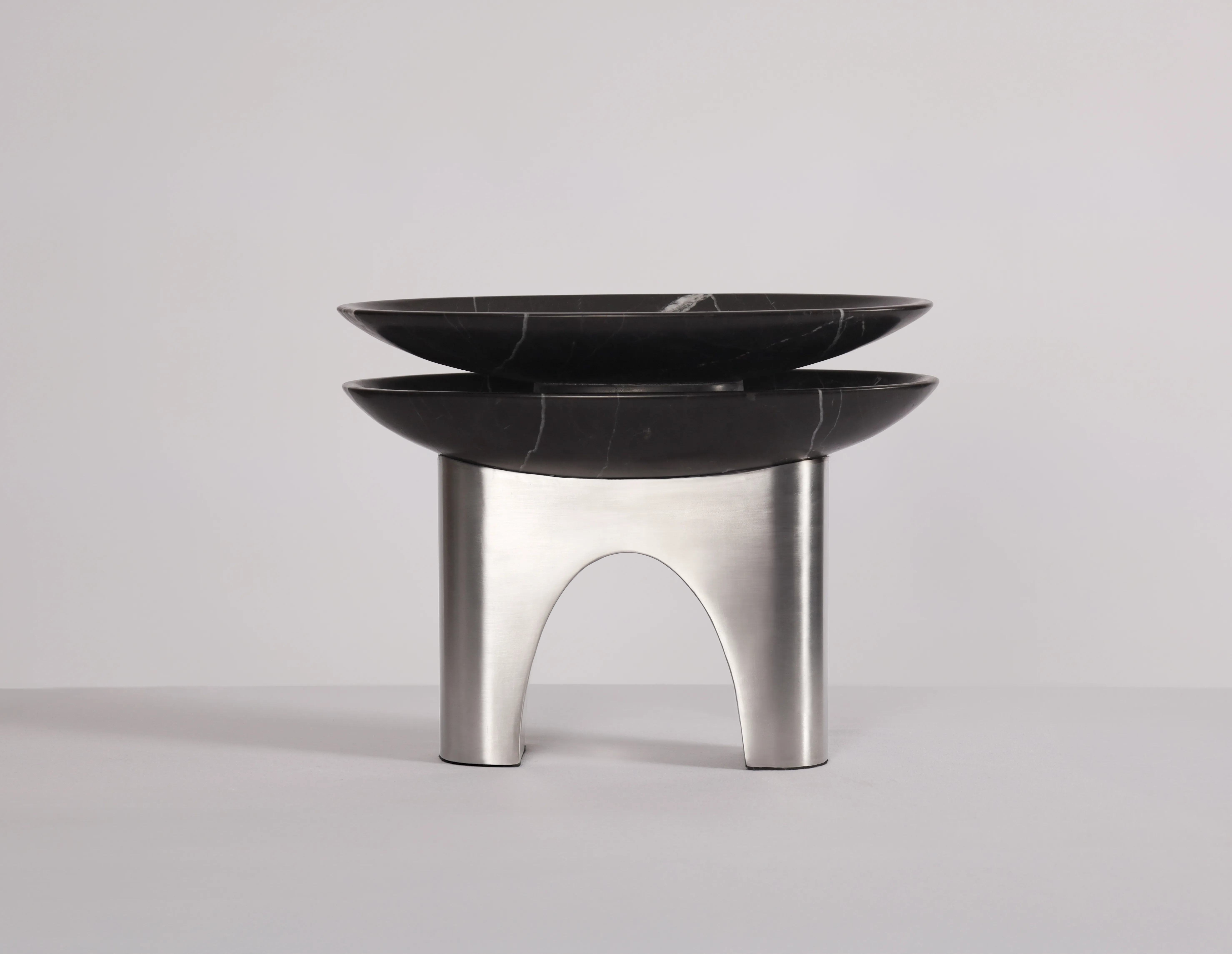 Elyx II is a sculptural vessel defined by the union of two seamlessly joined marble dishes, forming a singular elevated volume. The piece rests freely upon its handcrafted stainless-steel base, two independent elements that meet through balance rather than attachment. The base, made of 16-gauge stainless steel and filled with sand for stability, anchors the composition while preserving its sense of suspension. Hand-carved in black Querétaro marble with a matte finish, Elyx II reveals a dialogue between weight and elevation, precision and calm. Available in matte black or bronze finishes and in marble variations such as Venetian white, beige or red travertine, and Santo Tomás grey, it embodies a quiet harmony between form and structure.