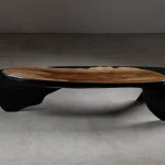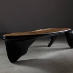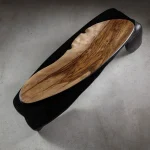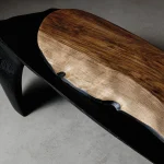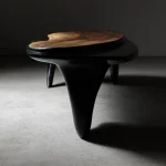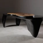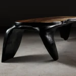 Crafted with the highest attention to detail, this coffee table showcases a sculptural base made entirely out of ash wood and blackened with India Ink. The ink is then sealed in with several coats of oil and hand buffed to obtain a specific sheen on that charcoal black surface which highlights the single slab of walnut.