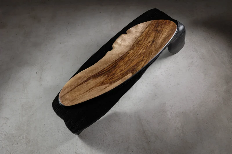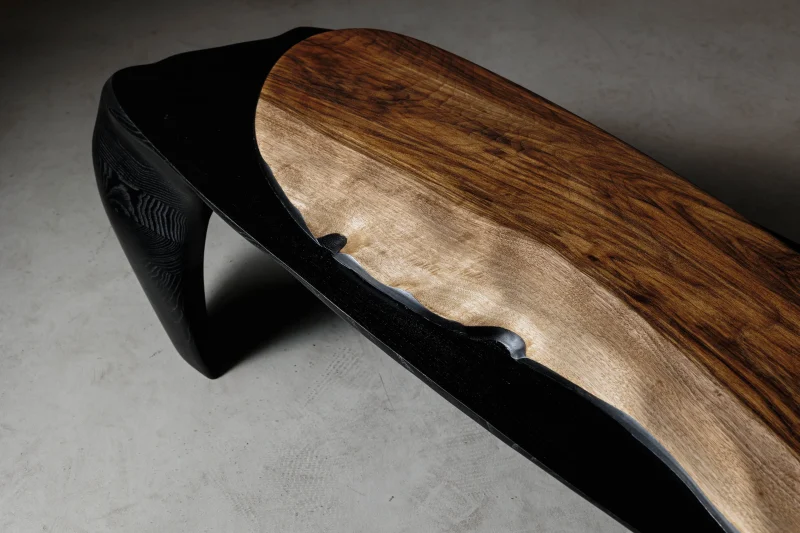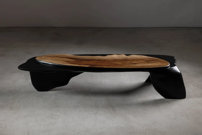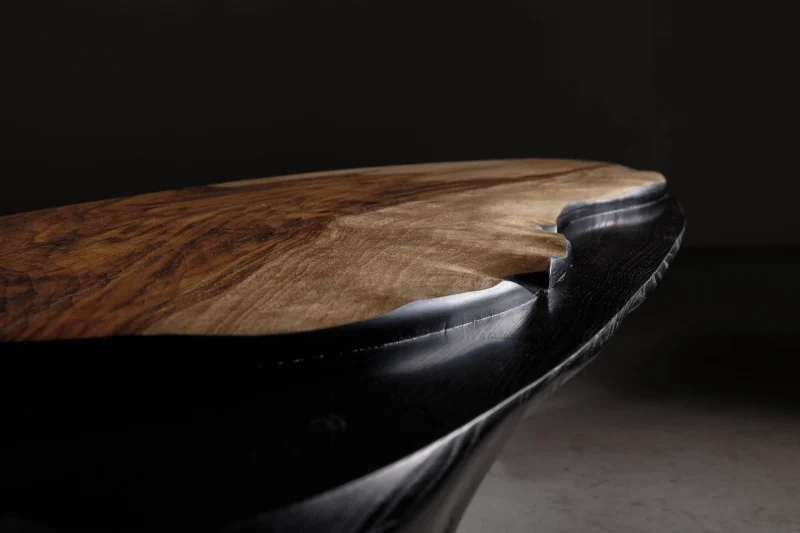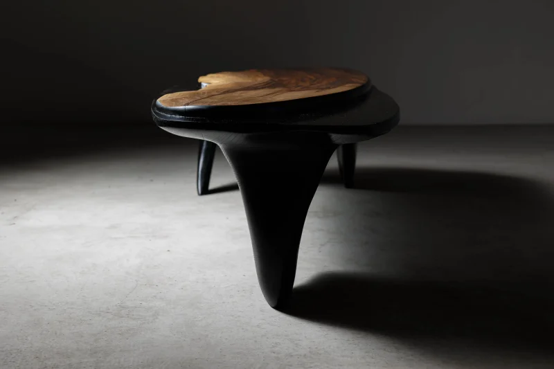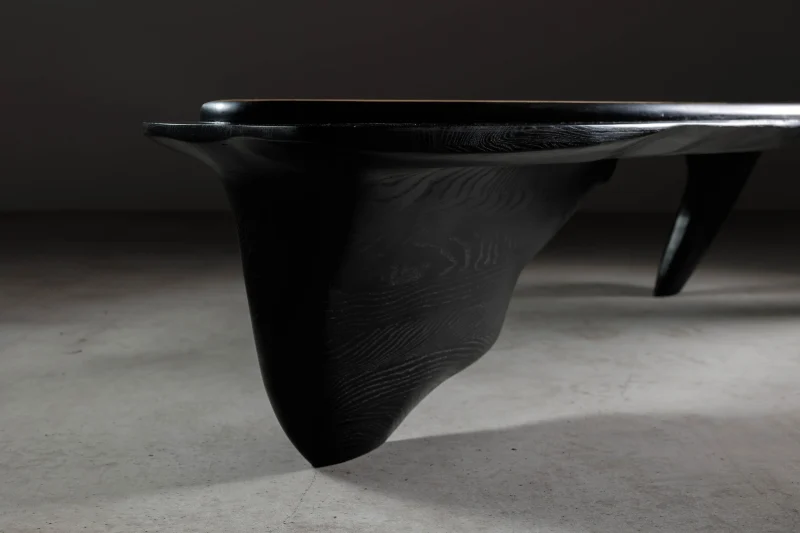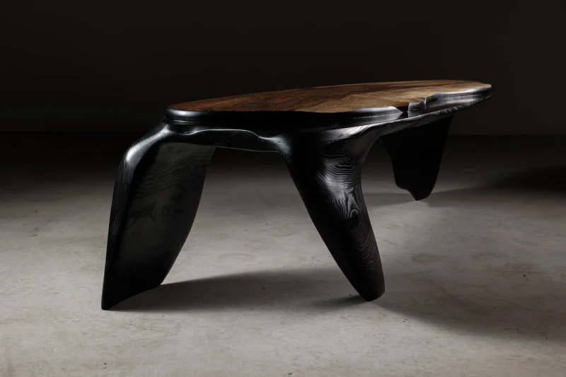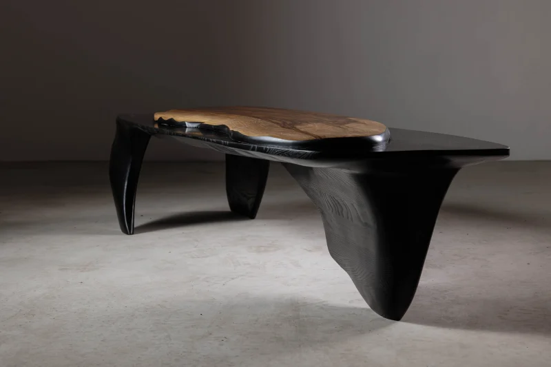 Crafted with the highest attention to detail, this coffee table showcases a sculptural base made entirely out of ash wood and blackened with India Ink. The ink is then sealed in with several coats of oil and hand buffed to obtain a specific sheen on that charcoal black surface which highlights the single slab of walnut.