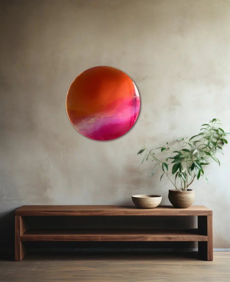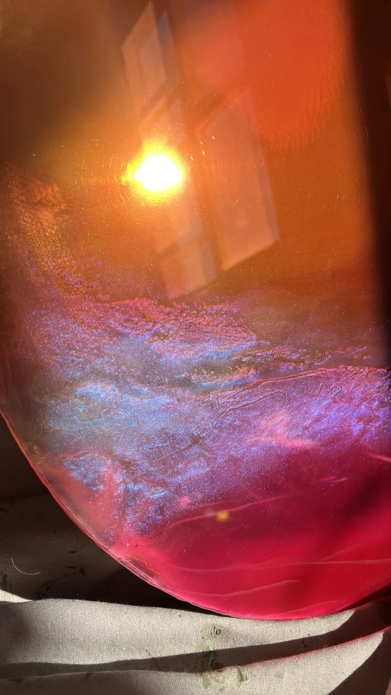 This functional art piece, Ember by Courtney Kinnare, builds a color story through multiple layers of translucent tinted resin over a mirrored glass base. Throughout the day, as the light changes, their vibrant hues shift in color and tone – kaleidoscopic portals offering new perspectives each time you view them. I consider this work my signature series and have been developing the technique for over 2 years.