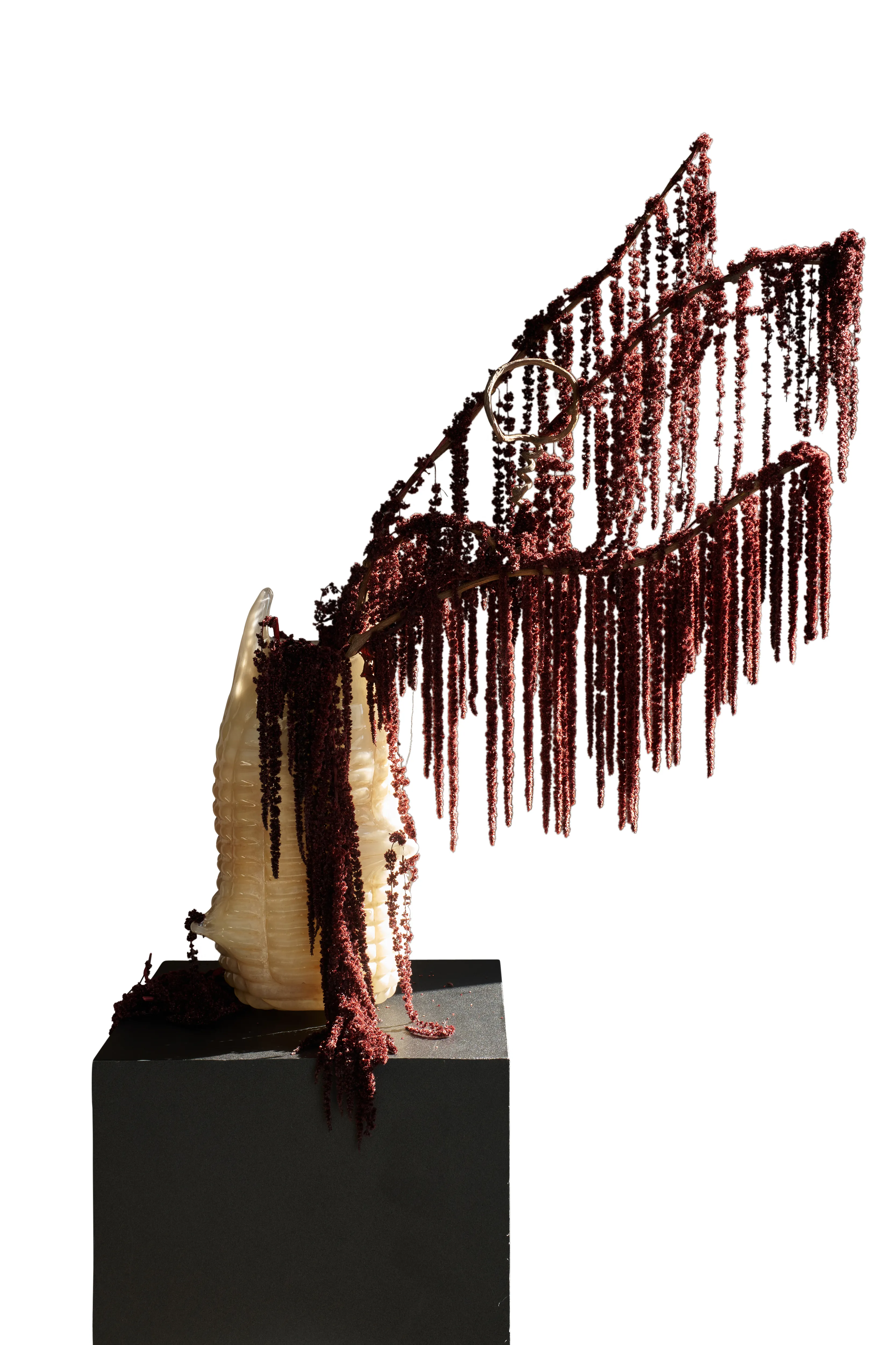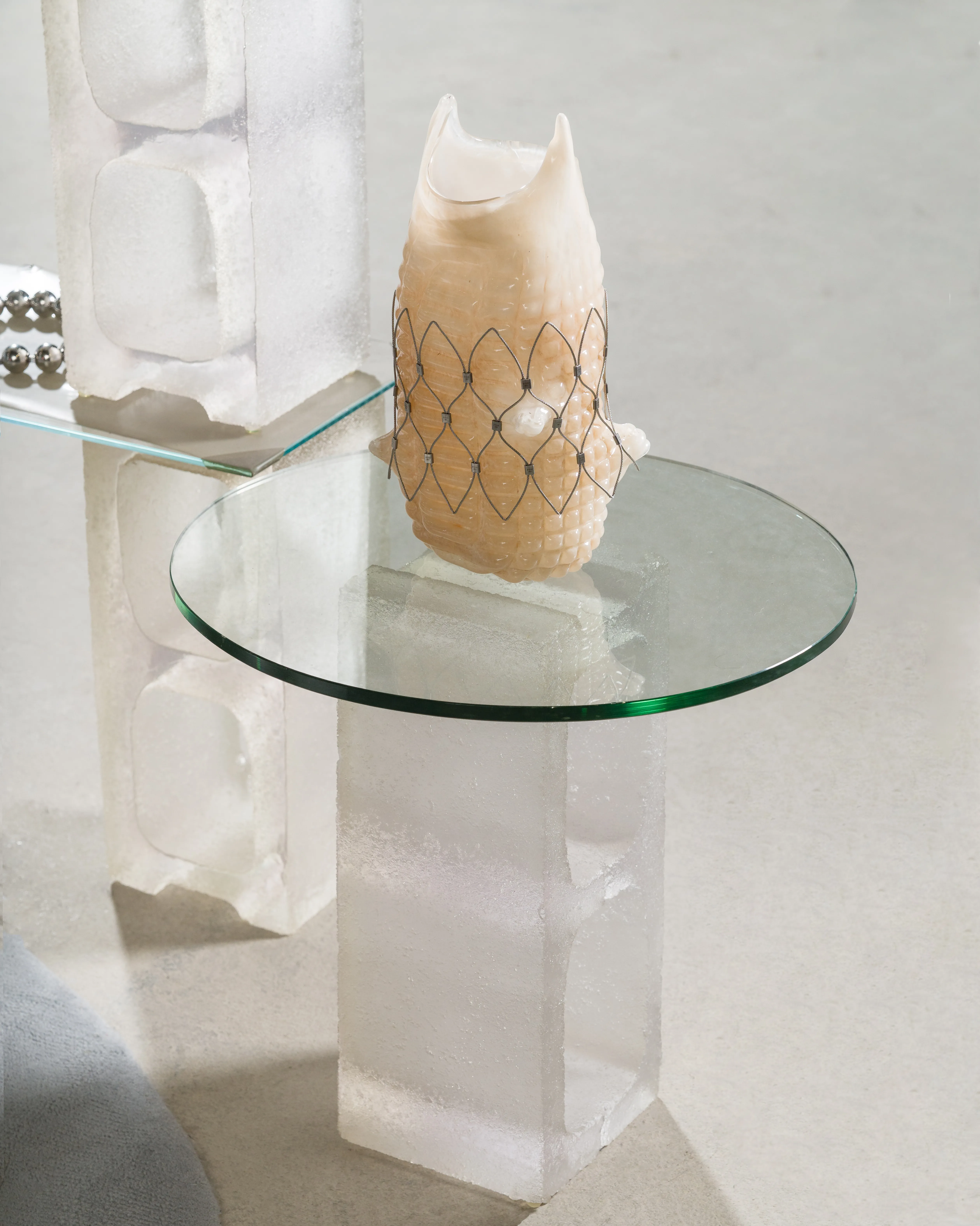 These vessels are part of an ongoing series called “Reliquary for the Deconsecrated”. Each form draws from the shape of a bodice, tight, protective, ornamental, and was created using blown hot glass, and glass powders to evoke the translucency and texture of the skin. This vessel is named after Empress Sisi, the once empress of Austria. Women whose identities were shaped through adornment, power, and constraint. Accessorized by Bond Hardware, blown glass made with the help of Sticky glass.