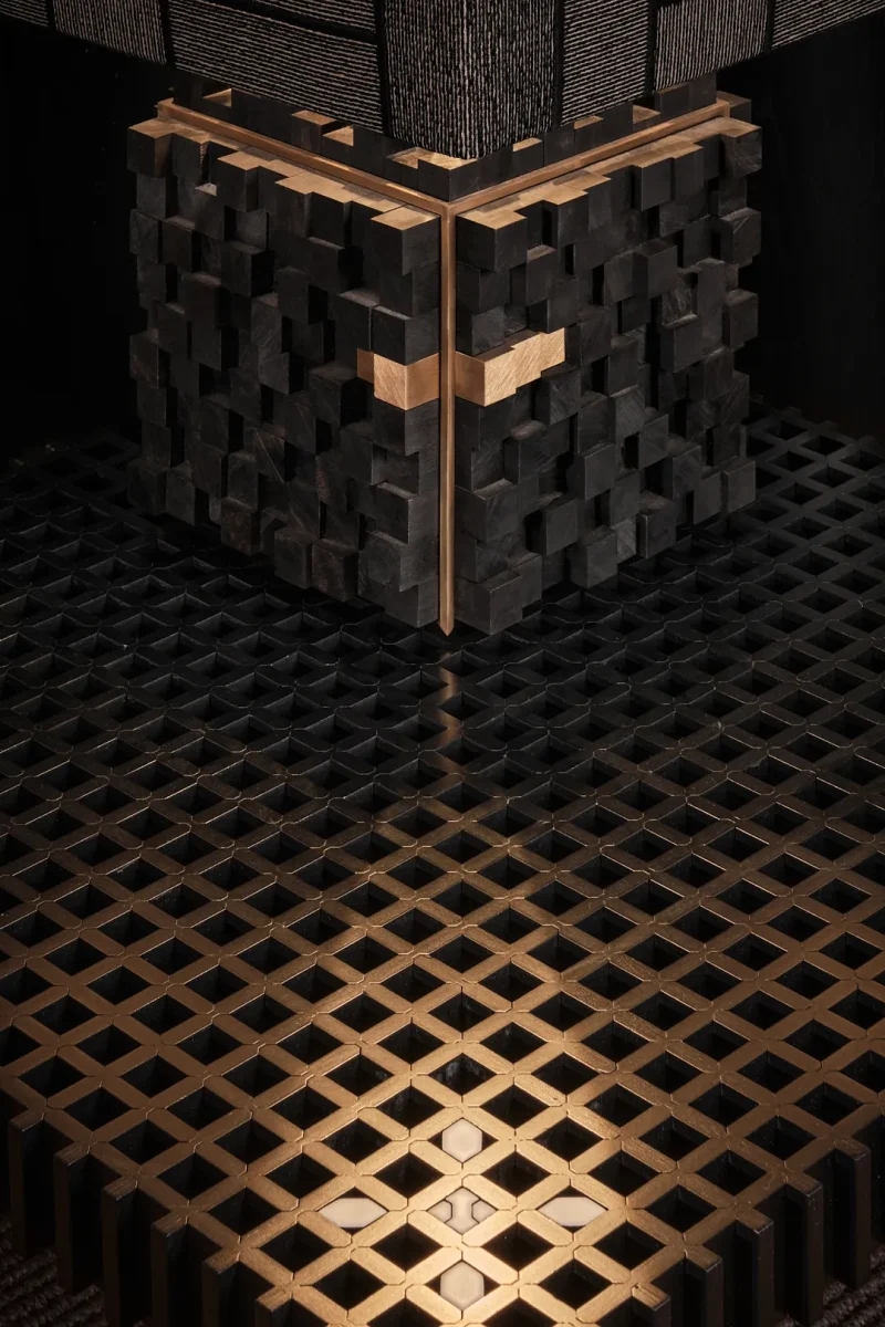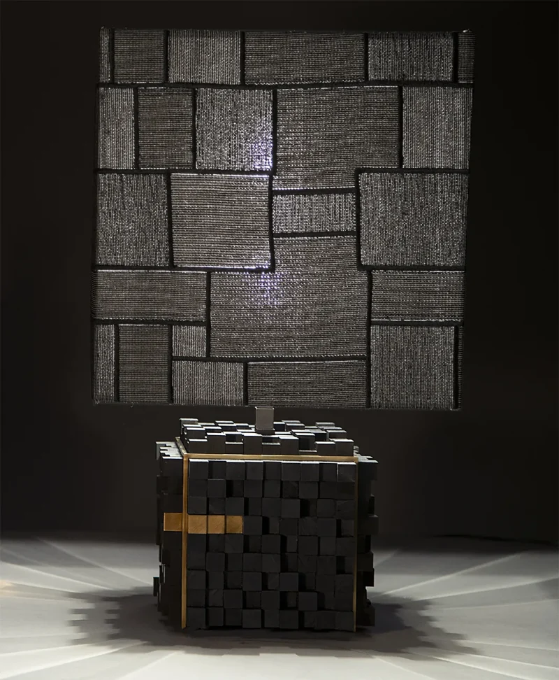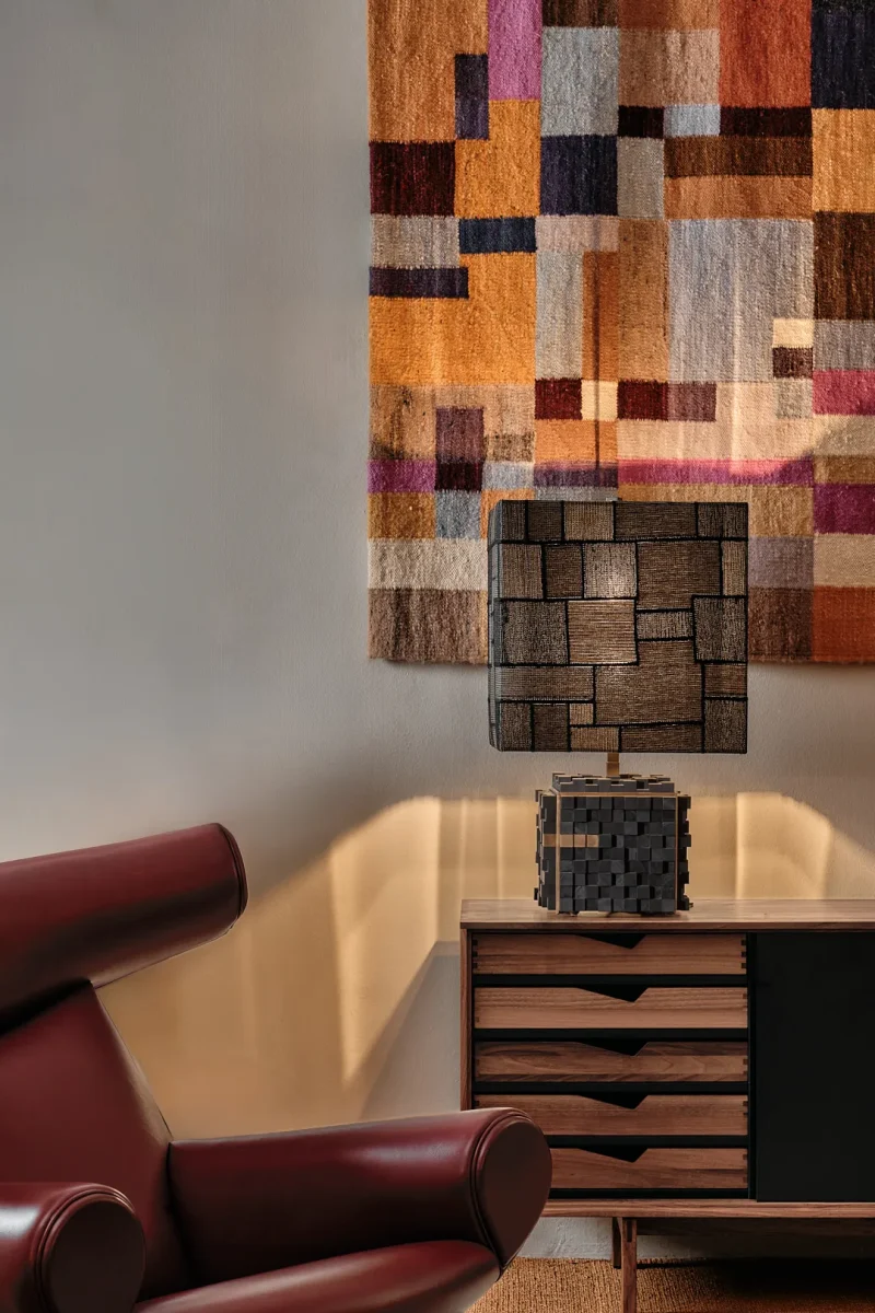 The Mosaic Table Lamp by Arch Plus Ultra is a stunning tribute to the rich artistic traditions of Roman and Byzantine mosaic art. Its base is composed of hand-assembled, irregular ebony wood cubes, forming an austere yet dynamic surface where light refracts across the textured facets, creating a mesmerizing play of shadow and brilliance.