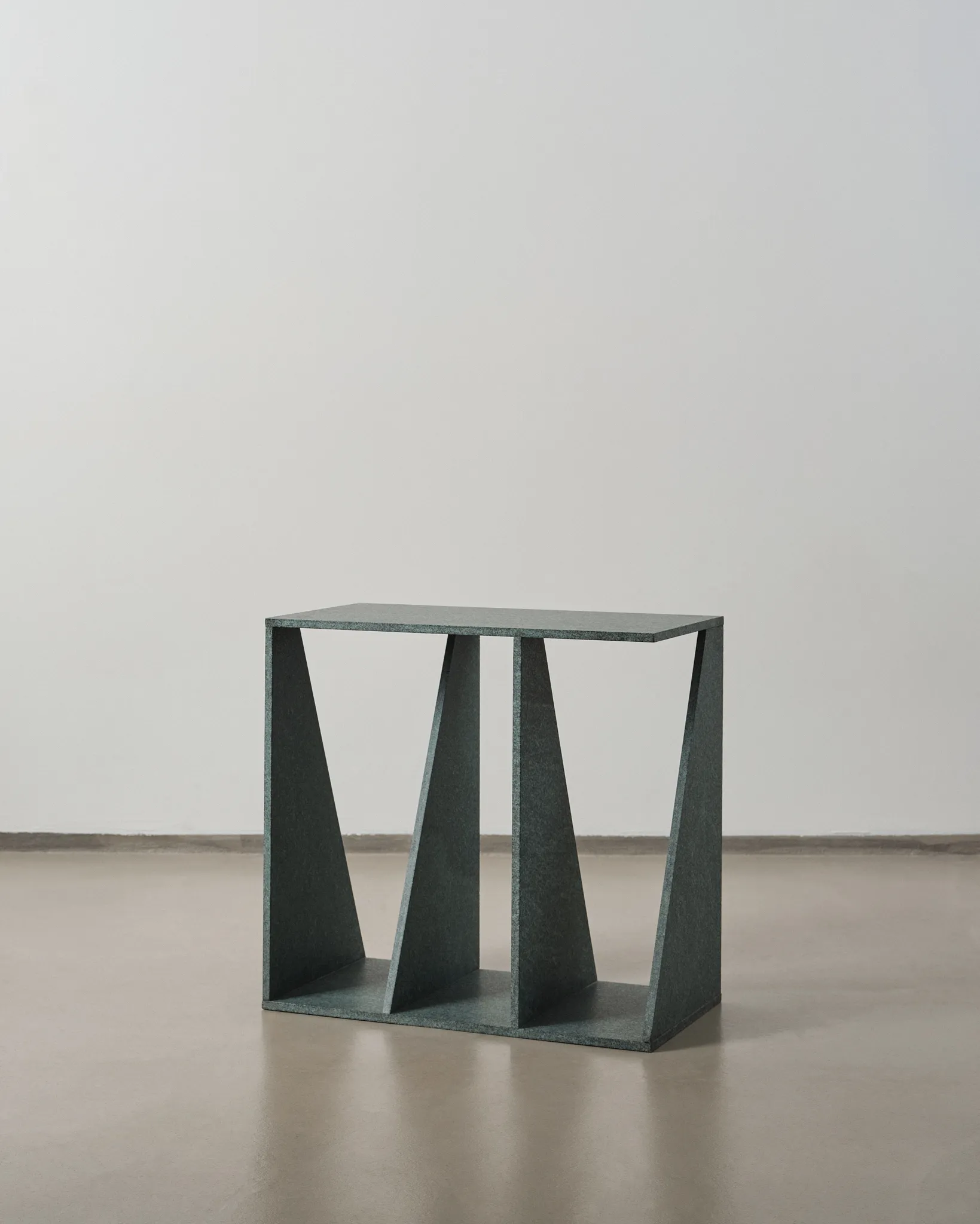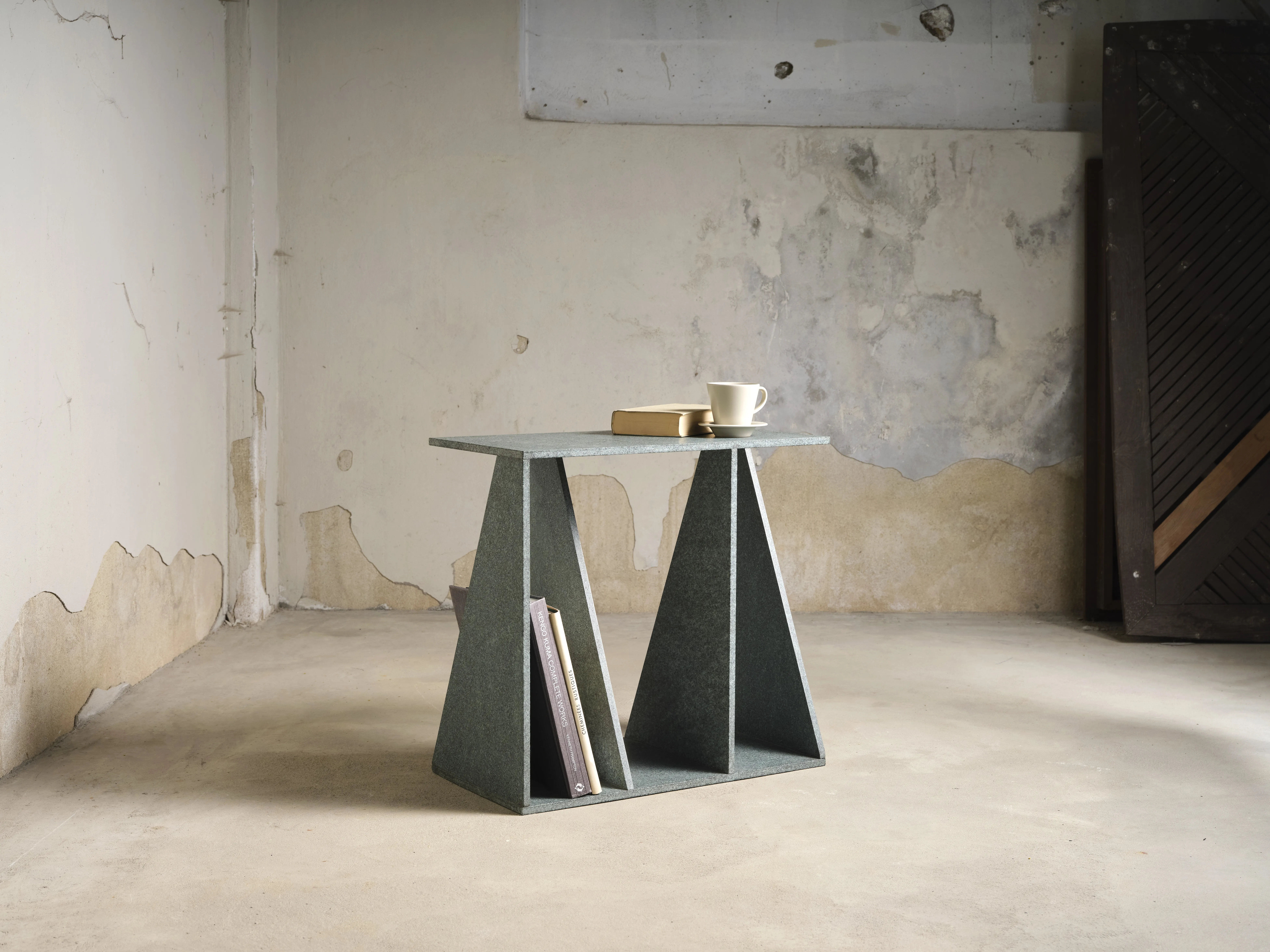 The Envo side table’s layered stone construction not only provides structural stability but also contributes to its distinctive design. Its geometric, sculptural form not only enhances its aesthetic appeal but also creates small storage spaces within its design. Thanks to its stacked layers arranged in opposing directions, Envo offers a unique visual experience from every angle and can double as a compact bookshelf.