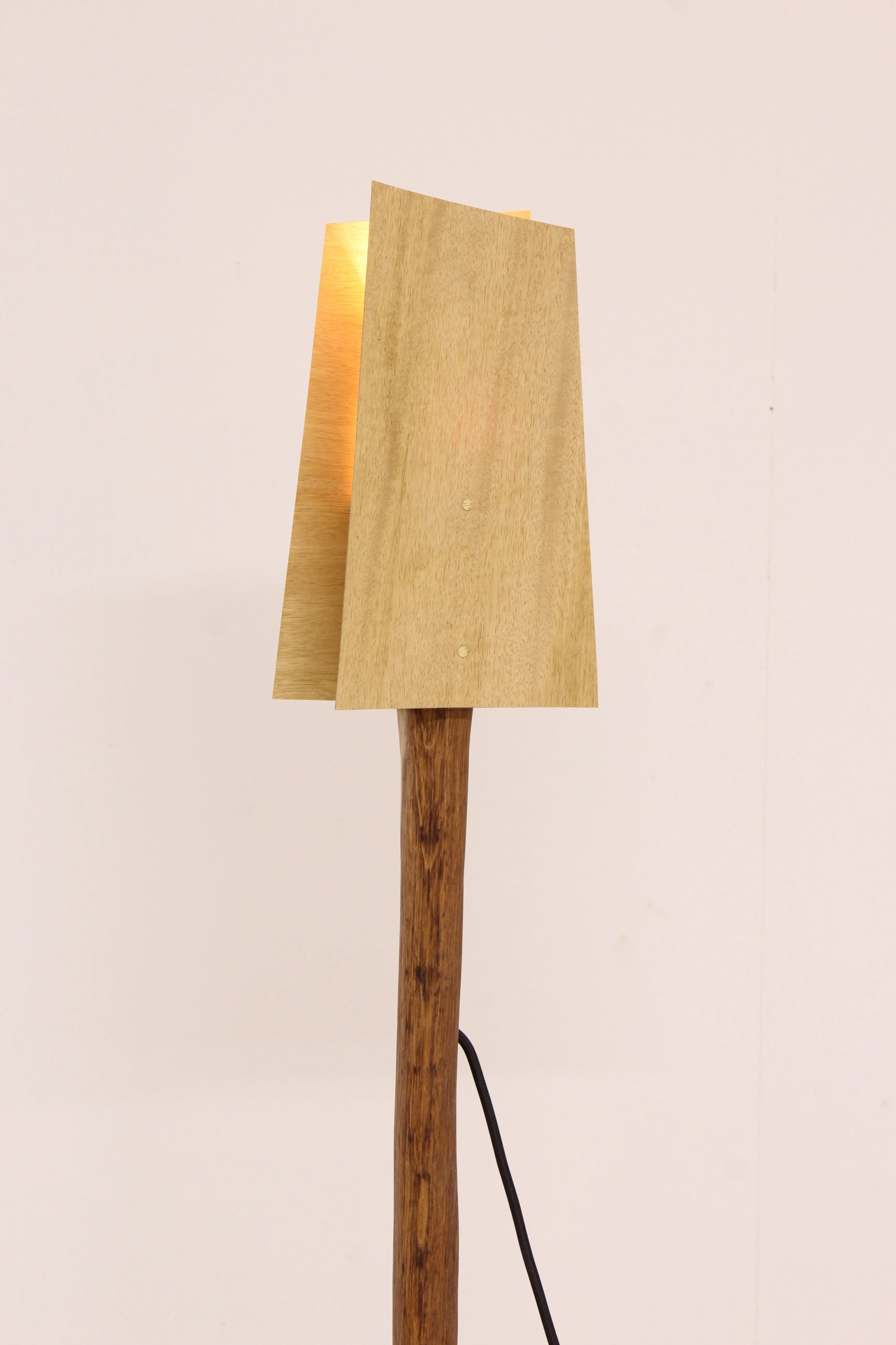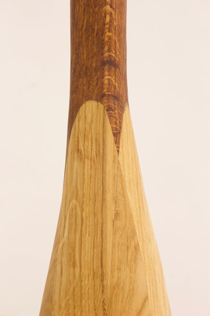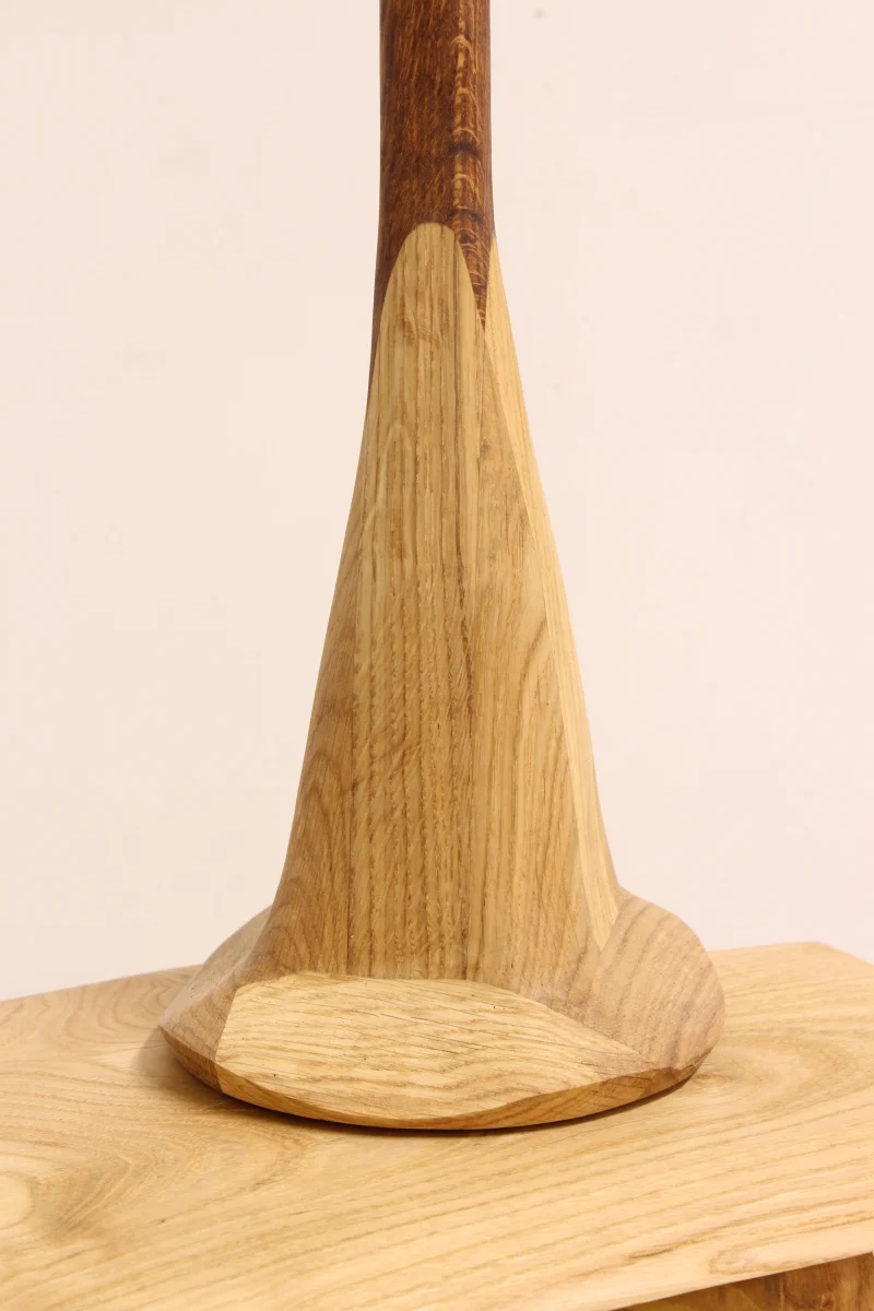Its light oak base anchors it to the ground, while the red oak stem raises the lampshade, which is made of veneer.
