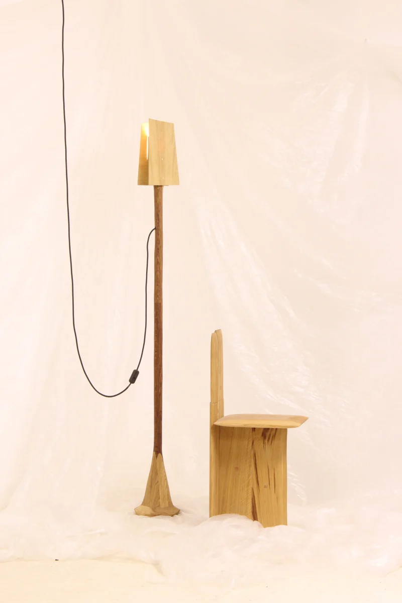 Vital Lainé, born in 1997 in Rennes, is an artist and designer who works intimately with wood. In 2022, he established his studio near the Rance River, close to a sawmill where the material itself often seems to call to him. His process is a dialogue between his creative vision and the living essence of wood, which guides his designs as much as he shapes it. Vital has a unique perspective on his medium, emphasizing its natural beauty and so-called imperfections. He sees every phase of creation as integral to the final piece, from sketches and models to hands-on shaping. His work shifts between drawing, flat designs, and volumes, allowing him to reinterpret objects from multiple perspectives. Each piece represents the beginning of a new exploration. Even when two creations appear similar, they are distinct versions of an idea. Vital continuously reimagines everyday objects—chairs, tables, and lamps—seeking new forms that honor simplicity, materiality, and function. “I don’t add anything unnecessary; I let the material speak. Details like a vein or knot in the wood inspire me and remind me of the tree it came from.” His work blends utility and artistry, existing between daily use, sculpture, and a sacred respect for nature. Drawing inspiration from artists such as Constantin Brancusi and Max Lamb, Vital creates objects that invite reflection and interaction. Beyond his studio, Vital photographs his pieces in various settings—landscapes, village squares, or near the sawmill—offering new perspectives on his work. For him, the process of making, the time spent reflecting, and the interaction with space are inseparable from the object itself. In his creations, Vital Lainé invites us to rediscover the connection between material, design, and the world around us.
