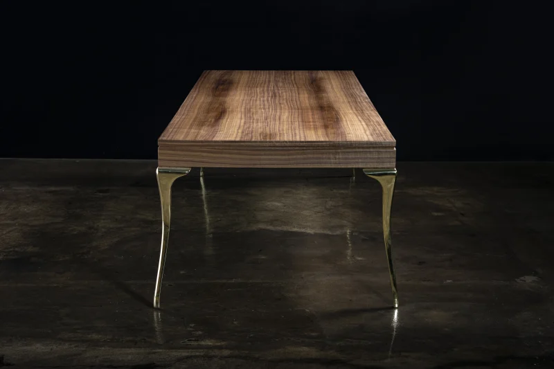 The Enzio Table by Costantini Design features a contemporary take on the classic Queen Anne leg, cast in bronze. Shown here in natural walnut but available in any species, finish or material and customizable to your desired dimensions.