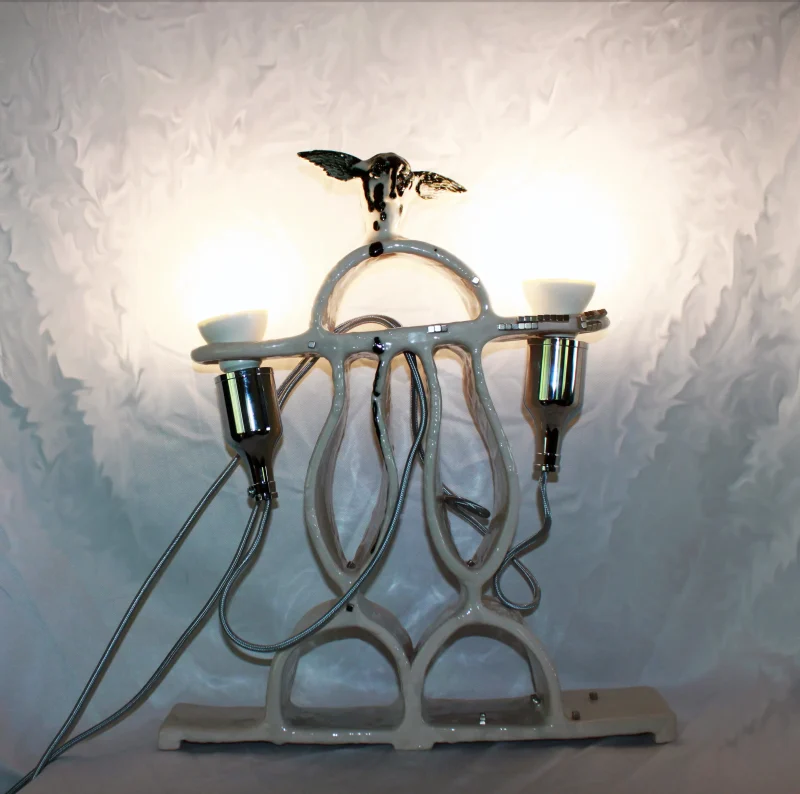The piece was made by hand using clay, glaze, and magnets. It features two ceramic sockets and a light bulb.