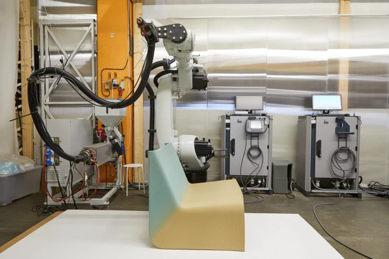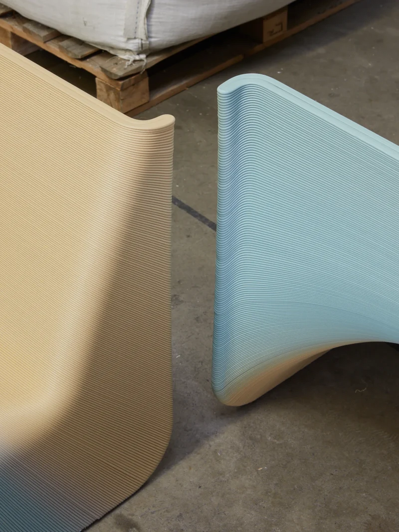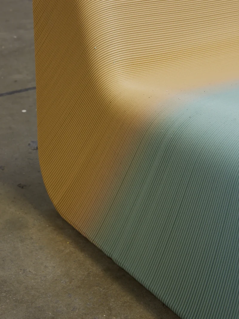 The monolithic seat of the “Ermis” Chair follows simple and ergonomic lines and is robotically crafted with a single spiral plastic thread that follows the geometry. The layer orientation constantly follows the geometry of the chair via a slight rotation. As a result, the chair is strong with minimal material usage. At the same time, this approach creates a graphic texture on its surface.