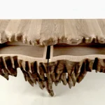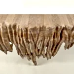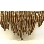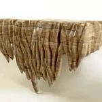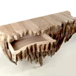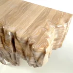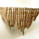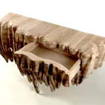 The Erode series by Aaron Scott envisions the geomorphic erosion process as an analogue to the sculptural practice of fabricating carved furniture. The stacked-lamination process has a lot in common with the way topographical features of a landscape form and de-form over time, and the abrasive materials used on wood (i.e. sand) are often the same materials active in processes of erosion. This process of removal, transportation and deposition of materials, while largely random, tends toward certain patterns, and the Erode series explores ways of reproducing or simulating these patterns in furniture pieces. The Erode Console features two drawers that blend into the undulating front. A hidden cleat secures the piece to the wall.