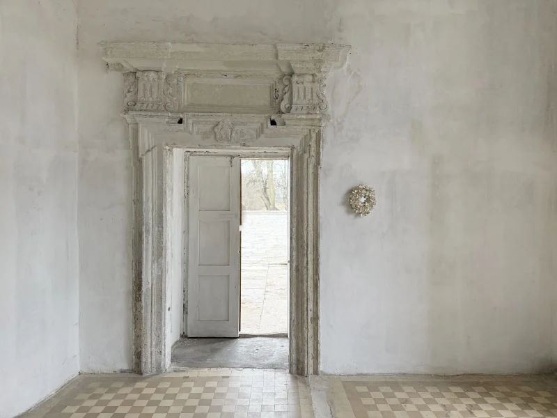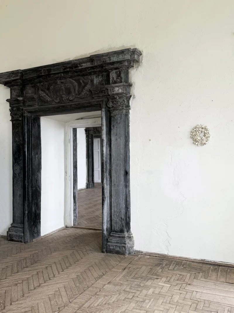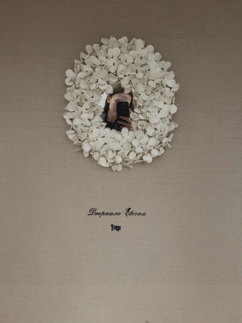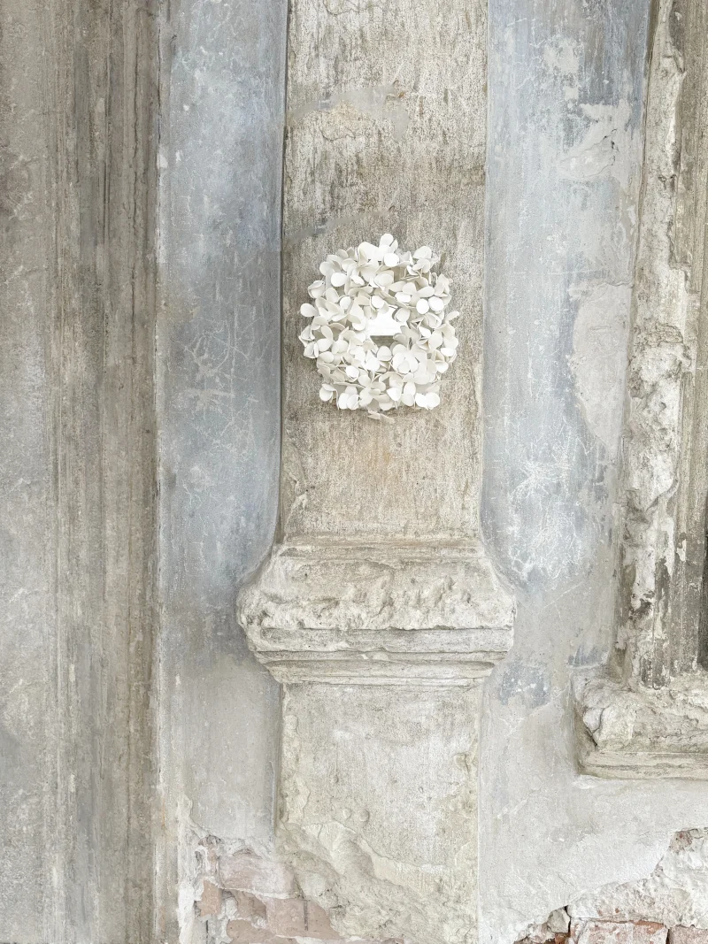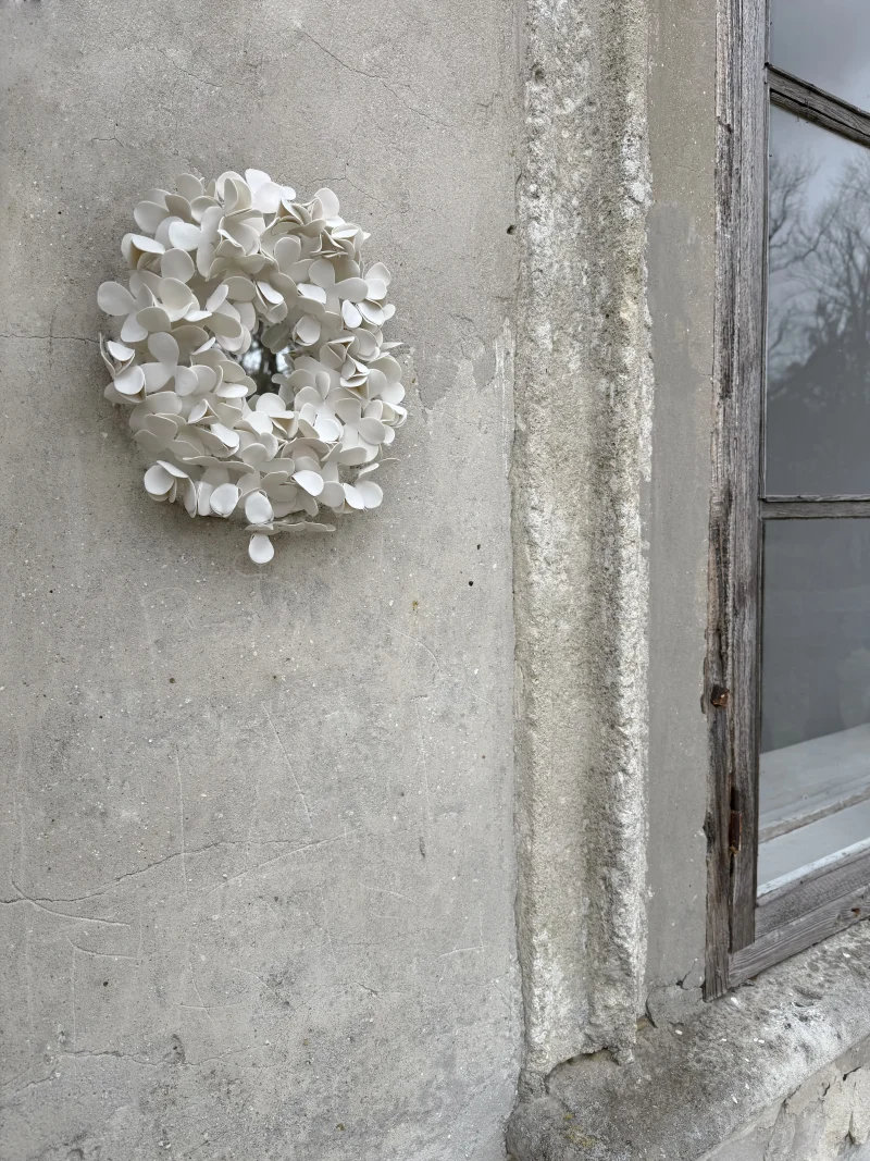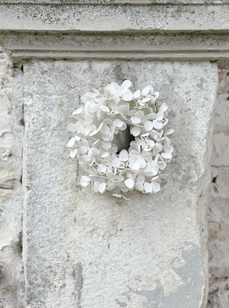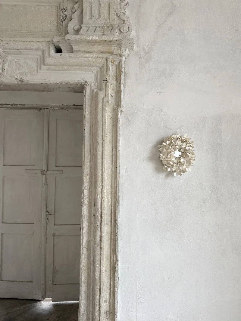 A wall mirror framed with hand-formed porcelain petals by Tiini. Inspired by the delicate texture of inflorescence, it balances the fragility of the material with the purity of reflection.