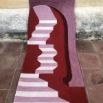 Each tapestry is a unique interpretation of Mexican symbols and architecture mixed with Scandinavian minimalism. They act as portals to a parallel universe where distorted geometry and surreal figures coexist. “I Saw, I Felt” is a tribute to the Oaxacan textile tradition and craftsmanship. The red hues are carefully composed and uphold the ancient Zapotec dyeing technique extracted from the cochineal insects.