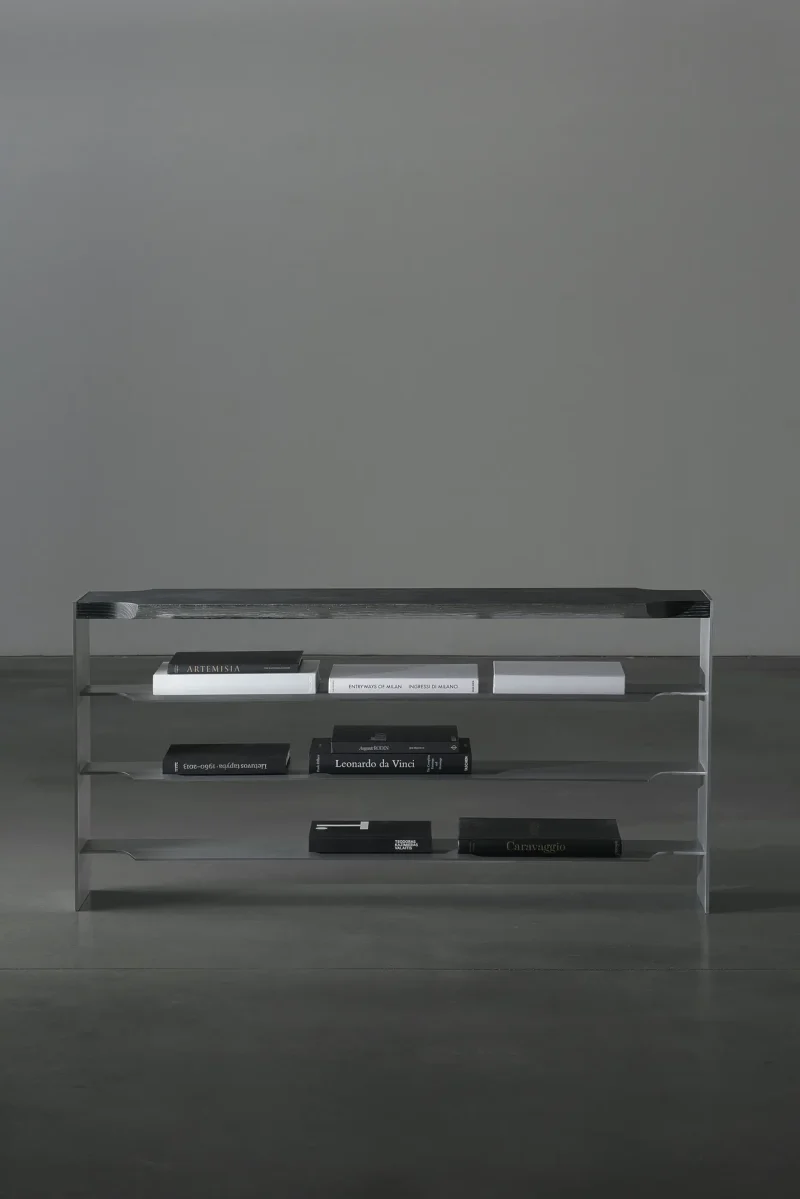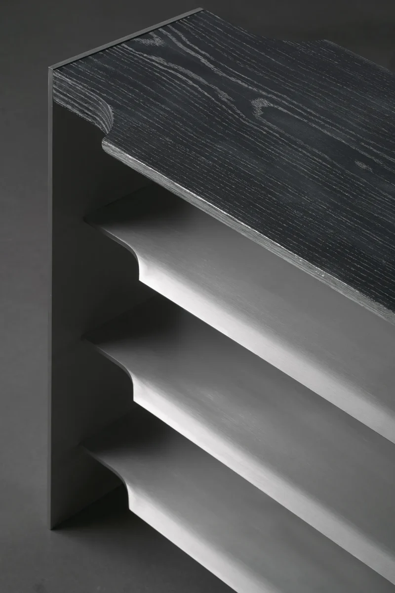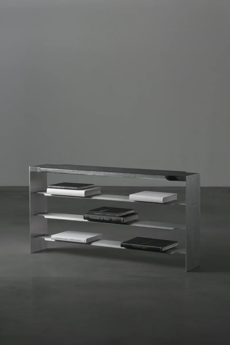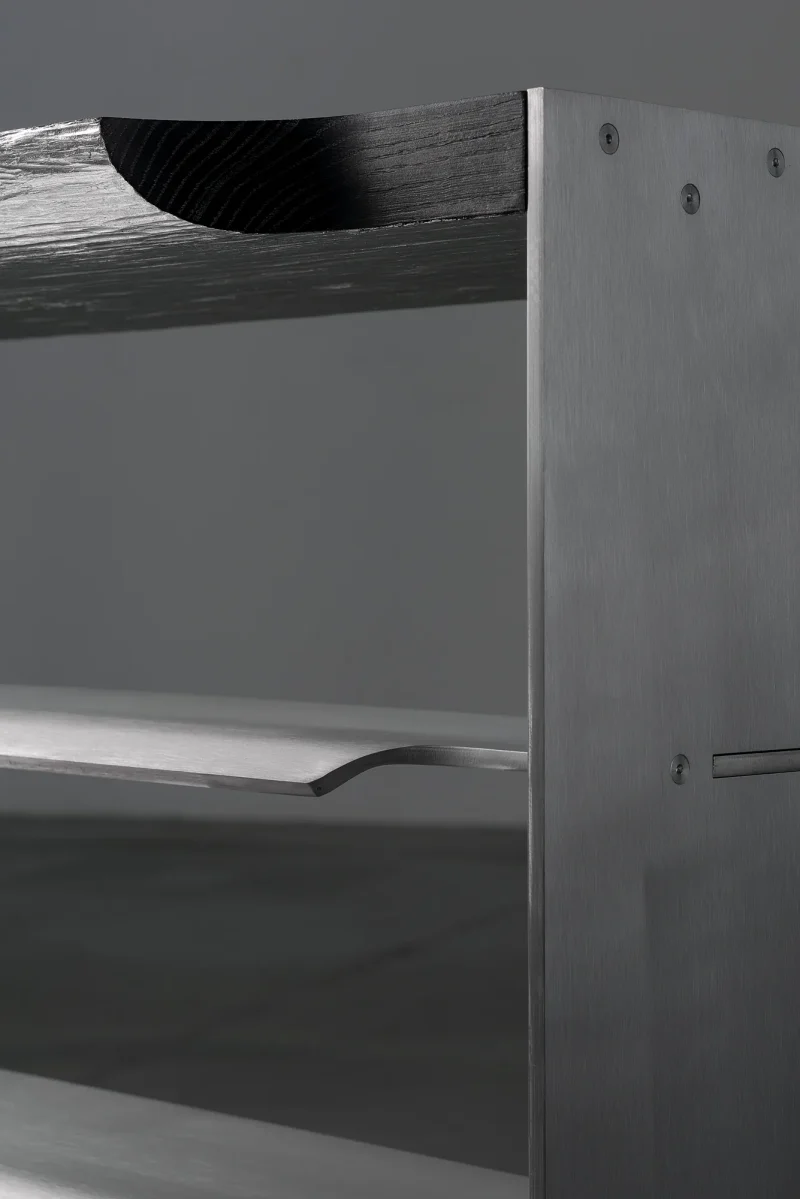 Mantas Lesauskas’ furniture reminds us that design is the love language of objects. In the collection “Slipcover”, it is deceptively firm, without immediate betrayal of its intentions. Brushed aluminium, limed oak, parachute pleats – a militaristic Gothic that seems to leave no room for tenderness. Yet the soul of these objects is subtle: they are the readers’ furniture on which the stories rest. Their stark structures and rich materials legitimise the experiences that separate life from survival. The discipline that binds them together comes not from the need to defend but from the desire to nurture, to have something to lean on in every chapter of life. When we surrender to these things, we become the softest parts of them. We can read the titles of books from all sides, strip the table in search of its legs, try to pull a duck out from under a shelf, and do other little things to which we do not typically attach much interpretation. We can fill the crevices of the armchairs with our own little perversions and stock up for the next winter of pain when there is nothing left to draw from. The soulfully shimmering curtain in the exhibition is like a thin line you only experience in free fall or when you watch a mystery end. These carefully honed and deliberated objects prepare to live on in various colours and with different surfaces, to speak to future strangers in a new love language of objects.