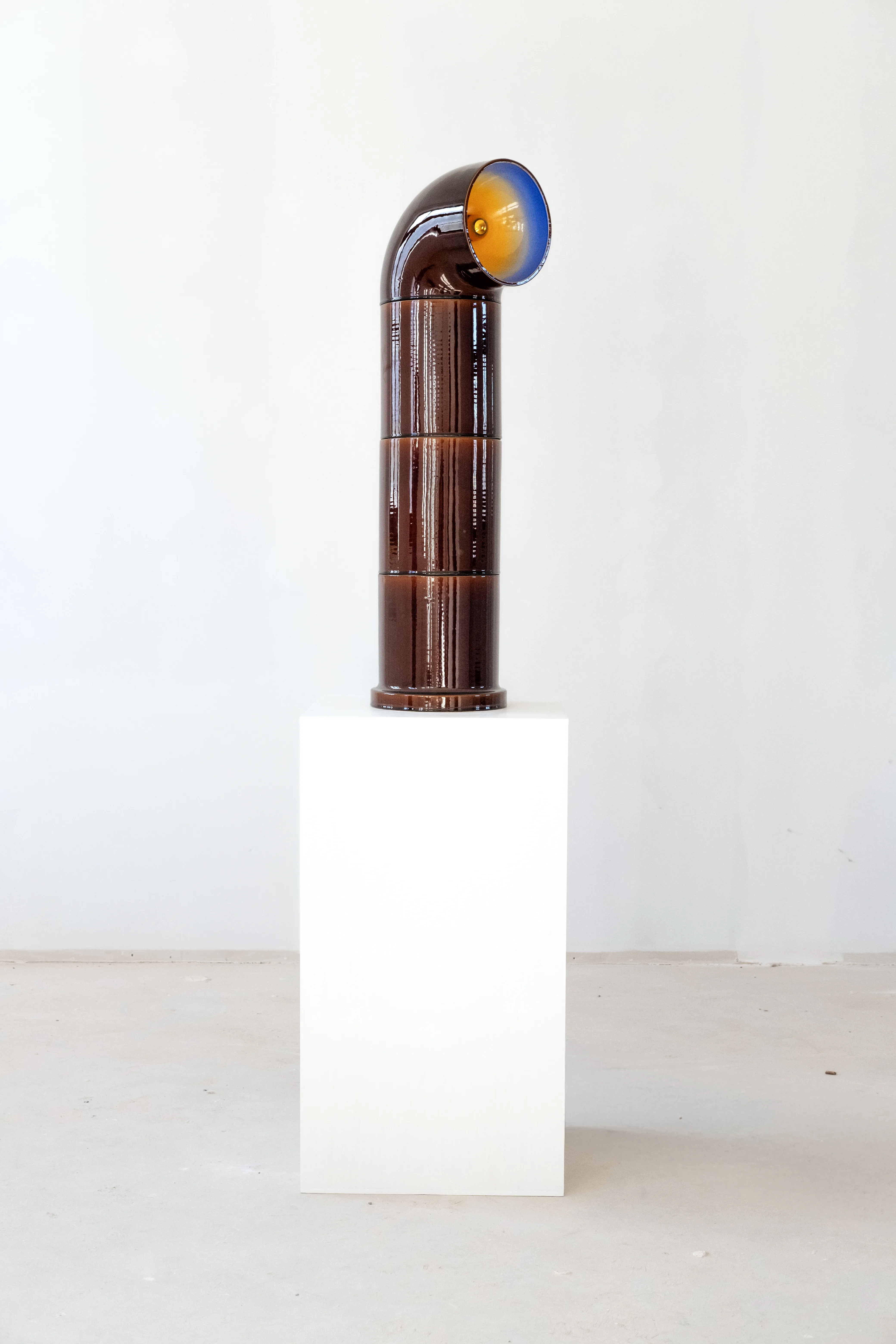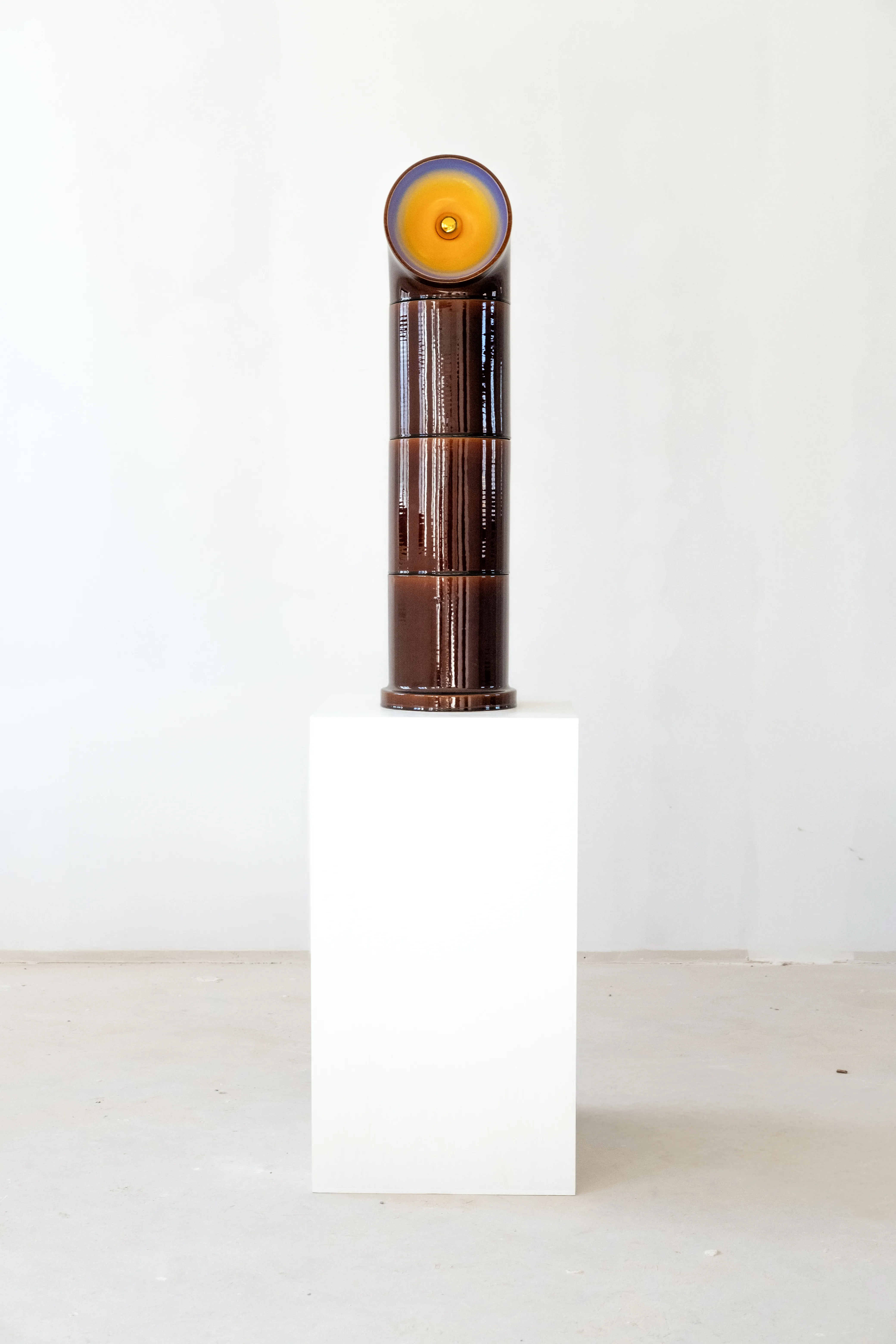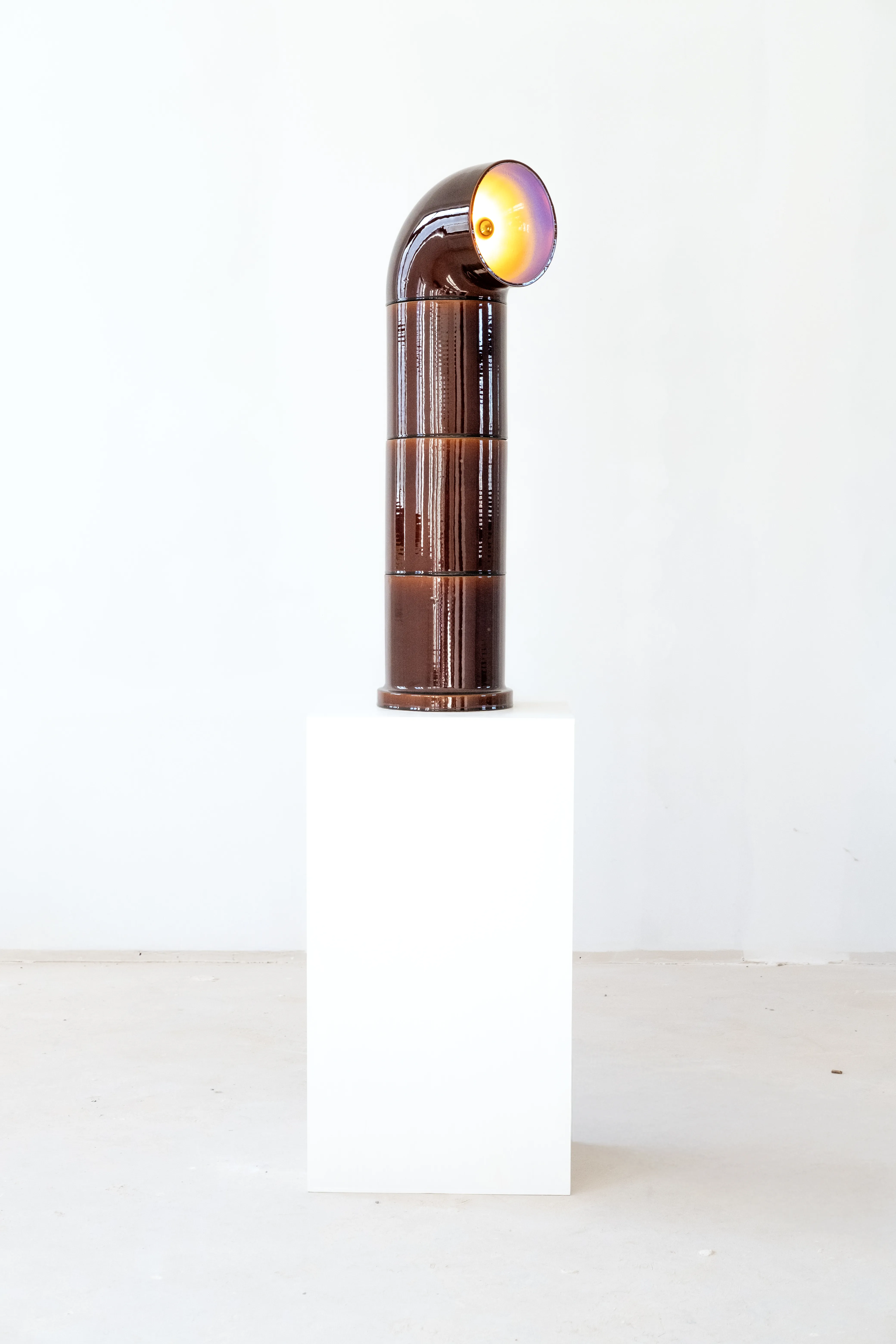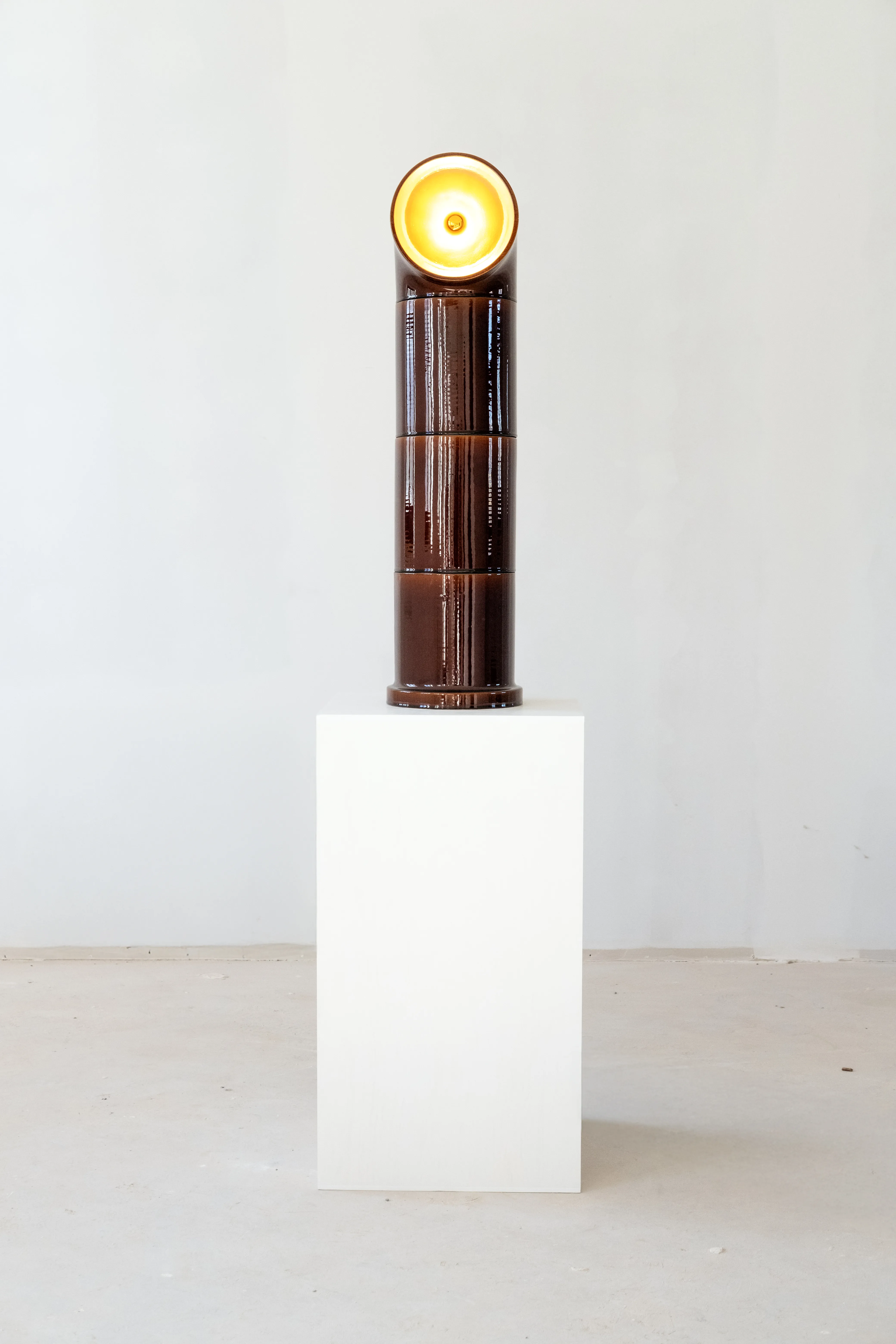 FAT OP – a standing lamp, modular and adaptable, adjusting its height to the function and needs of the user. Its massive body, evoking associations with living matter, is crowned with a concave “eye” in a contrasting color. When the bulb is lit, the eye fills with light, revealing the essence of the hidden color. The light of FAT OP is directed inward, highlighting the material beauty of the ceramic surface and the captivating depth of the glazes’ colors.