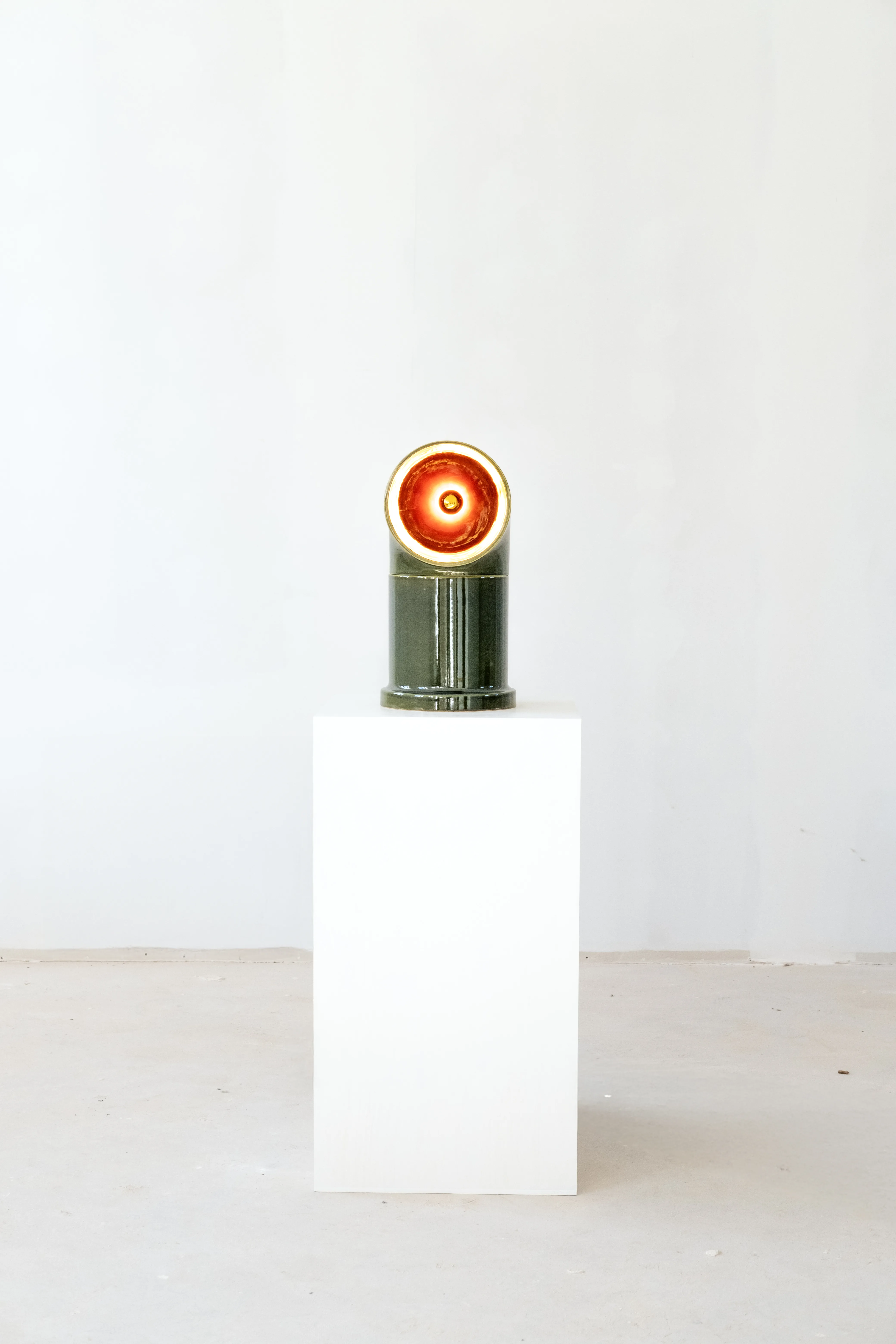 FAT OP – a standing lamp, modular and adaptable, adjusting its height to the function and needs of the user. Its massive body, evoking associations with living matter, is crowned with a concave “eye” in a contrasting color. When the bulb is lit, the eye fills with light, revealing the essence of the hidden color. The light of FAT OP is directed inward, highlighting the material beauty of the ceramic surface and the captivating depth of the glazes’ colors.