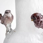 A delicate, cracked collectible vase-object with hot-glass modeled and hand-painted birds made of opaline glass.