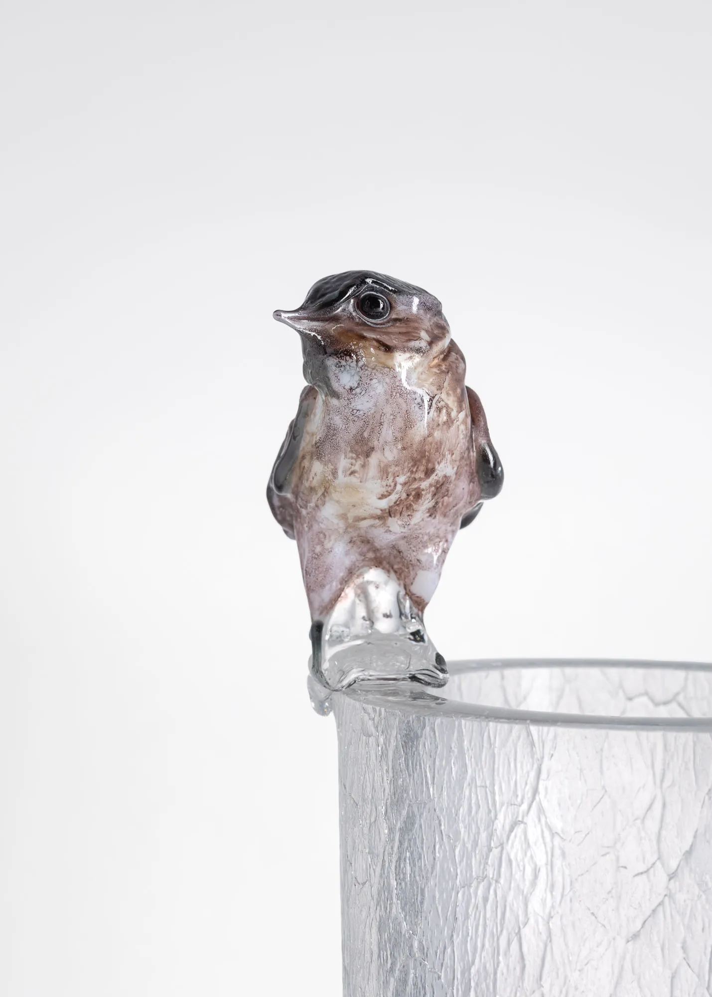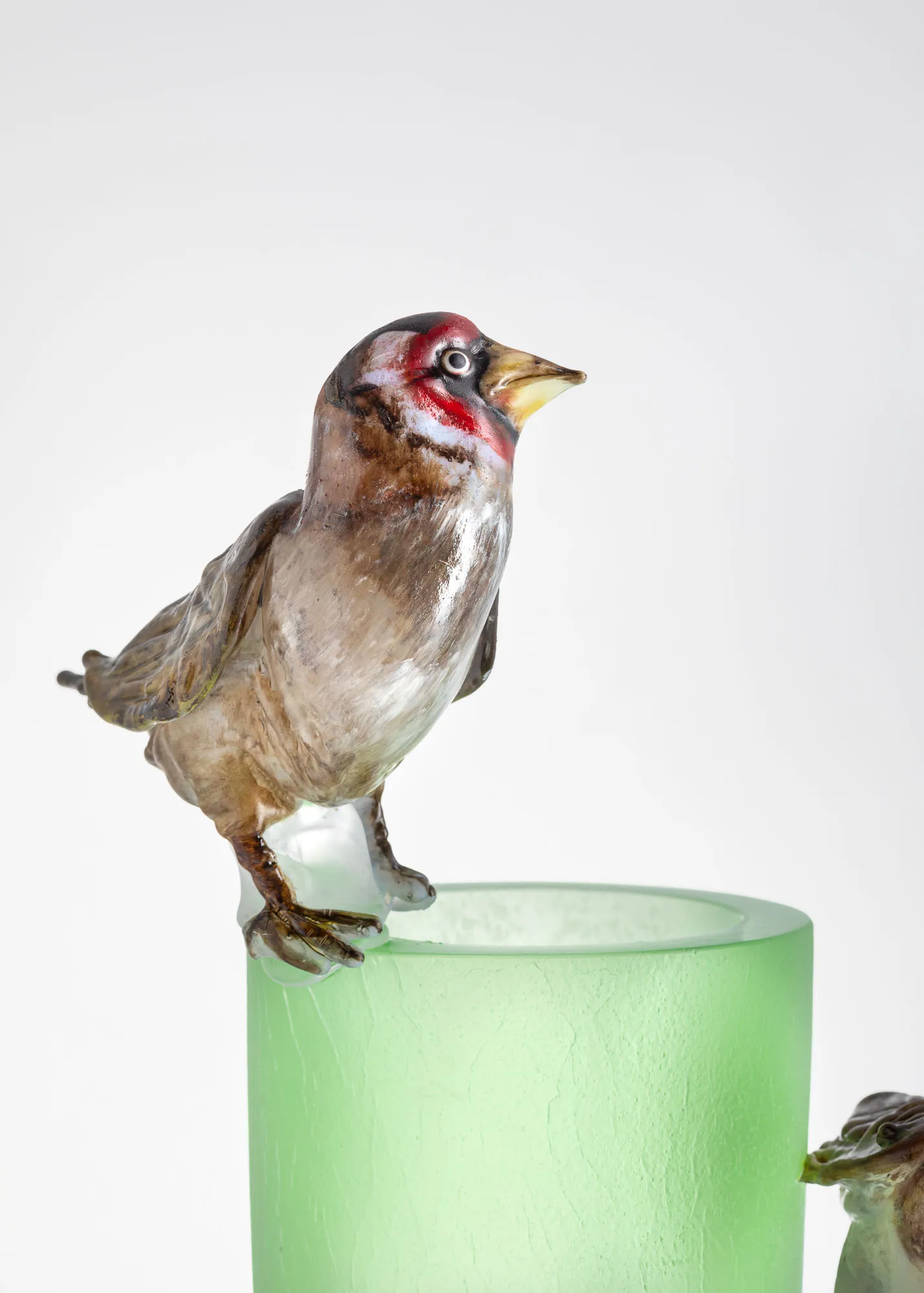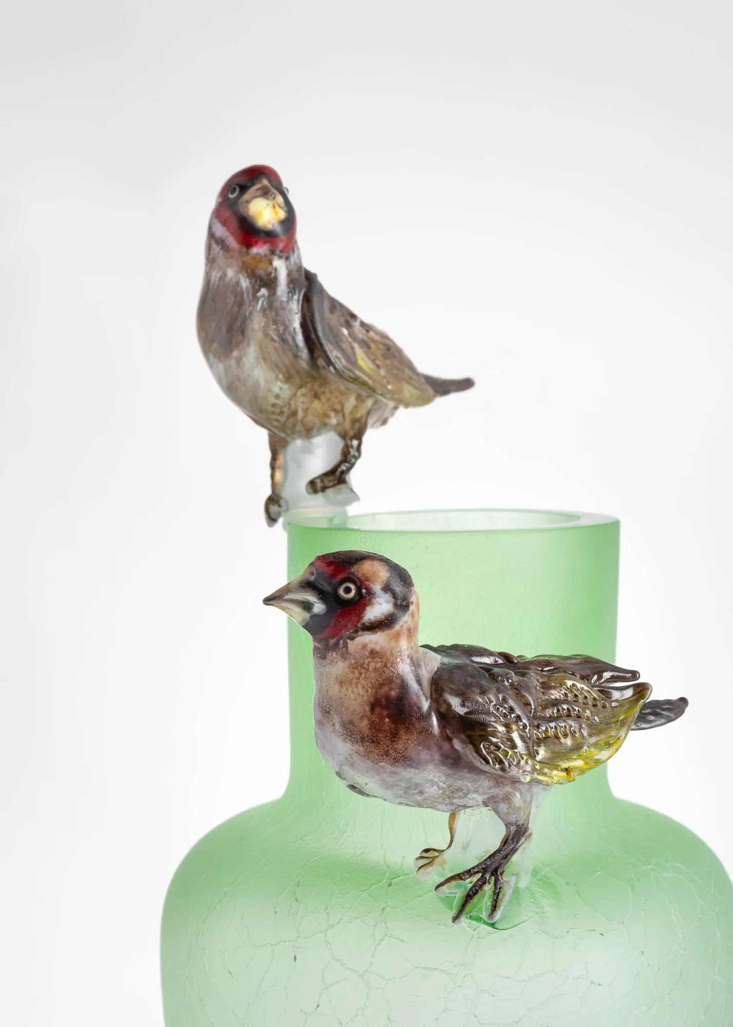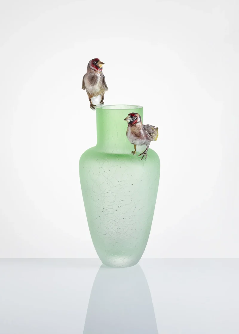 In the Feather Animals collection, I was inspired by endangered bird species found in the Czech Republic. Birds such as the hawfinch, the goldfinch, the blue tit and others are perched on the surface of the vases. The vases themselves are based on my significant Garden collection. For Feather Animals, I chose a cracked surface for the vases with subtle color transitions evoking the individual seasons. The fine web of cracks even more strongly thematizes the fragility and vulnerability of the natural environment.
