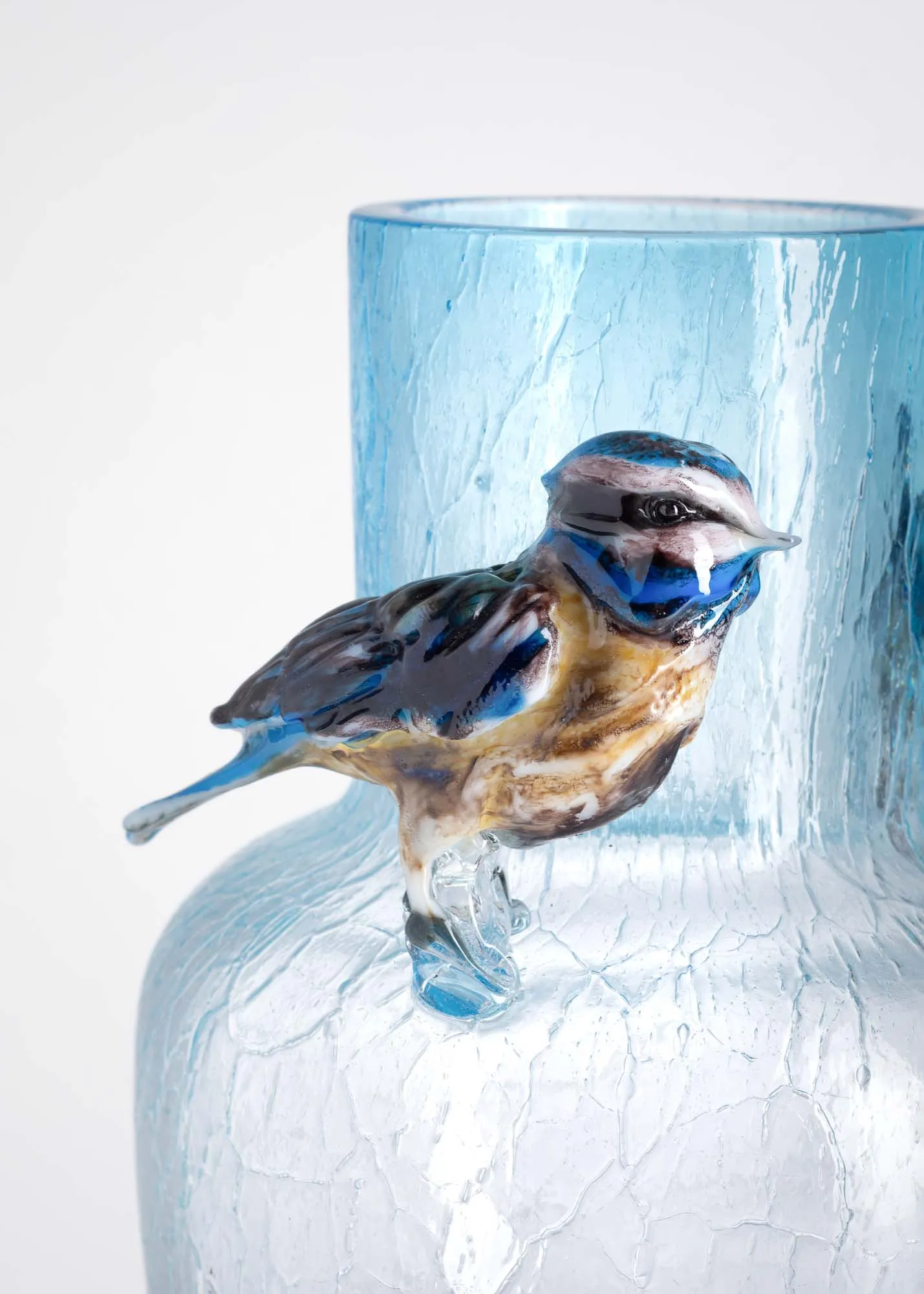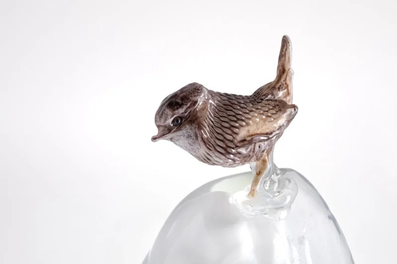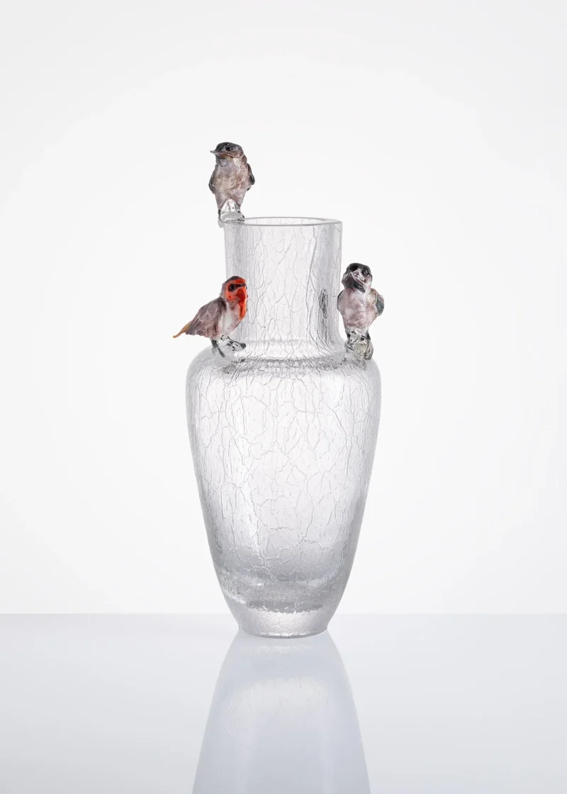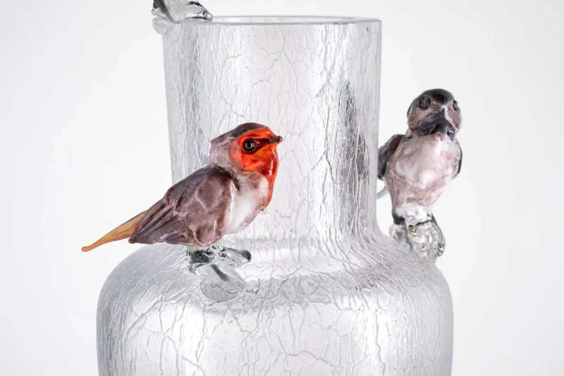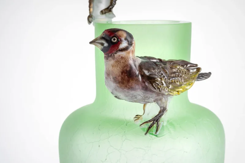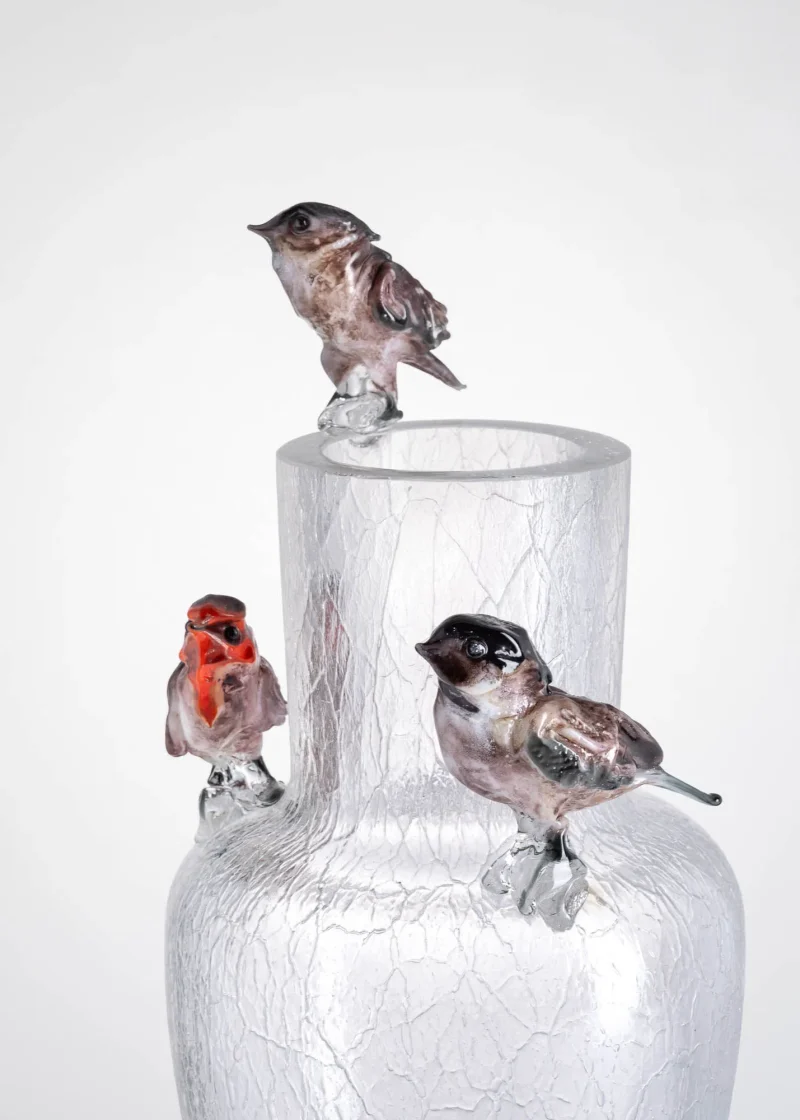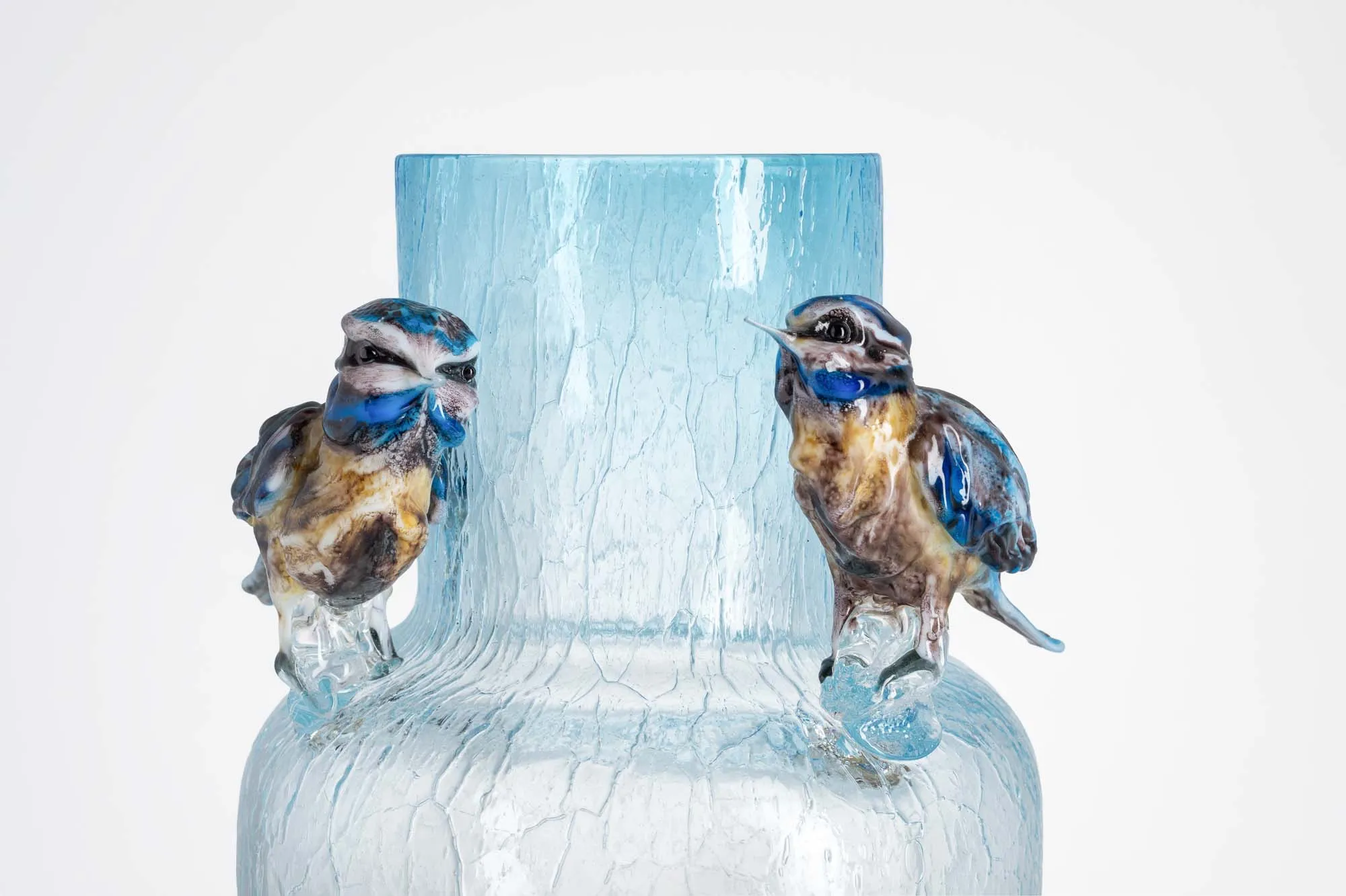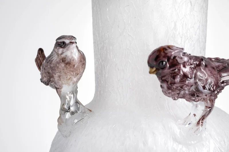 A delicate, cracked collectible vase-object with hot-glass modeled and hand-painted birds made of opaline glass.