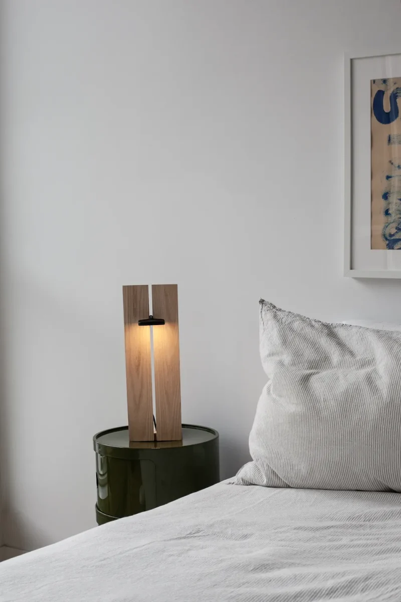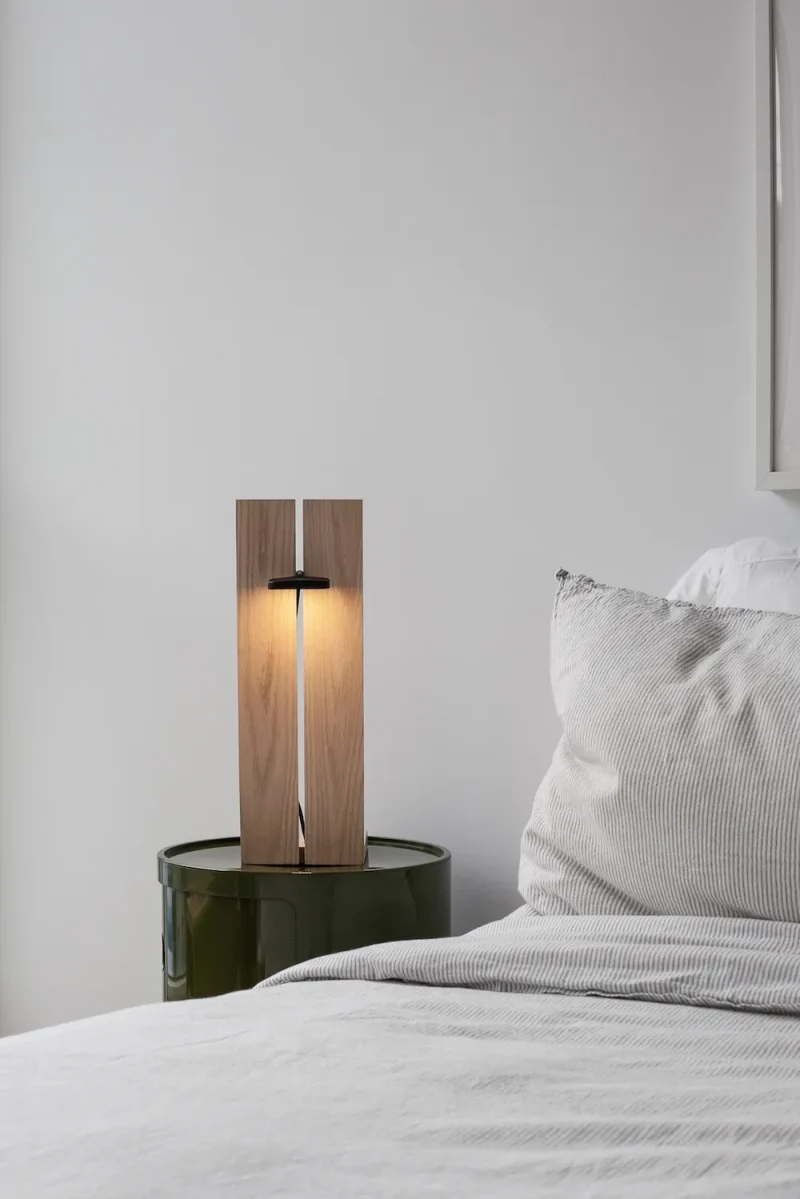 The Fence Light by Canadian designer, Calen Knauf, is an eclectic, sculptural yet adjustable table light. The Fence features a minimalist oak base and vertical uprights that hold the luminaire at a desired height and angle. The protruding head is pleasant to the touch, inviting the user to move and tilt it within the slot between the uprights. The power cable emerges from the base and gracefully curves upwards, disappearing into the luminaire like the stalk of a budding plant.