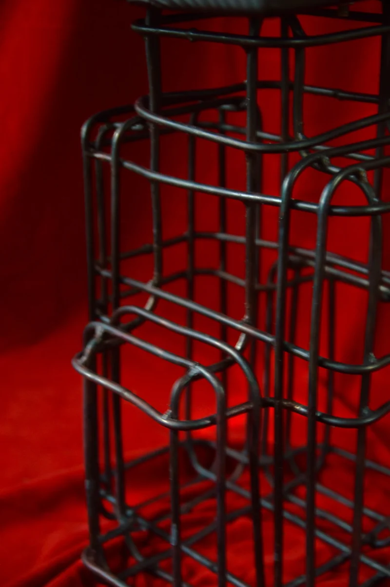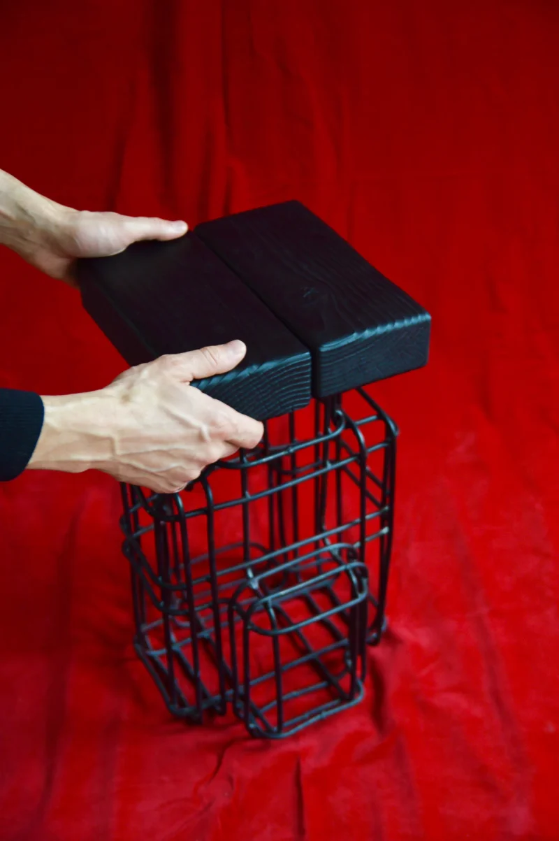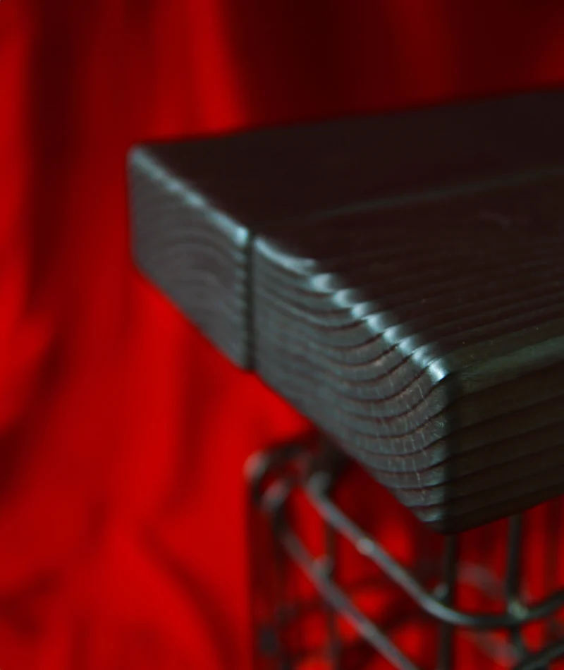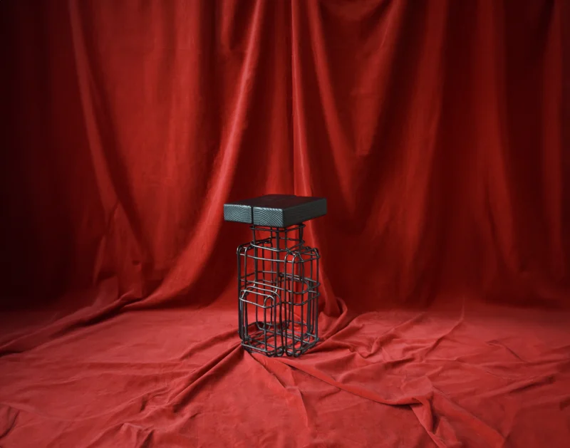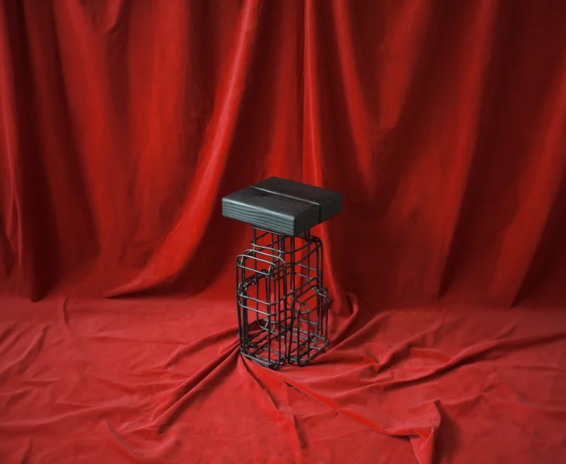 Our process begins with wooden forms wrapped in metal, which are then burned to create the hollow steel mesh structures. The resulting pieces retain the raw traces of fire, capturing its unpredictable patterns while integrating steel frameworks for stability. This method and approach builds on the experimental works of artists and designers such as Mona Hatoum, Tuomas Markunpoika, Takt Project, Shiro Kuramata, each referencing Josef Hoffmann, who each explore material deconstruction and procedural transformation in their work.