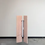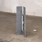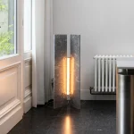 The FL50 floor lamps start from salvaged pieces of natural stone, used in a previous life as window sills or in danger of ending up in a dumpster somewhere. Based on HITCH’s circular connectors, we designed a support structure in stainless steel, into which the stones are now clamped. This structure also carries a tube light which illuminates both the stones and the space around them.