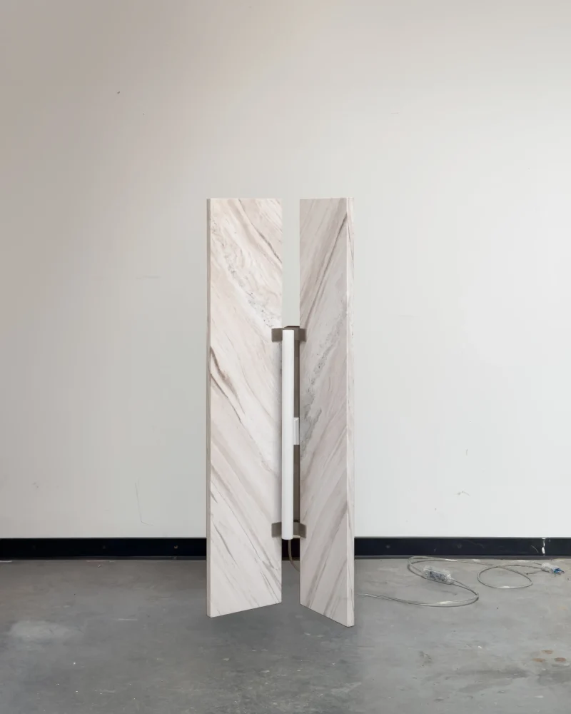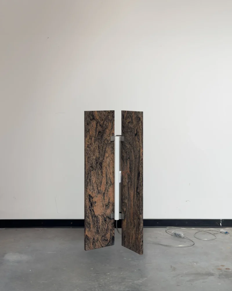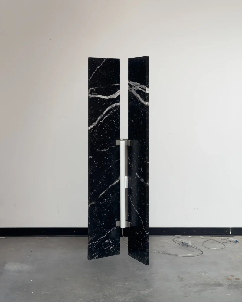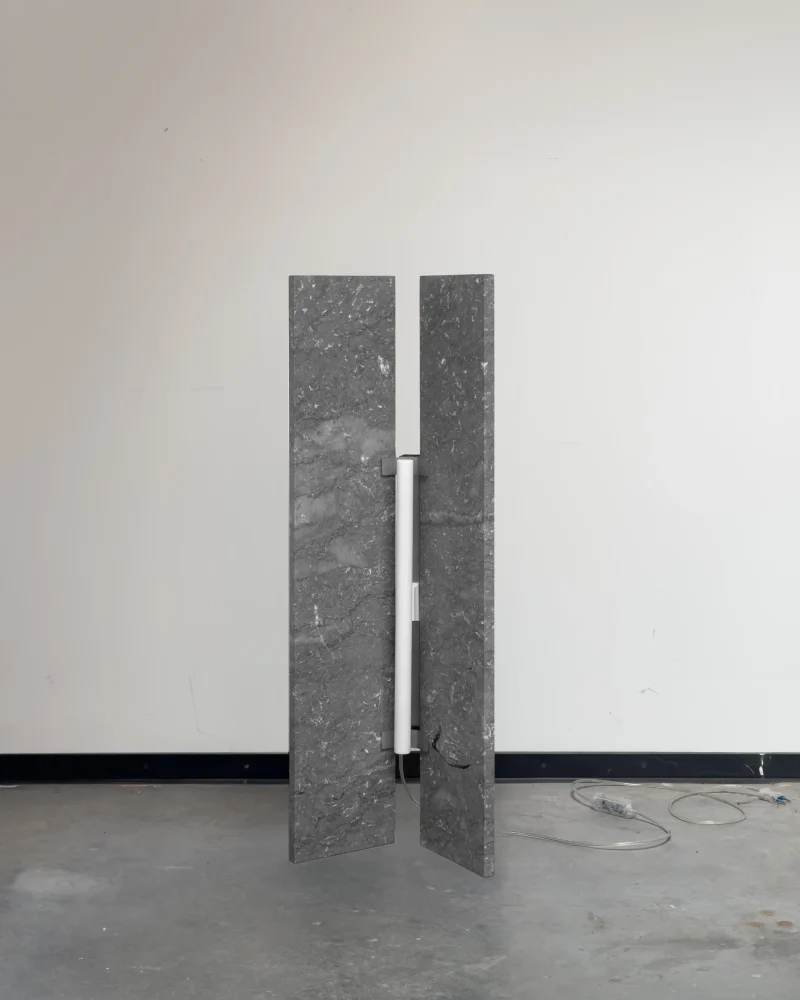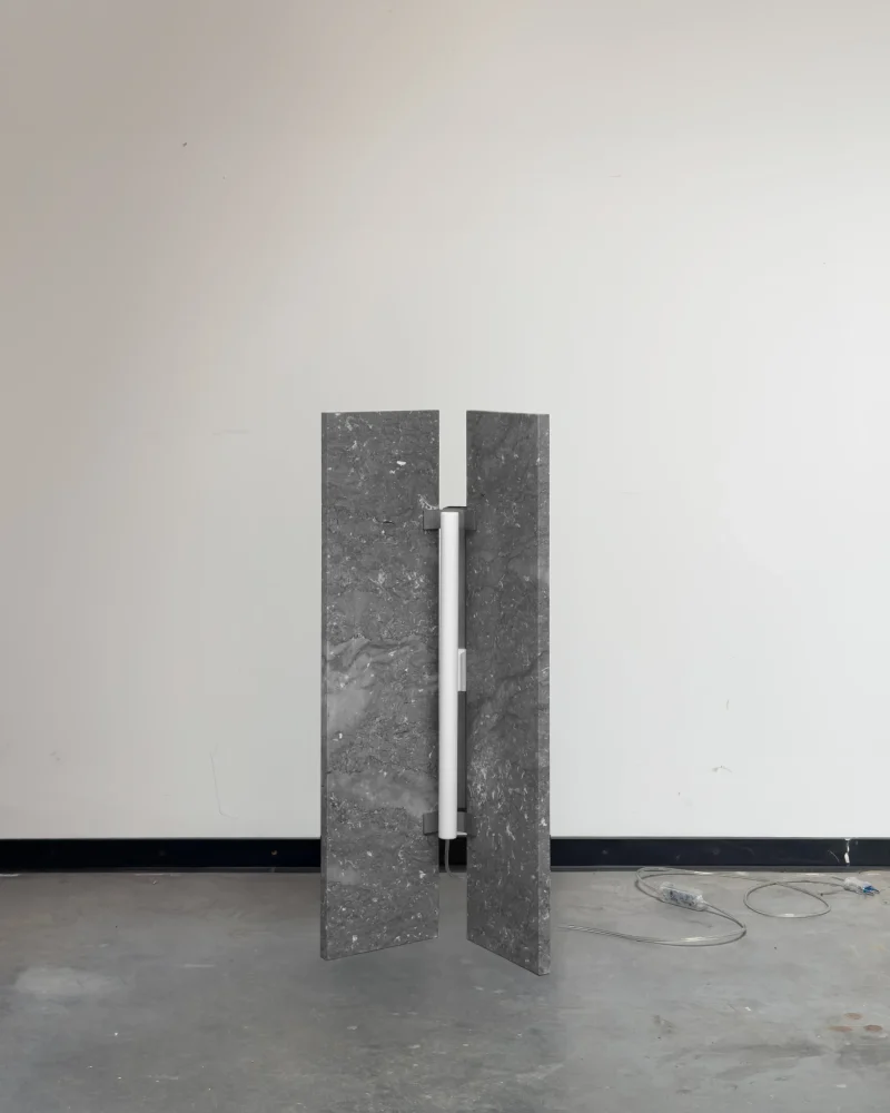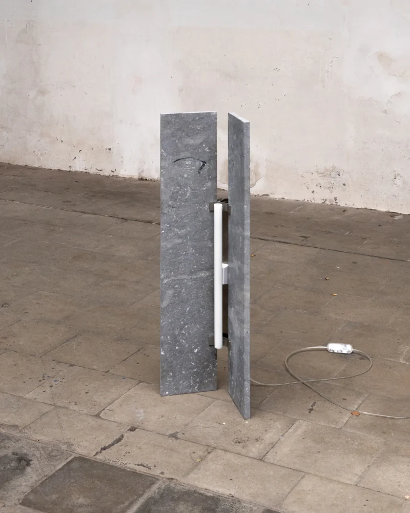 The FL50 floor lamps start from salvaged pieces of natural stone, used in a previous life as window sills or in danger of ending up in a dumpster somewhere. Based on HITCH’s circular connectors, we designed a support structure in stainless steel, into which the stones are now clamped. This structure also carries a tube light which illuminates both the stones and the space around them.