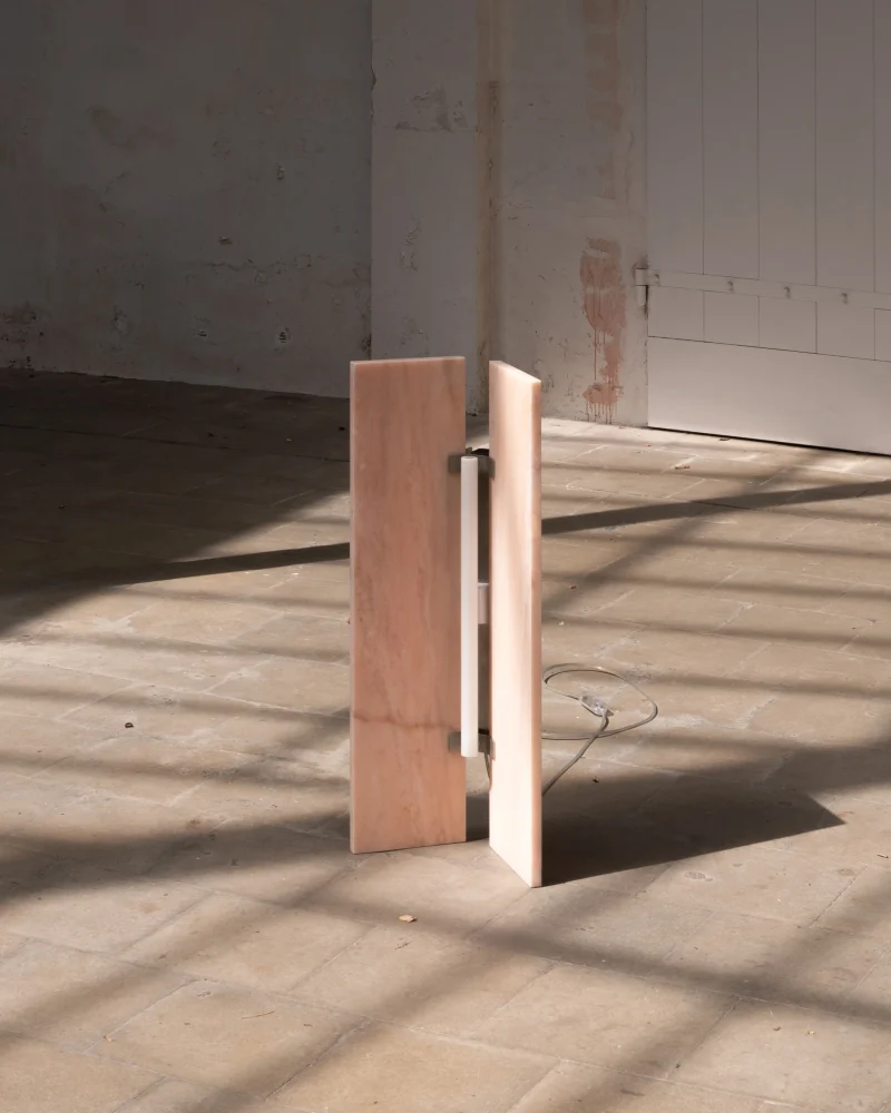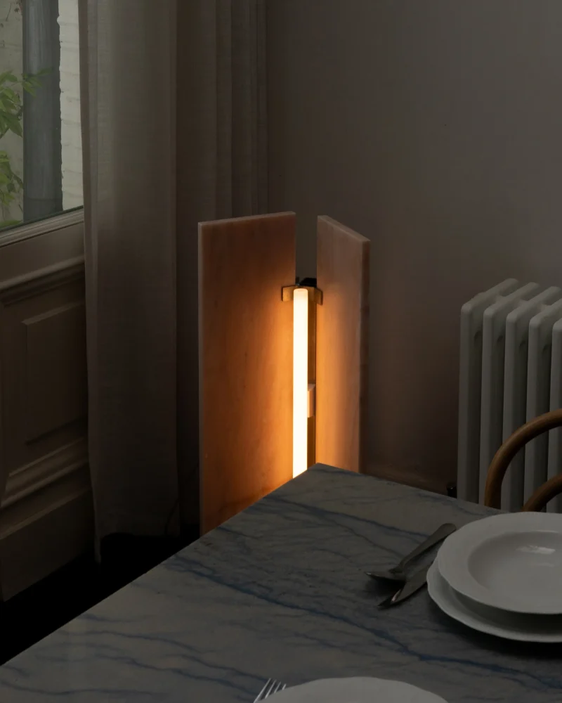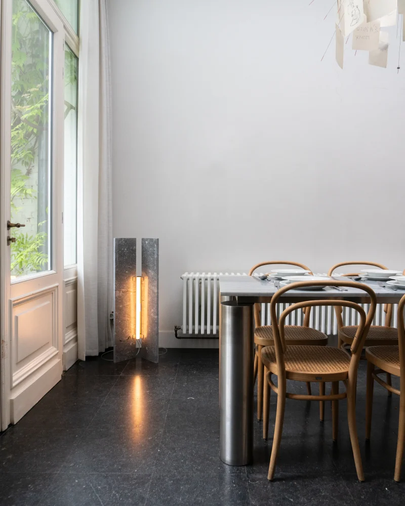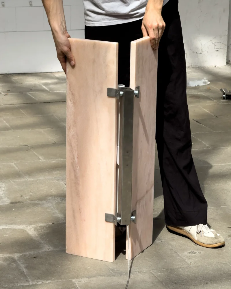 The stones thus become more than they were before. They do not lie in mortar or hang glued to a support but stand proudly upright and carry the structure that sheds light on their natural beauty. In this, they are unusually “independent”, as most designs that use stone tend to fixate them to other materials. For us, that independence is crucial, since it also ensures that the stones can have other future lives. With nothing more than a screwdriver the pieces can be detached again without any damage to the stone.