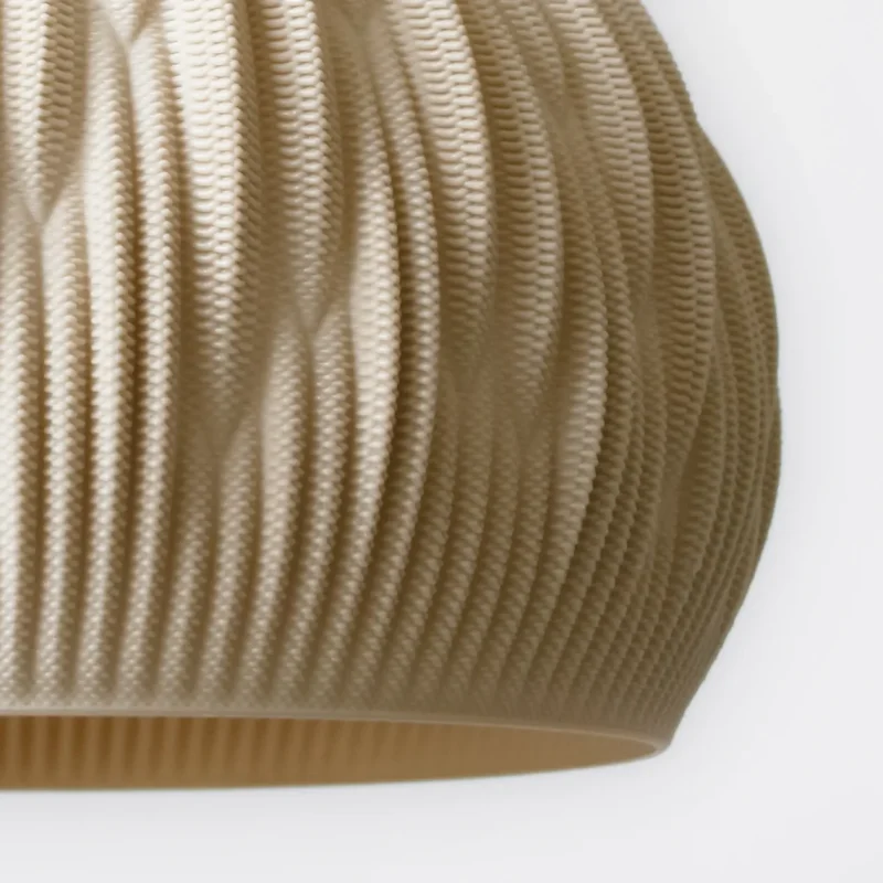 With an overall volume embodying the essence of a water drop, the Flax lampshade pays homage to the flax plants’ remarkable adaptability to thrive with minimal water resources. A bouquet of refined protuberances evoking flax leaves elegantly grace its surface contributing to the lampshade’s durability through intricate folds that enhance structural robustness.