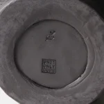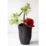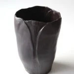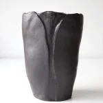 Handbuilt from black stoneware. Unglazed, hand-polished exterior with subtle glazed accents; transparent glaze inside. Fired at 1250°C. Waterproof and suitable for fresh flowers.