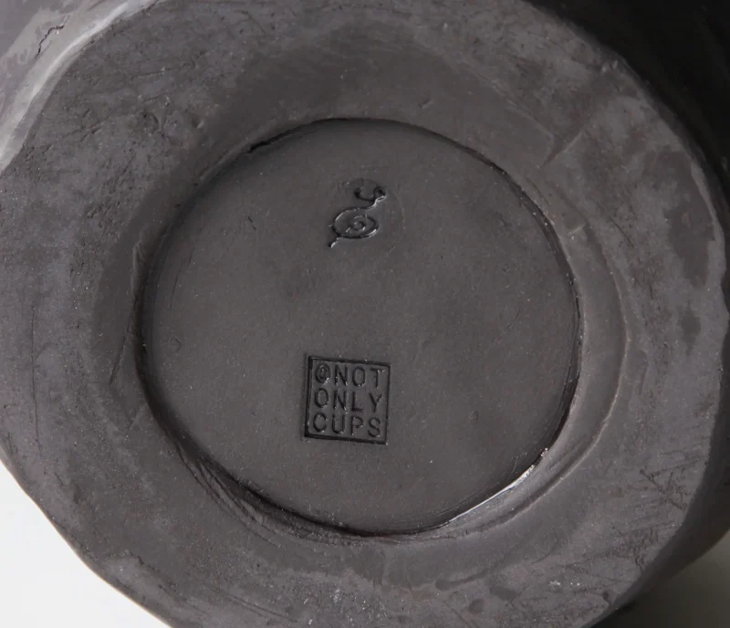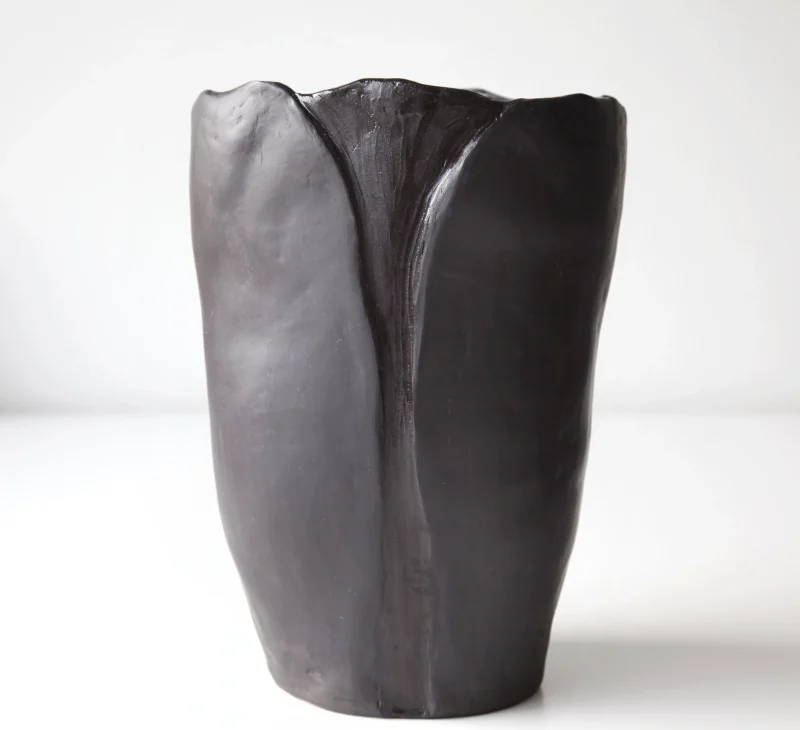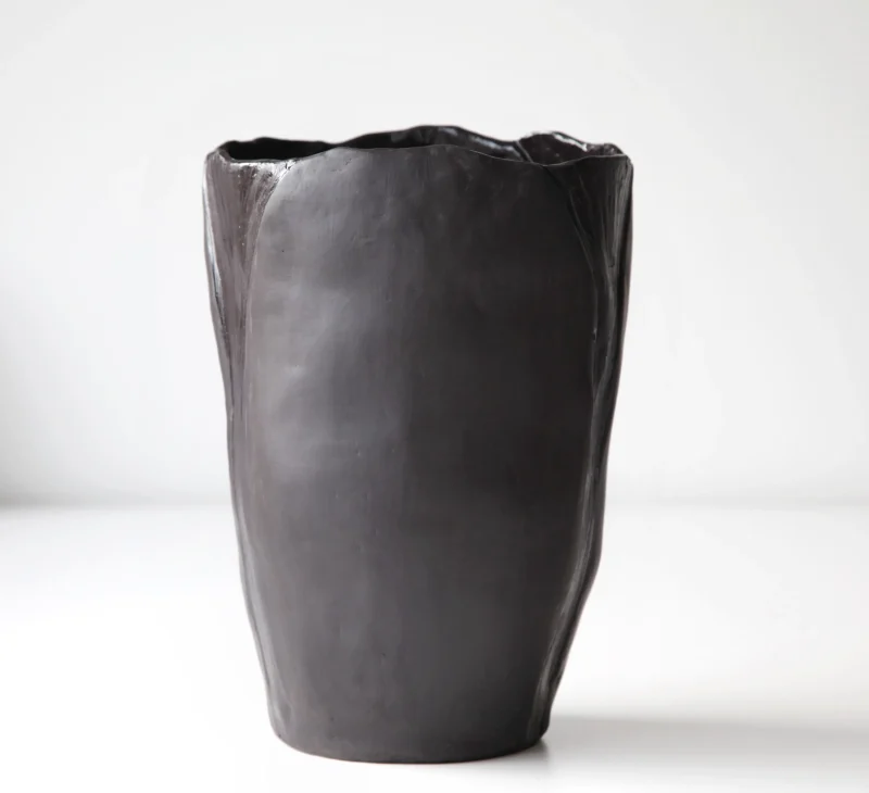 Handbuilt from black stoneware. Unglazed, hand-polished exterior with subtle glazed accents; transparent glaze inside. Fired at 1250°C. Waterproof and suitable for fresh flowers.