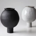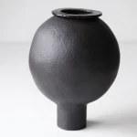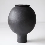 Handbuilt from black stoneware, the vase has an intentionally organic, imperfect shape. The surface is left unglazed, emphasising the material’s depth and tactility, while subtle irregularities in the form avoid a sense of artificial perfection. The piece balances between abstraction and a recognisable natural reference.