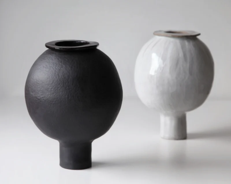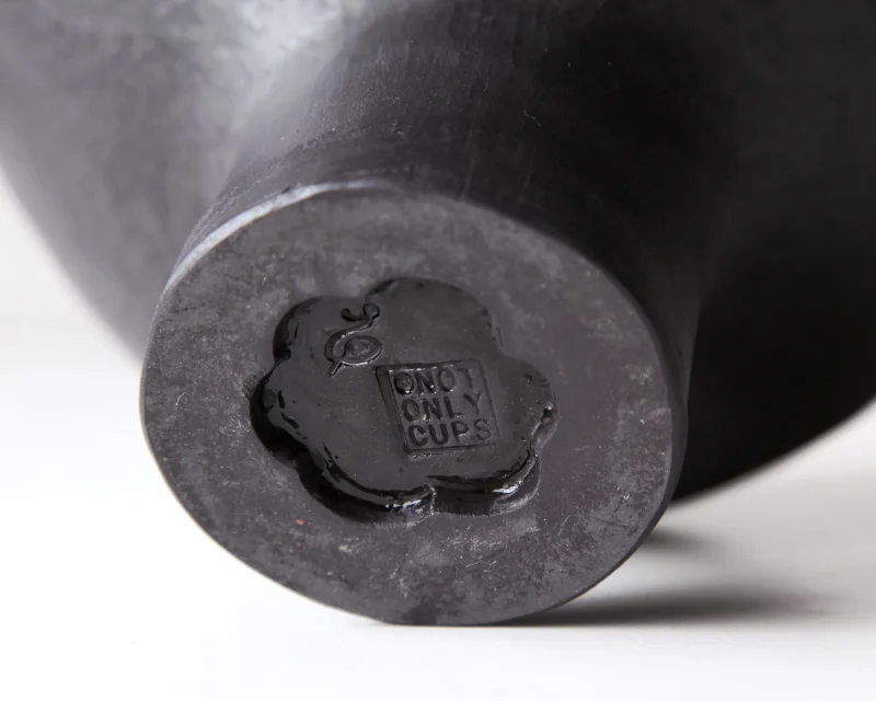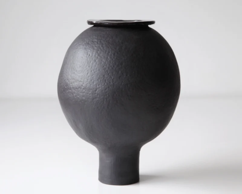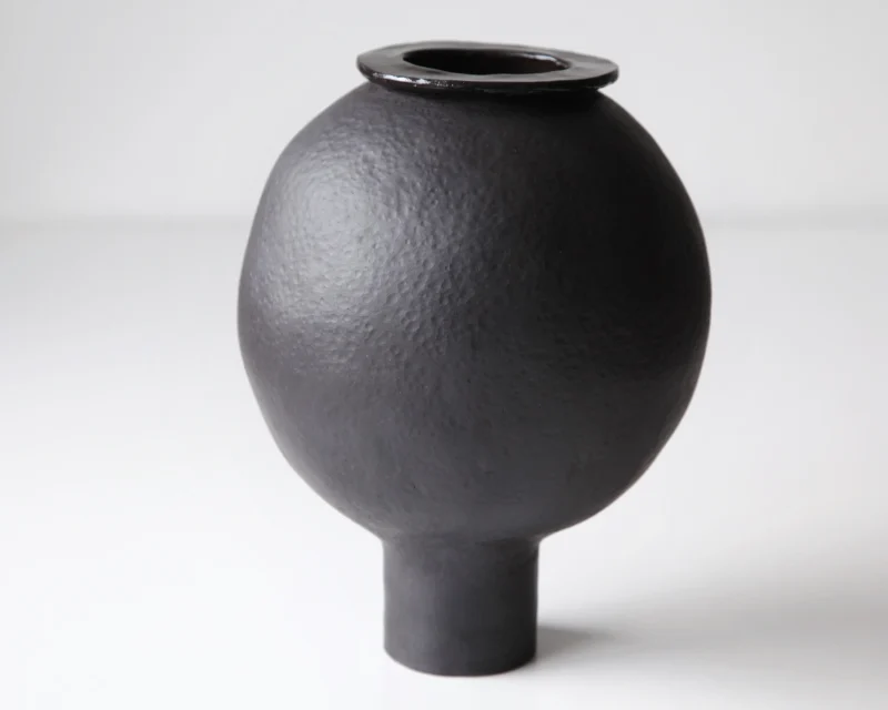 Handbuilt from black stoneware, the vase has an intentionally organic, imperfect shape. The surface is left unglazed, emphasising the material’s depth and tactility, while subtle irregularities in the form avoid a sense of artificial perfection. The piece balances between abstraction and a recognisable natural reference.