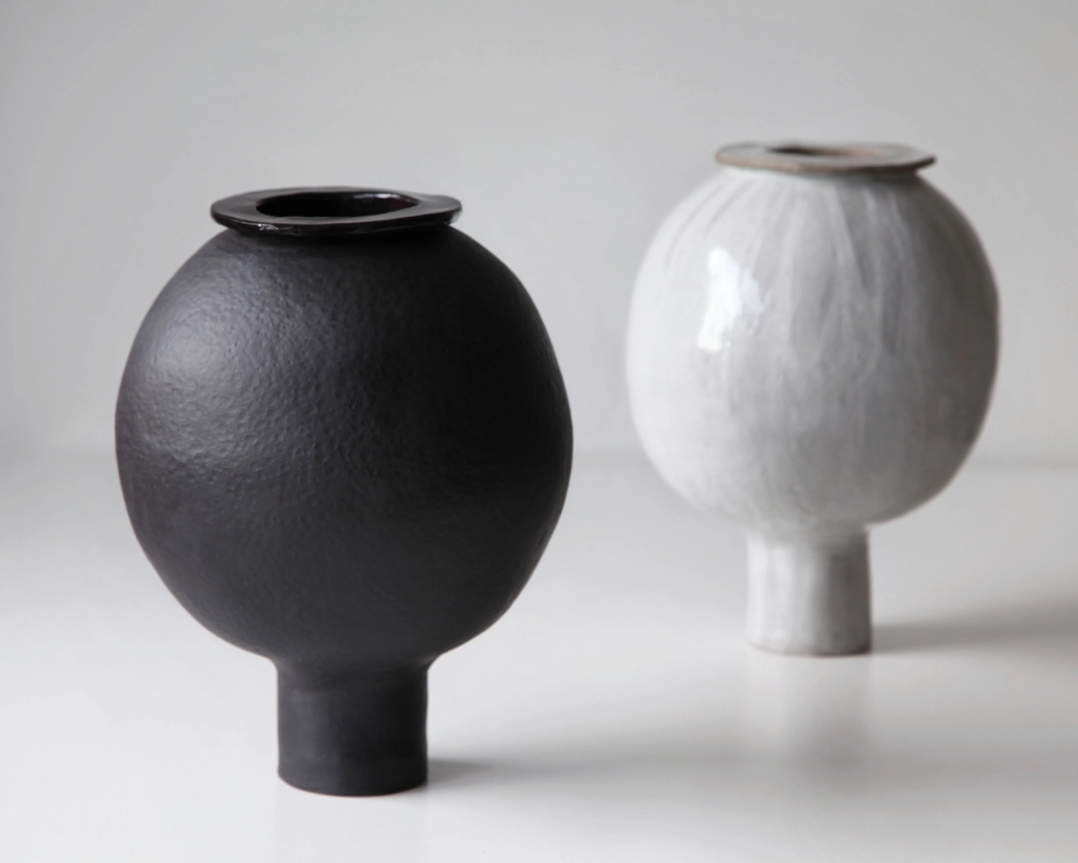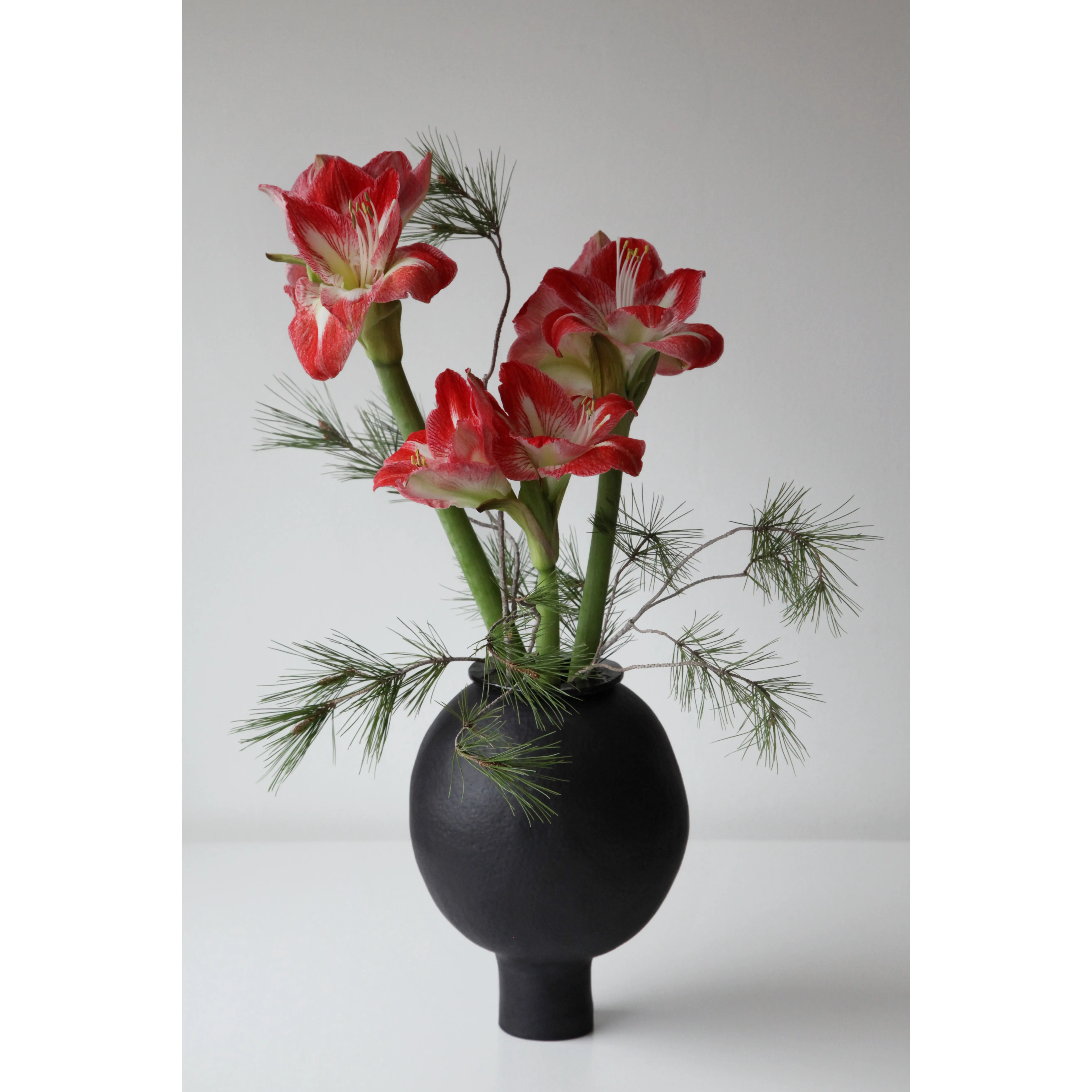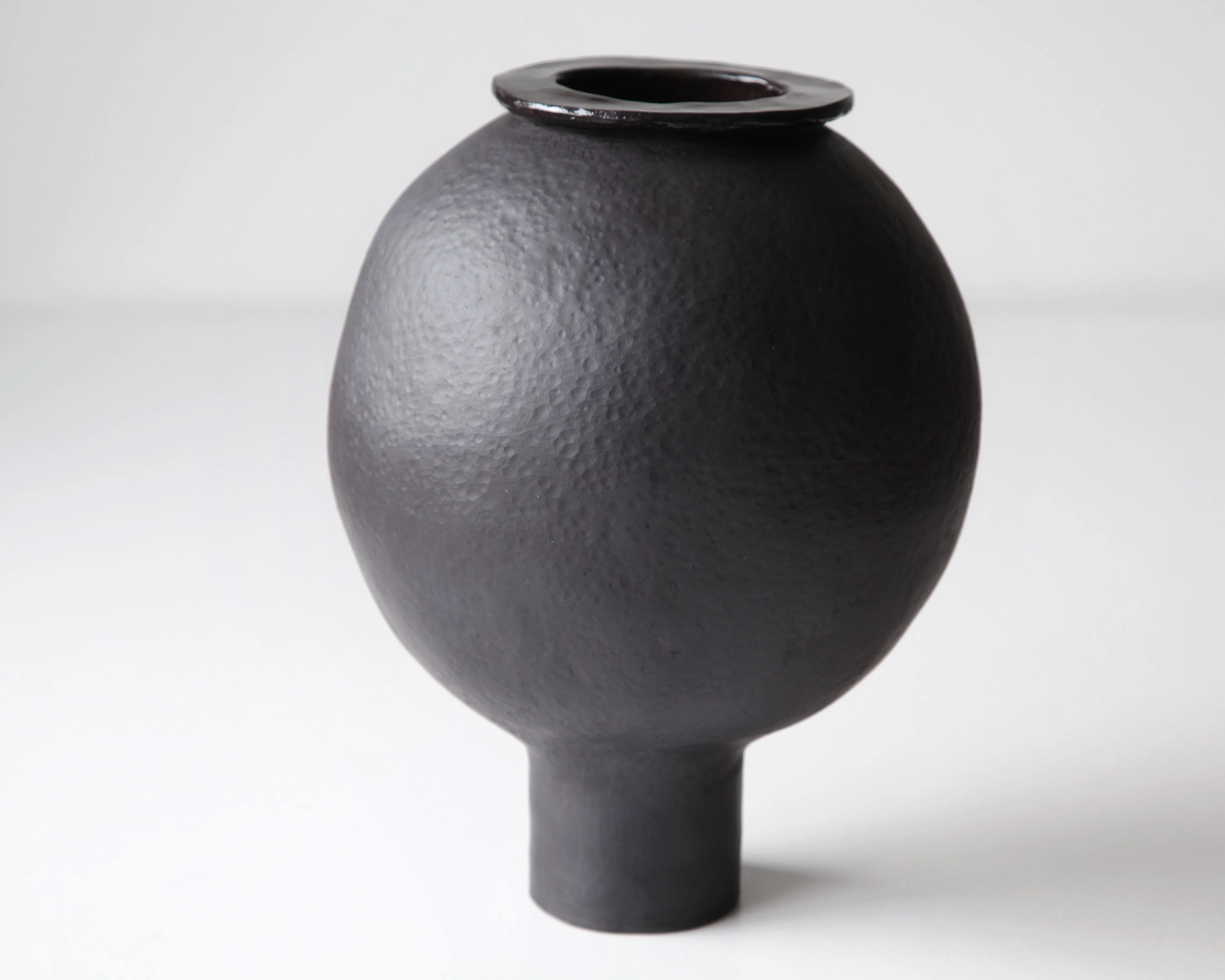 Handbuilt from black stoneware. Unglazed, hand-polished exterior with subtle glazed accents; transparent glaze inside. Fired at 1250°C. Waterproof and suitable for fresh flowers.