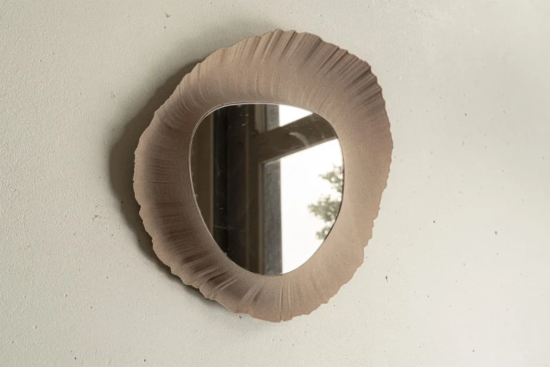 This piece features 3d printed natural sand, freezing free-flow motion into a still sculptural wall mirror.
