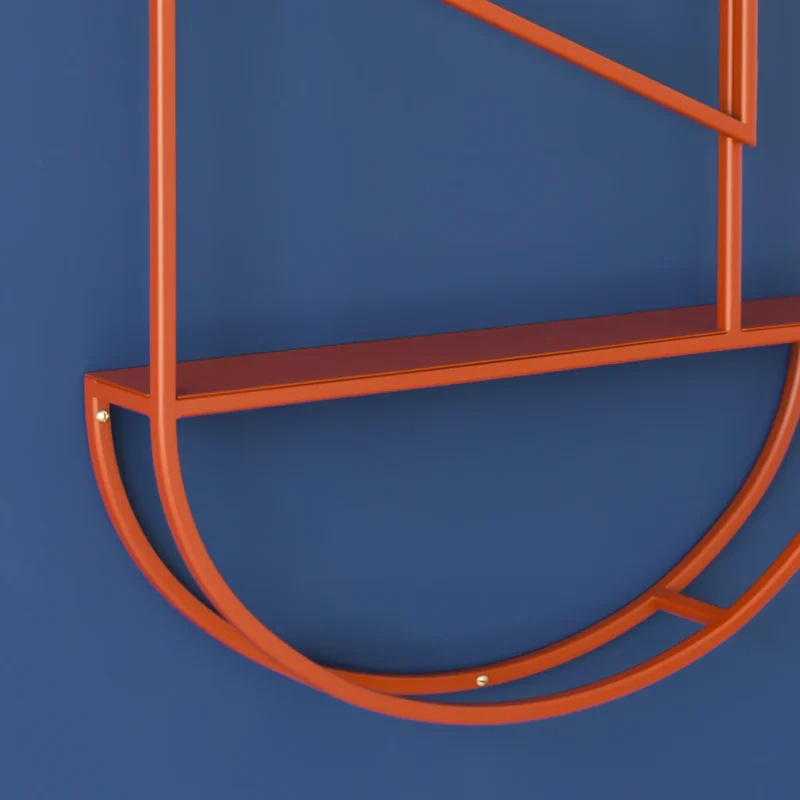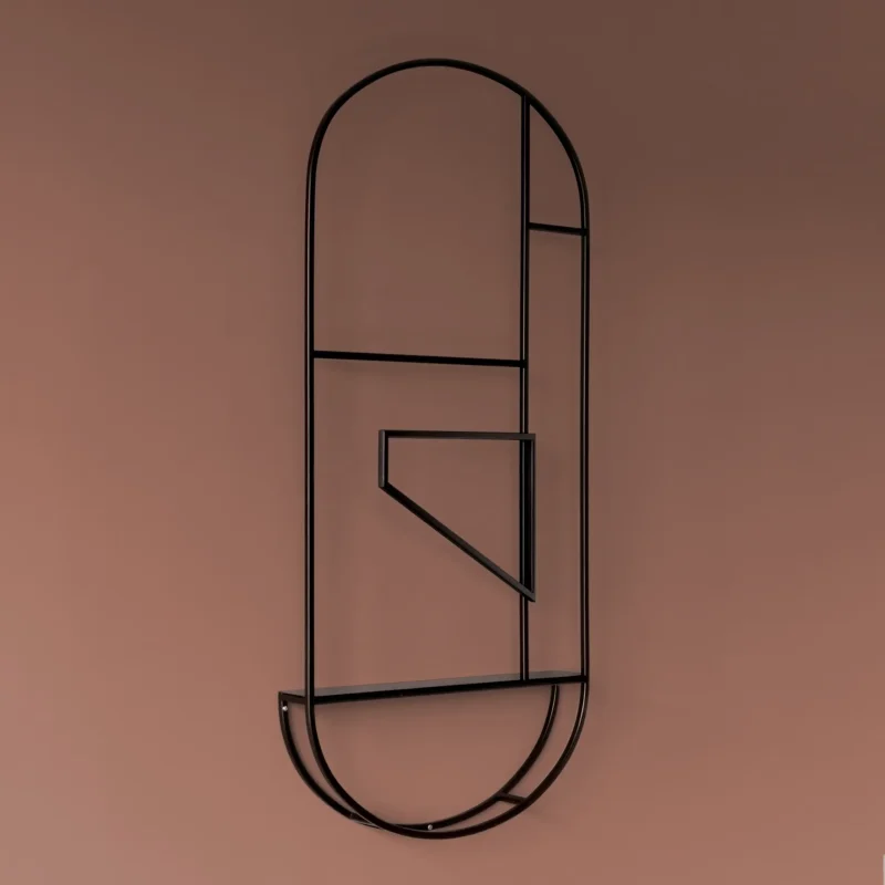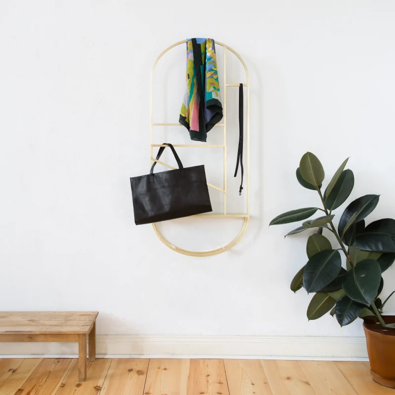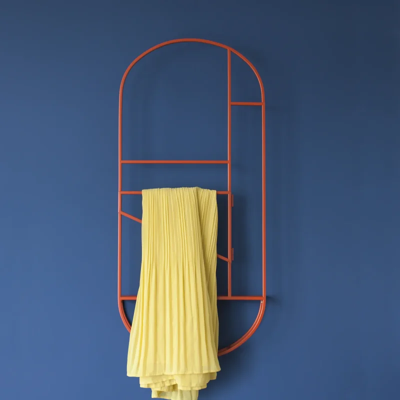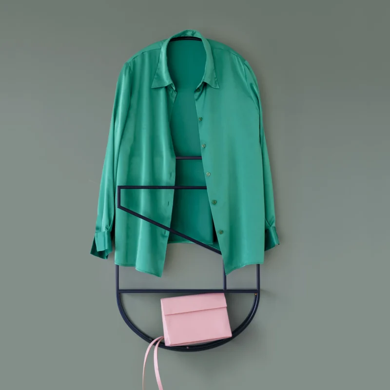 The FOLDWORK VALET is a crossbreed between a wall sculpture, inspired by half-timbered constructions, and a valet stand aka. clothes horse. It hangs on the wall, has a shelf for accessories, an arch for jackets and a hanger which can be folded out to provide more space for clothes.